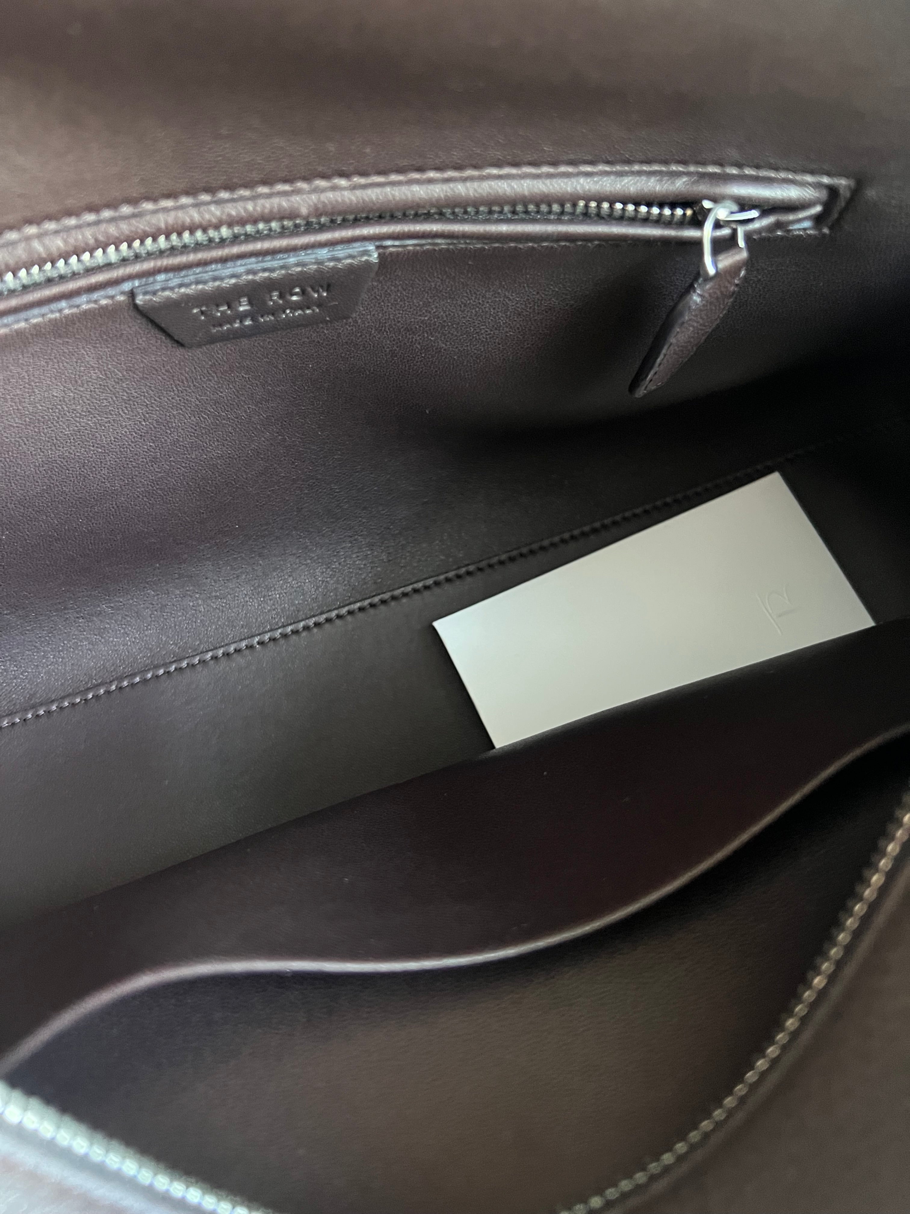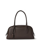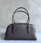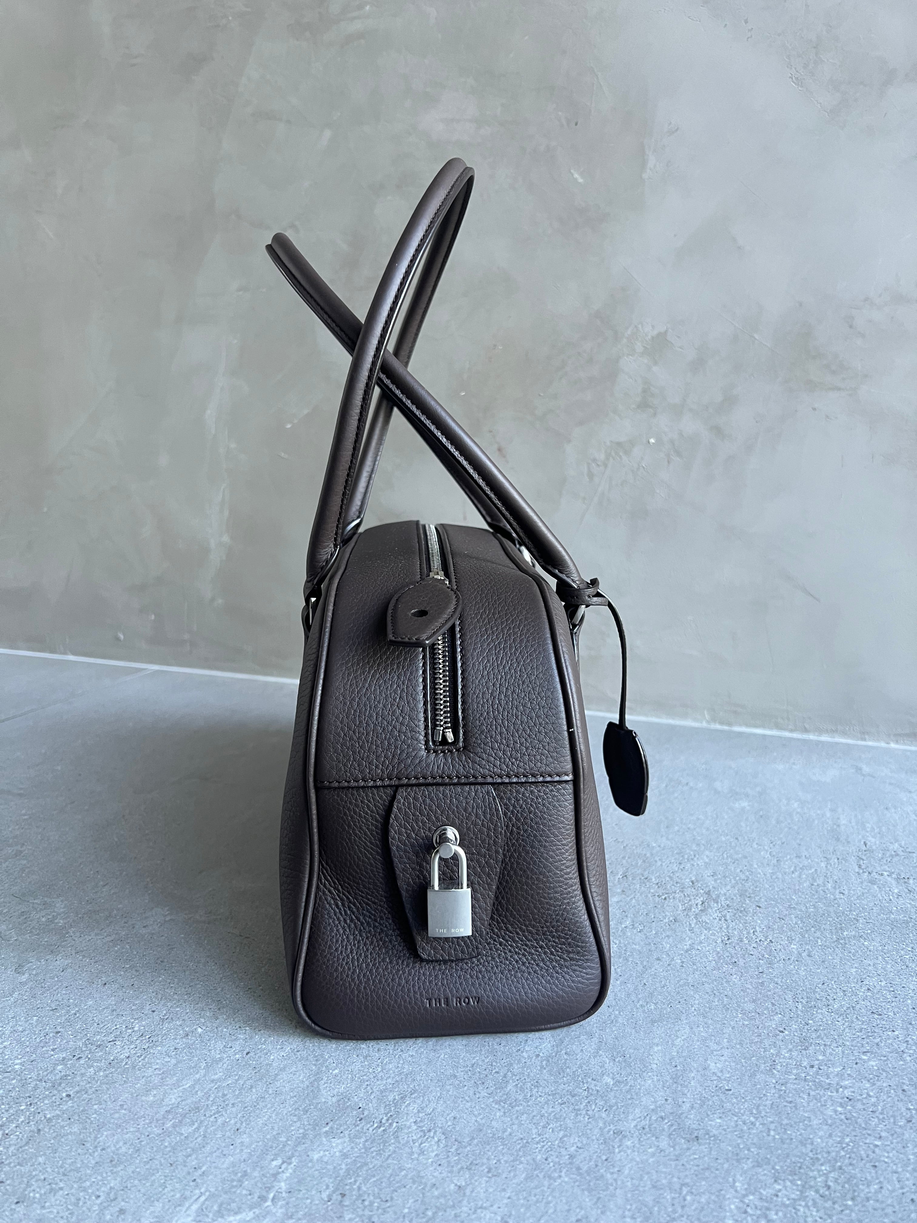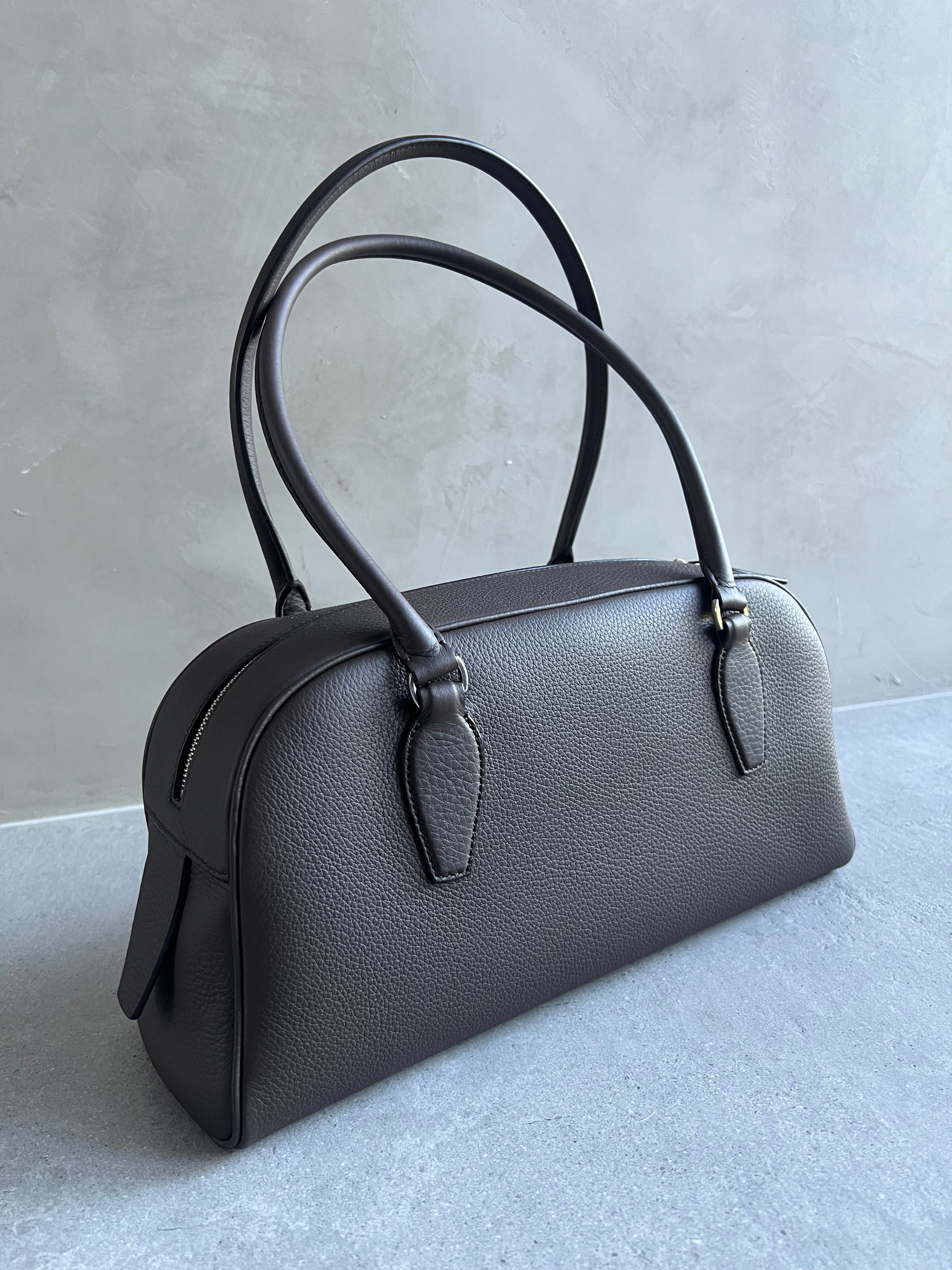 Bowling bag in textured calfskin leather with elongated silhouette, extended tubular handles, piping, branded metal padlock and key, and top zipper closure. Minimally finished, the natural grain surface is left intact, giving the leather a supple hand and refined texture that develops character over time.