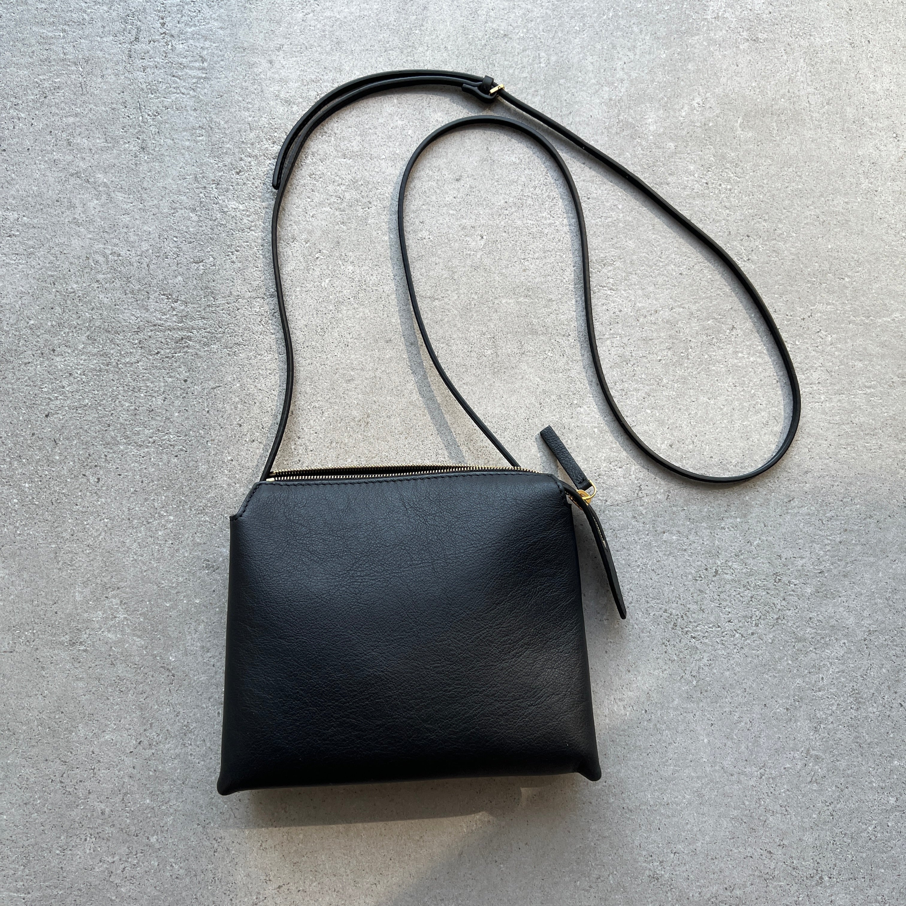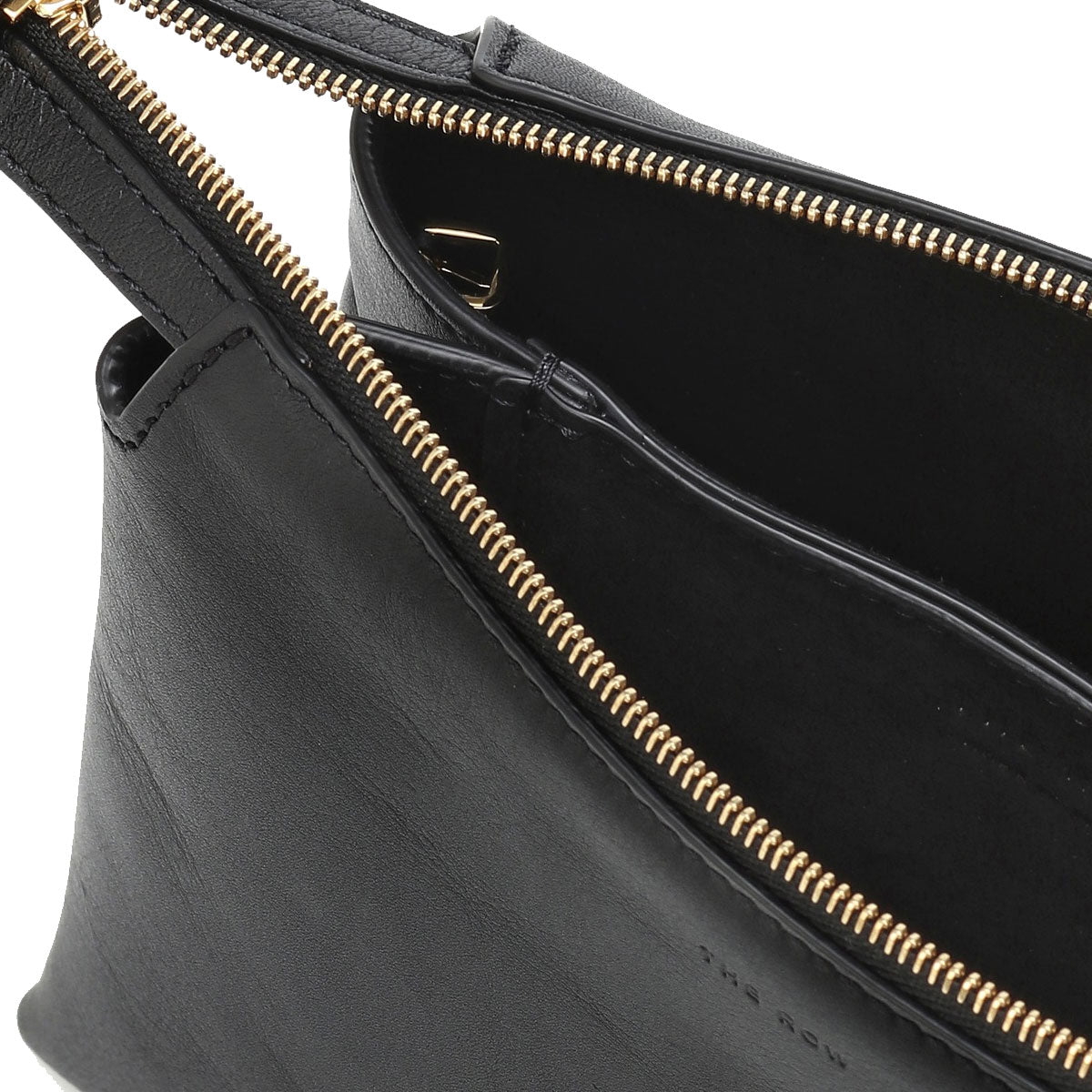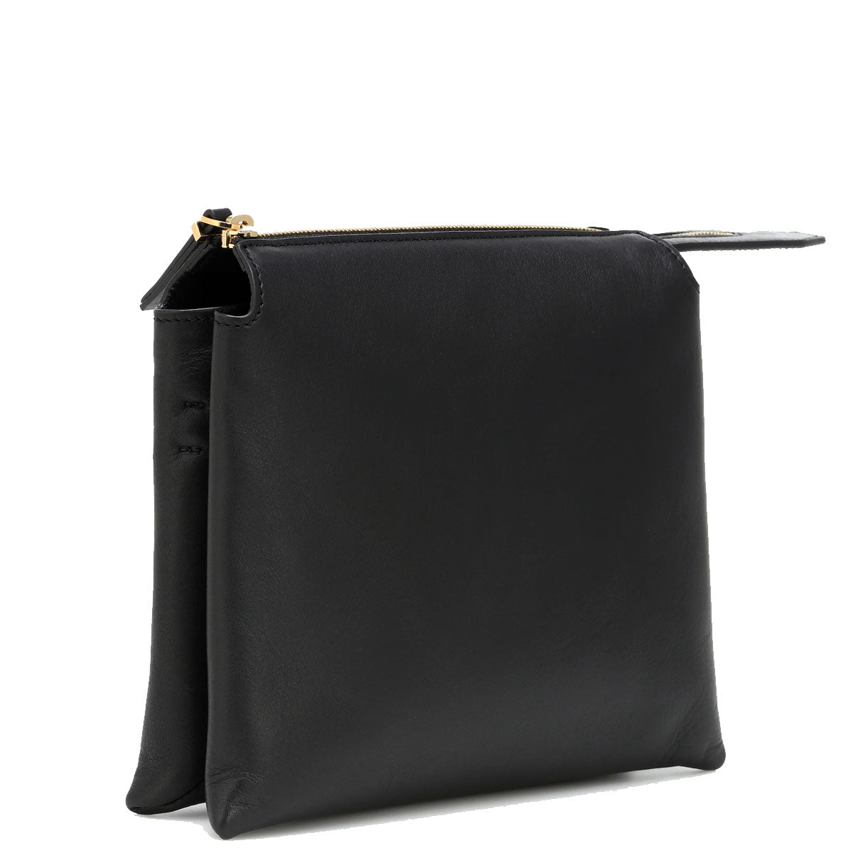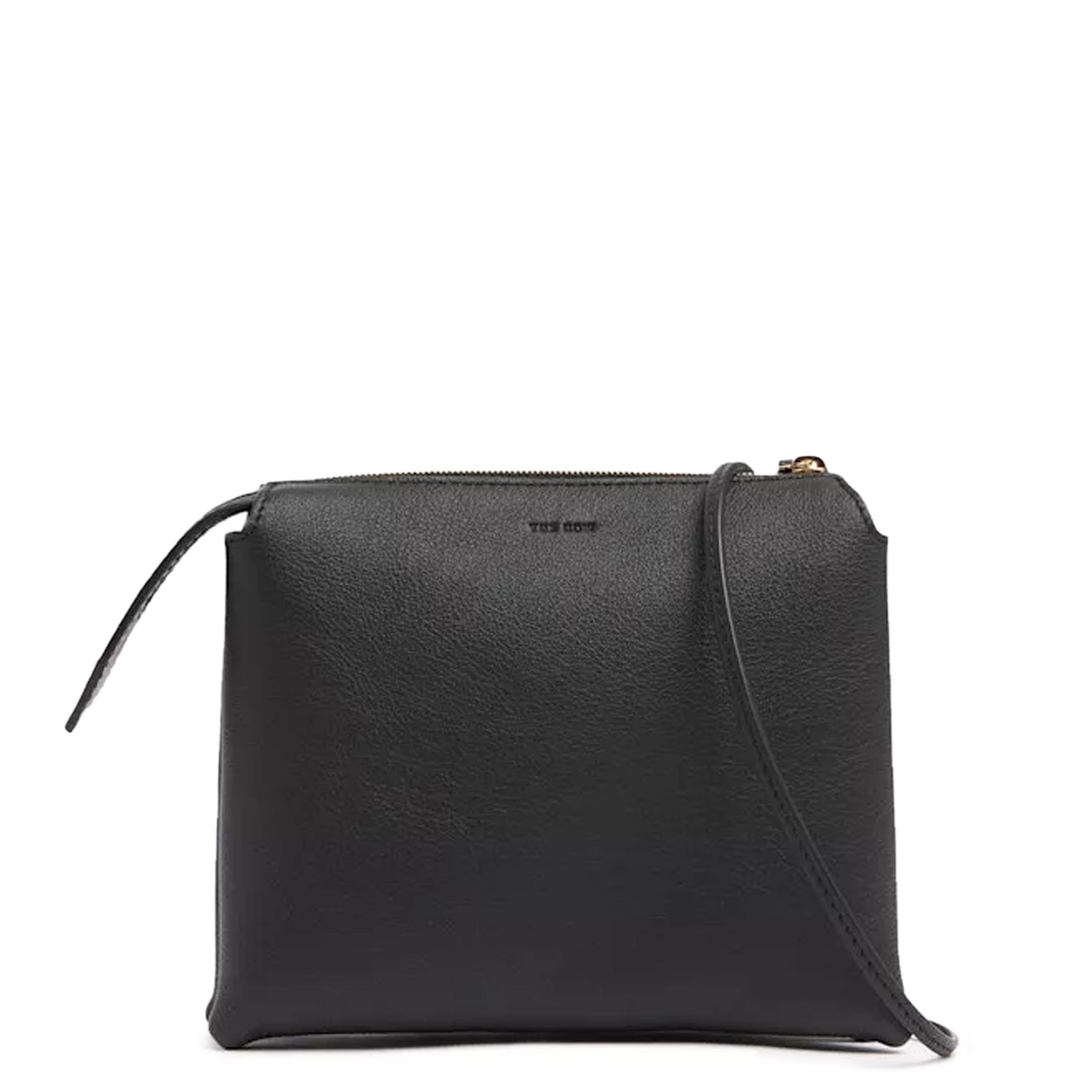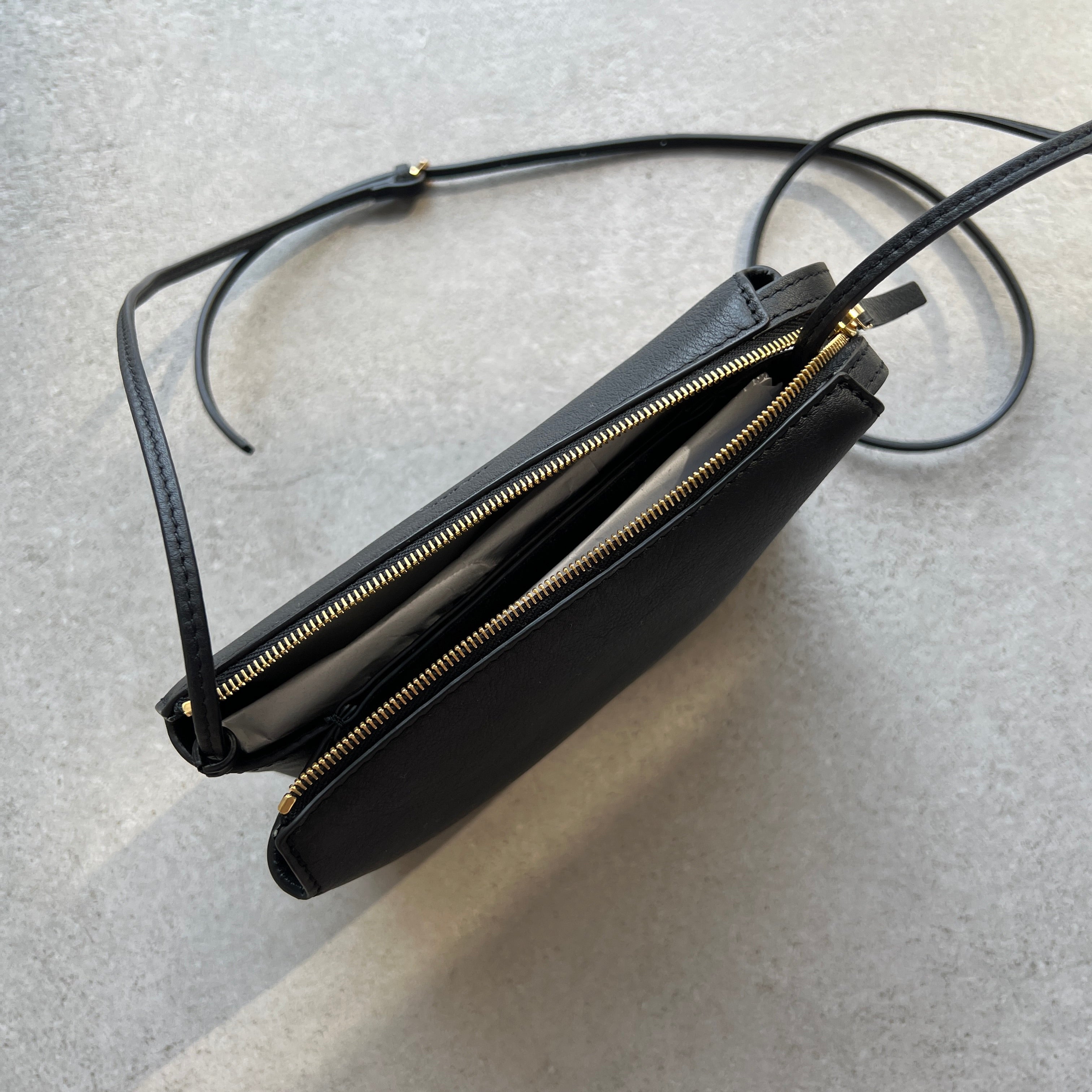 Softly structured shoulder bag in smooth calf skin with seamless construction, removable adjustable shoulder strap and zip top closure. The Nu Twin Mini crossbody bag is a simply shaped two-compartment silhouette crafted from smooth black leather. The style seals with a gold-toned zip at the top and swings from a slender shoulder strap
