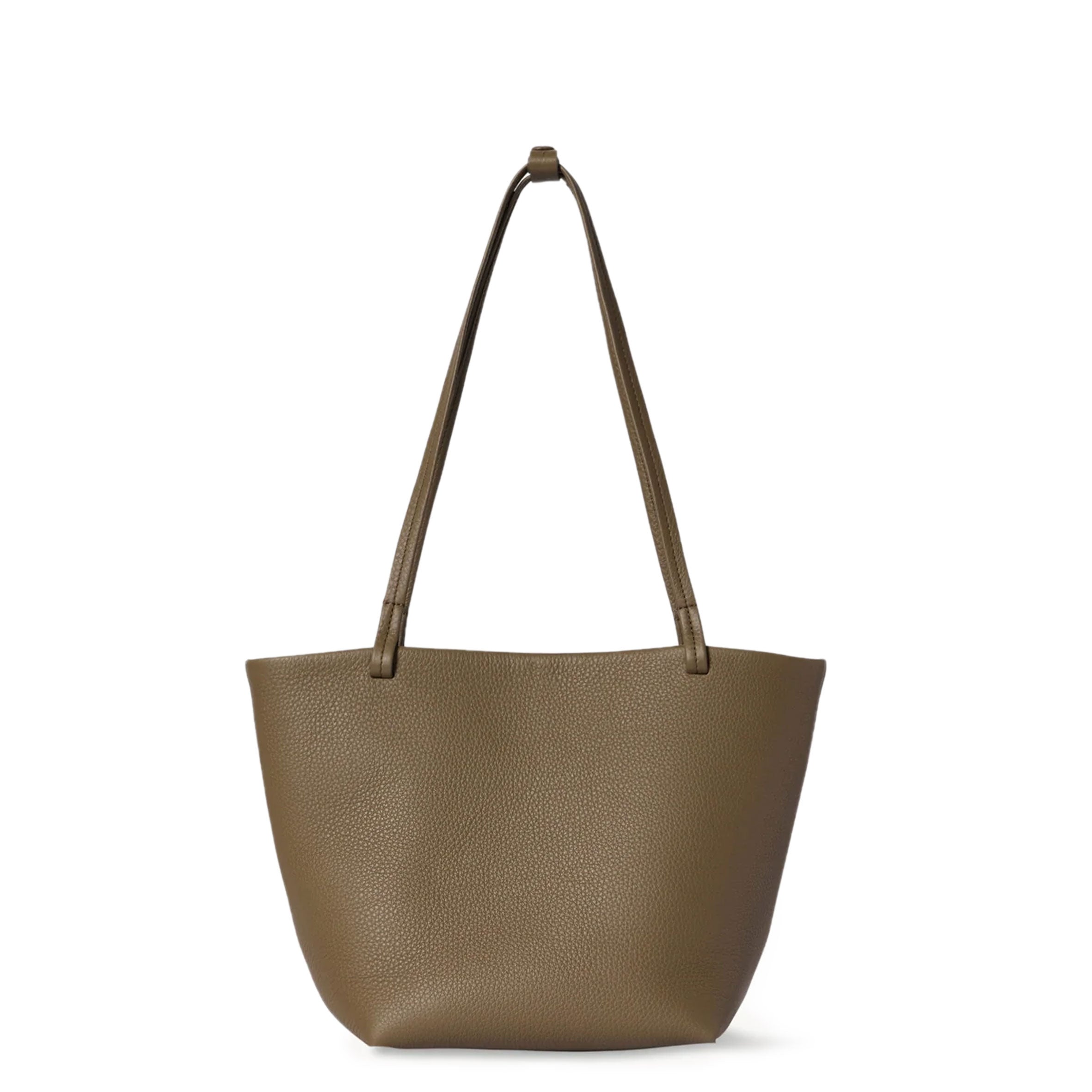 Classic tote bag in textured calfskin leather with interior toggle closure and flat handles. Minimally finished, the natural grain surface is left intact, giving the leather a supple hand and refined texture that develops character over time.