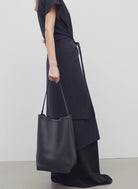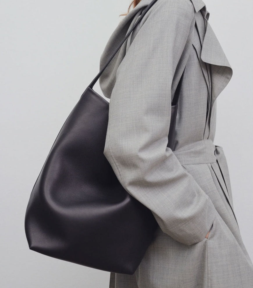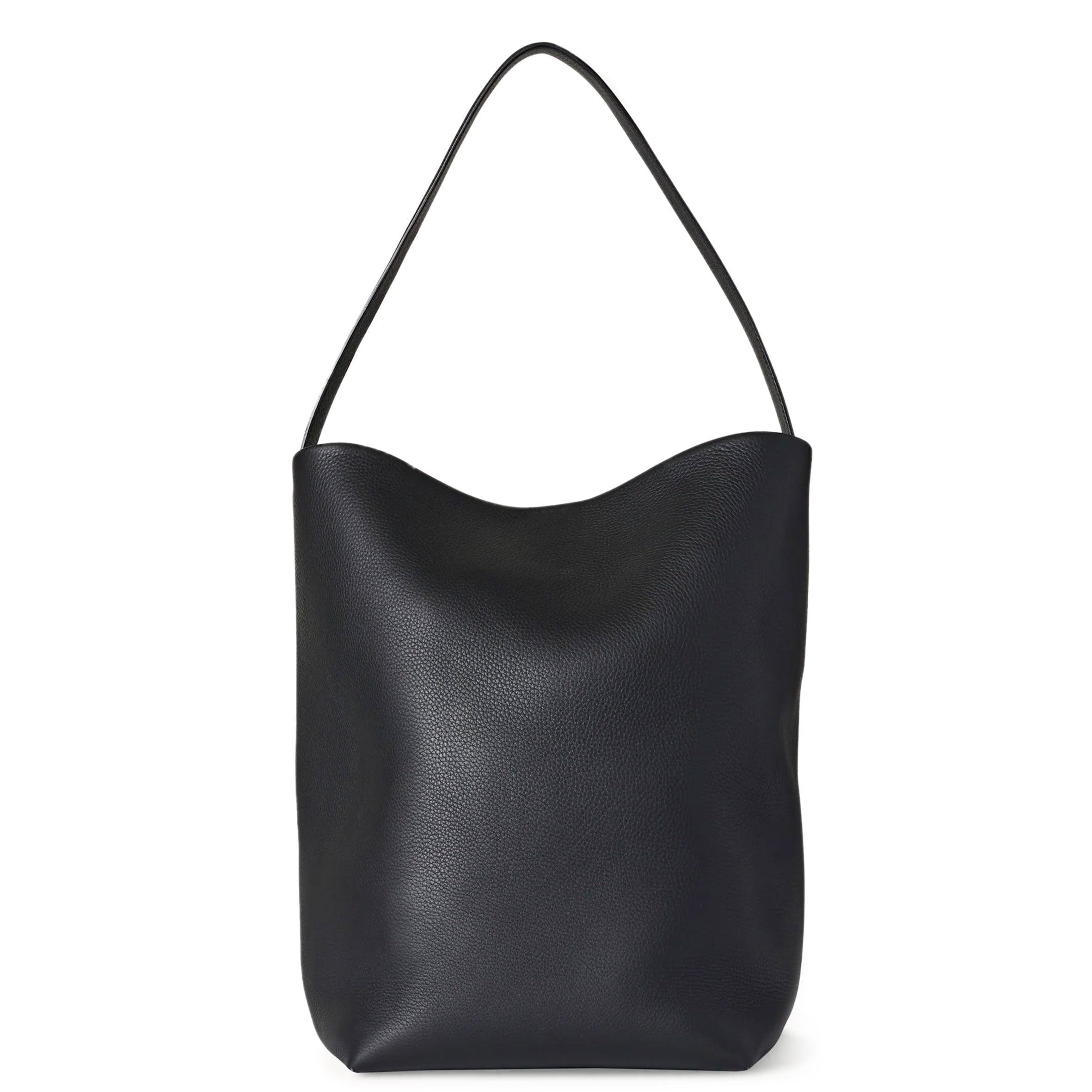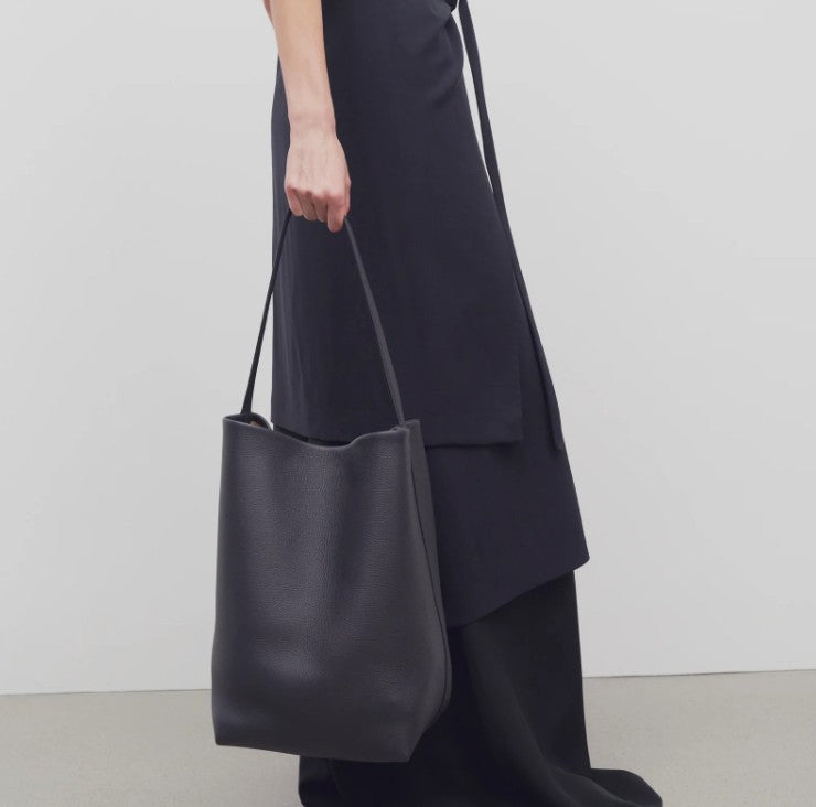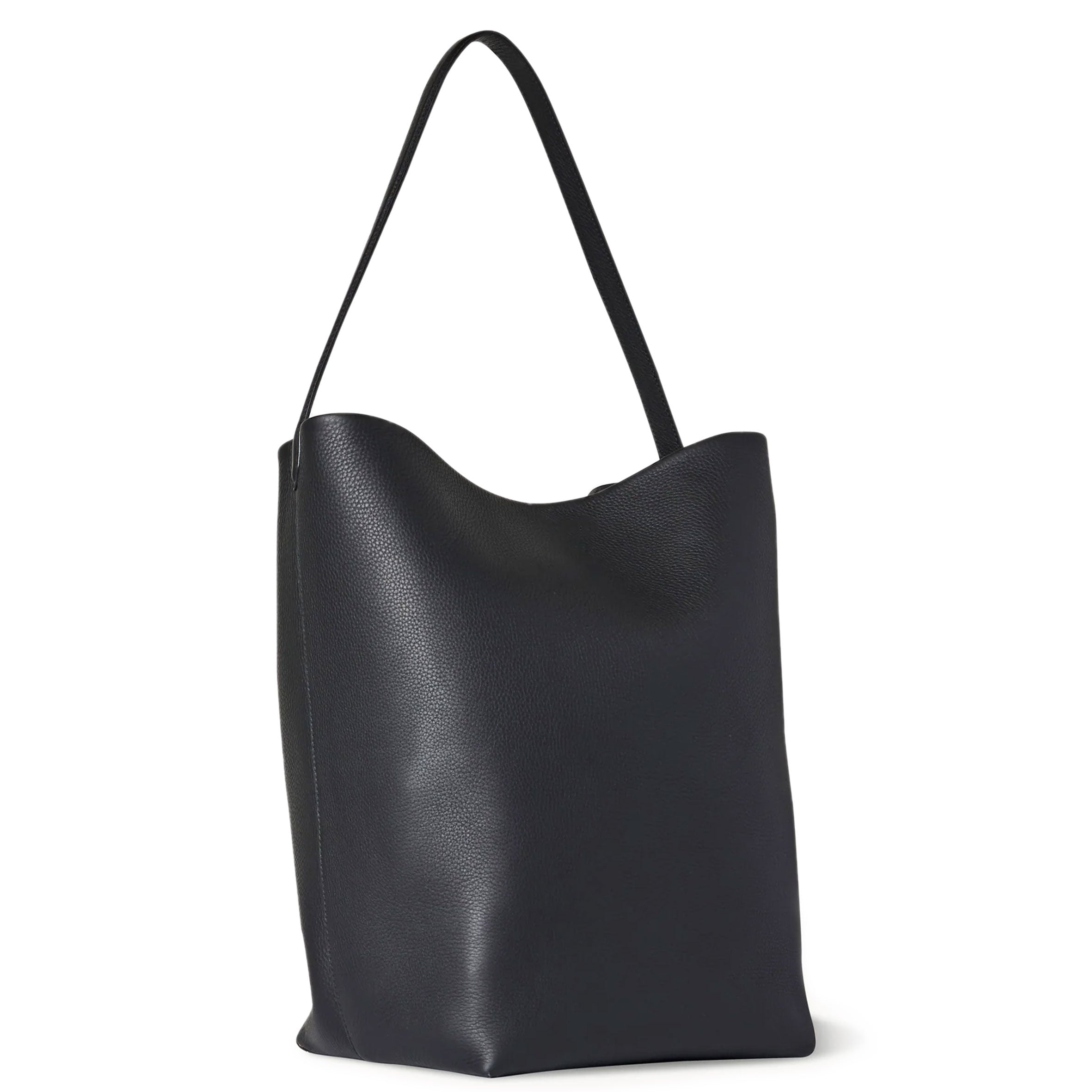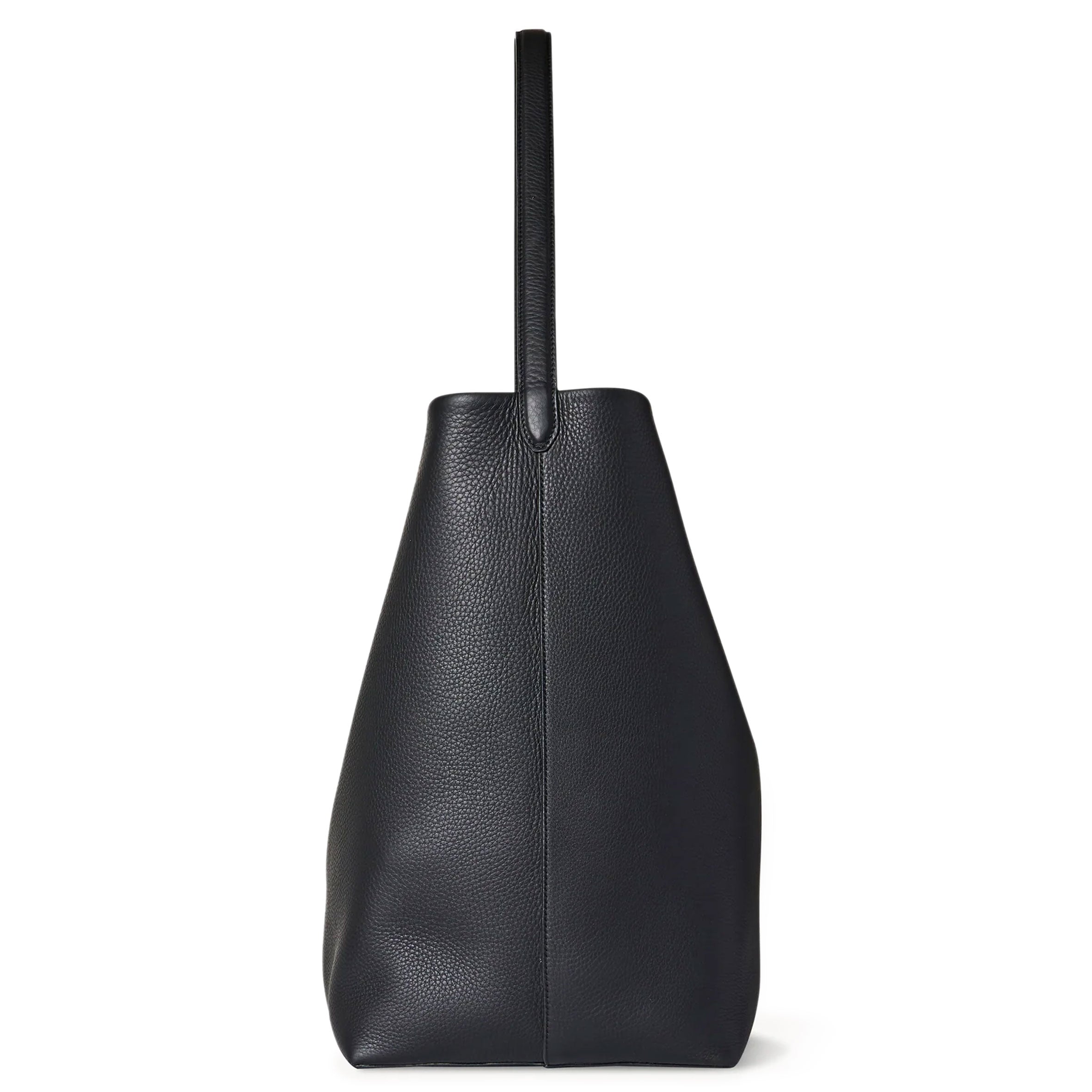 Classic tote bag in tumbled grained calfskin leather with interior toggle closure and flat handle. Embossed logo.