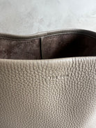 Classic tote bag in tumbled grained calfskin leather with interior toggle closure and flat handle.