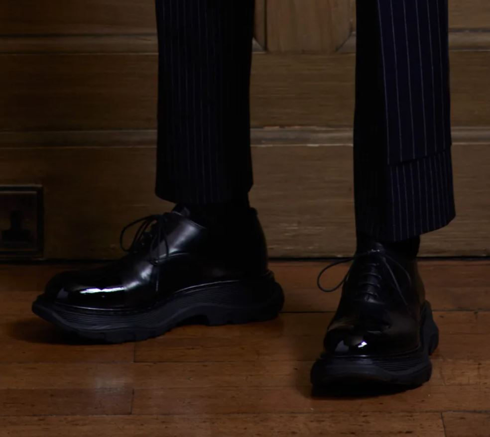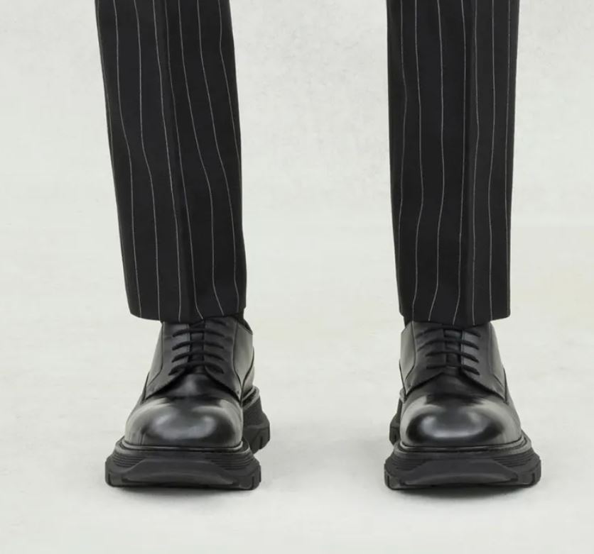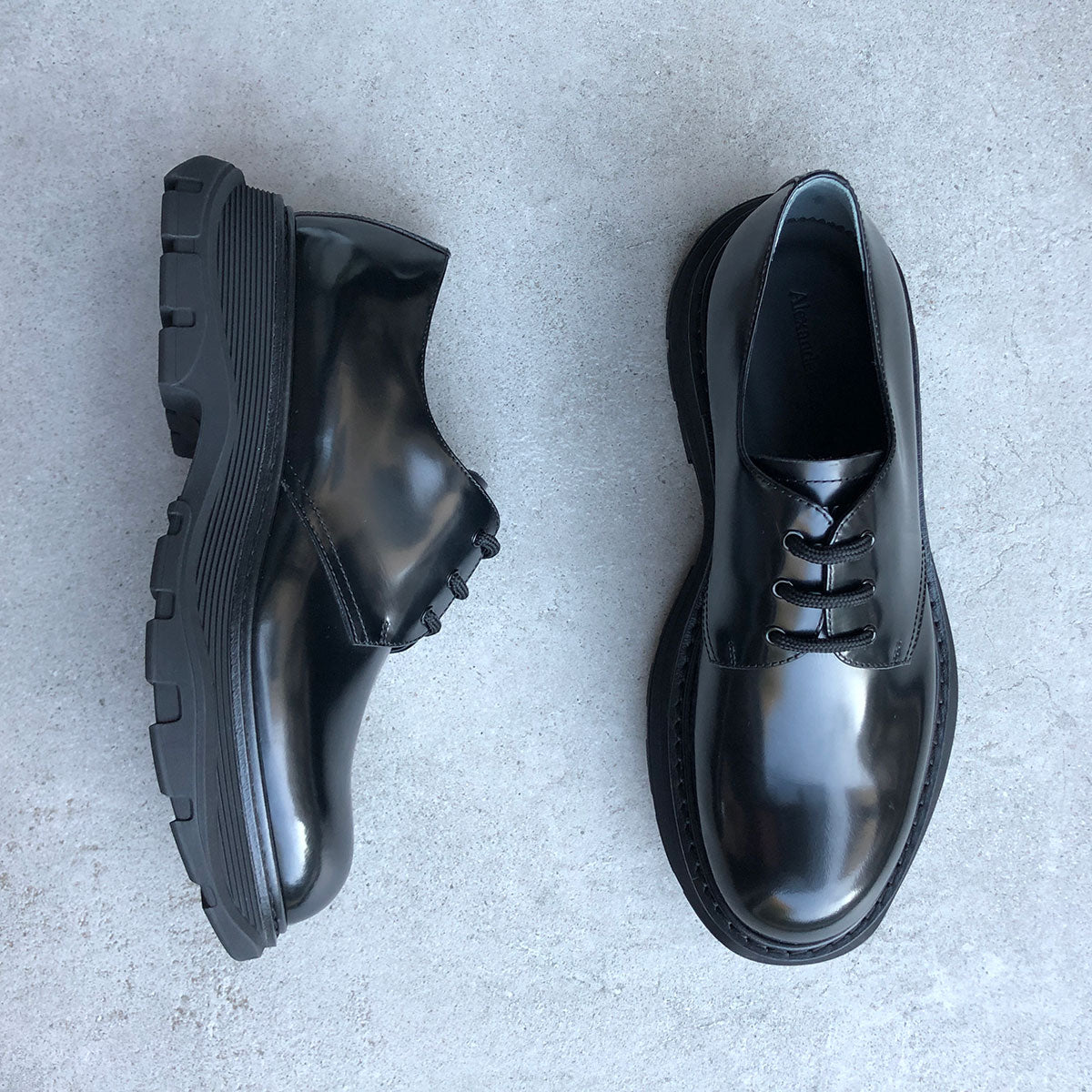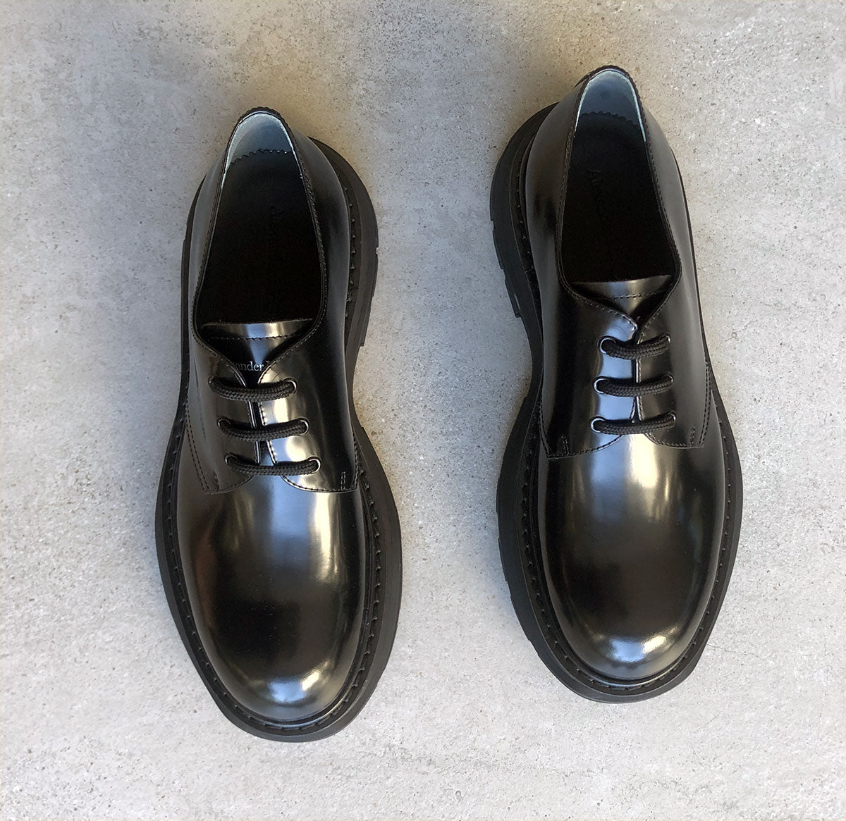 The Tread sneakers hail from Alexander McQueen's Hybrid collection. Black calf leather lace-up with a thick oversized rubber tread sole and a rounded toe silhouette. Finished with an Alexander McQueen signature on the tongue.