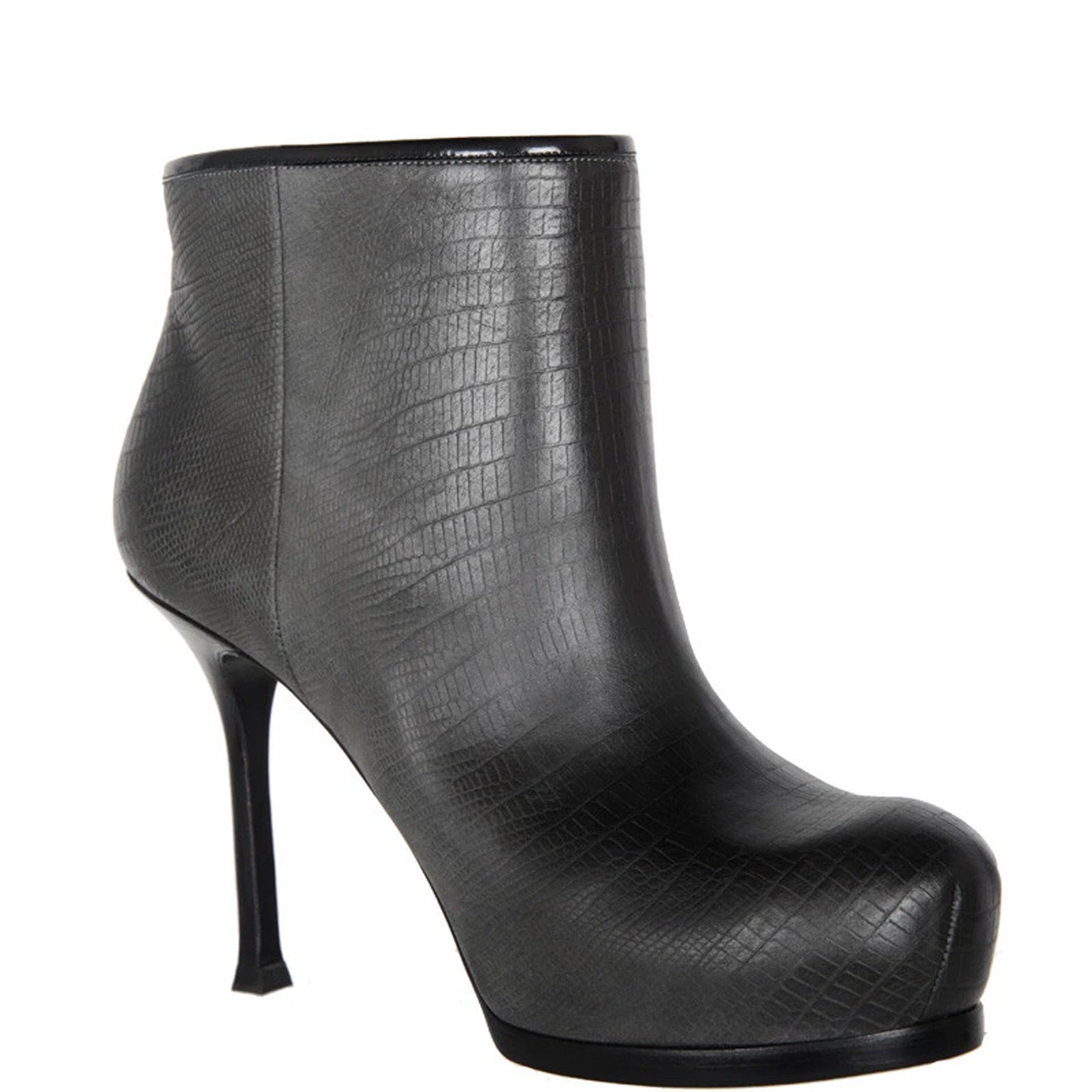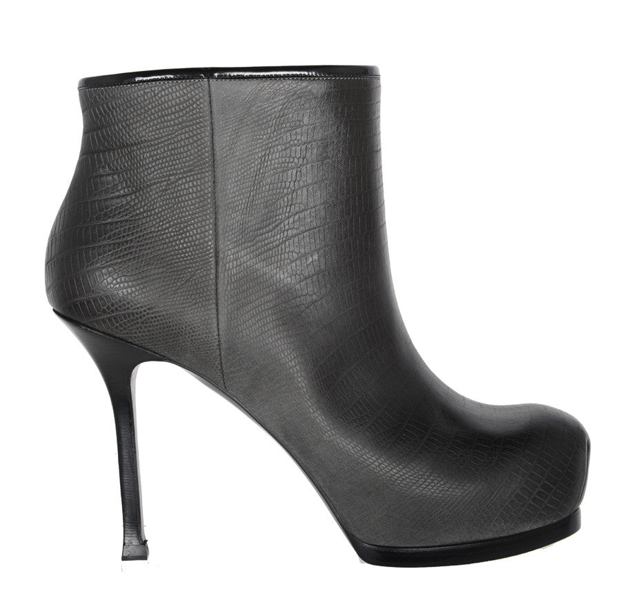 The Tribtoo Ankle Boot has a hidden platform. Tejus stamped degrade leather upper with patent leather trim.
