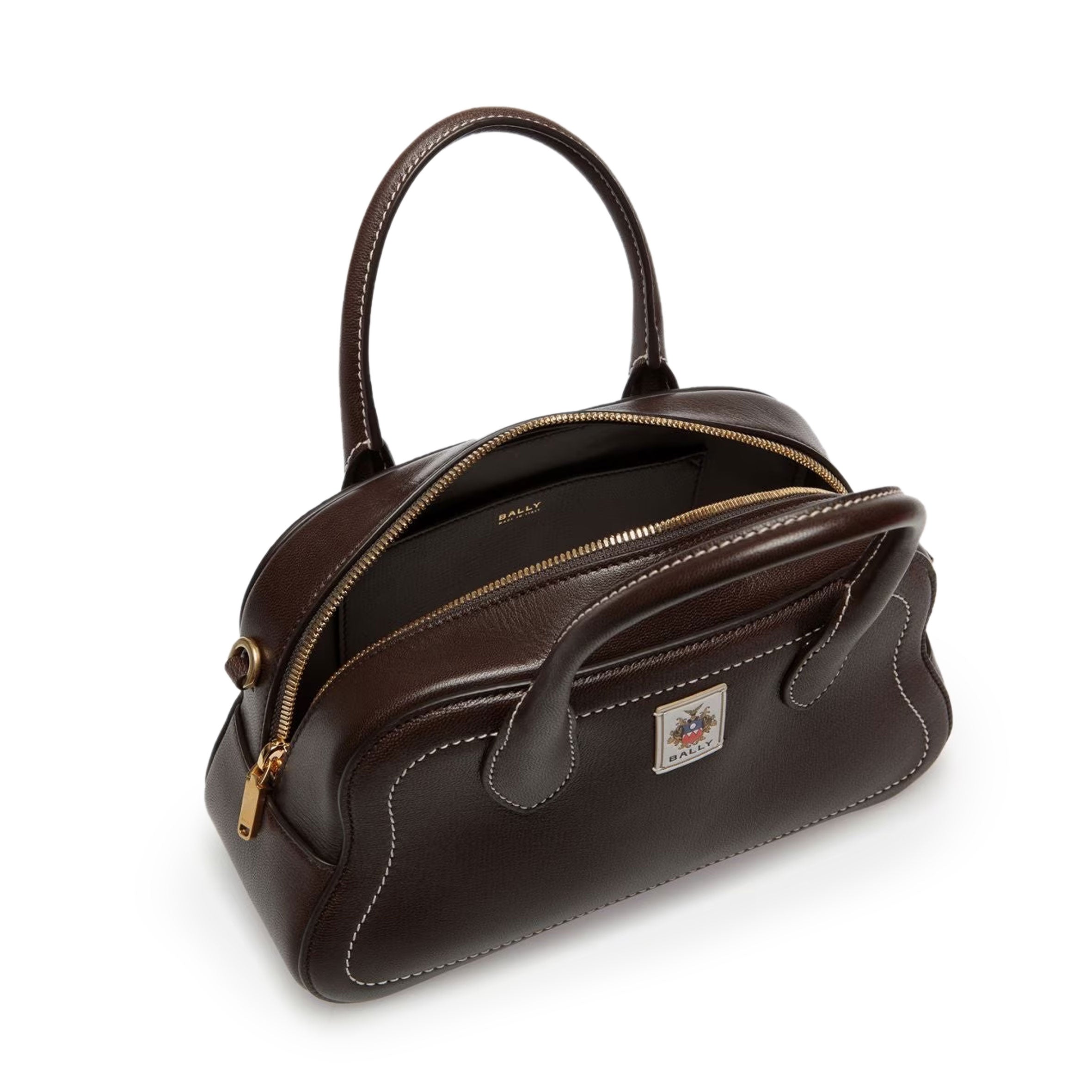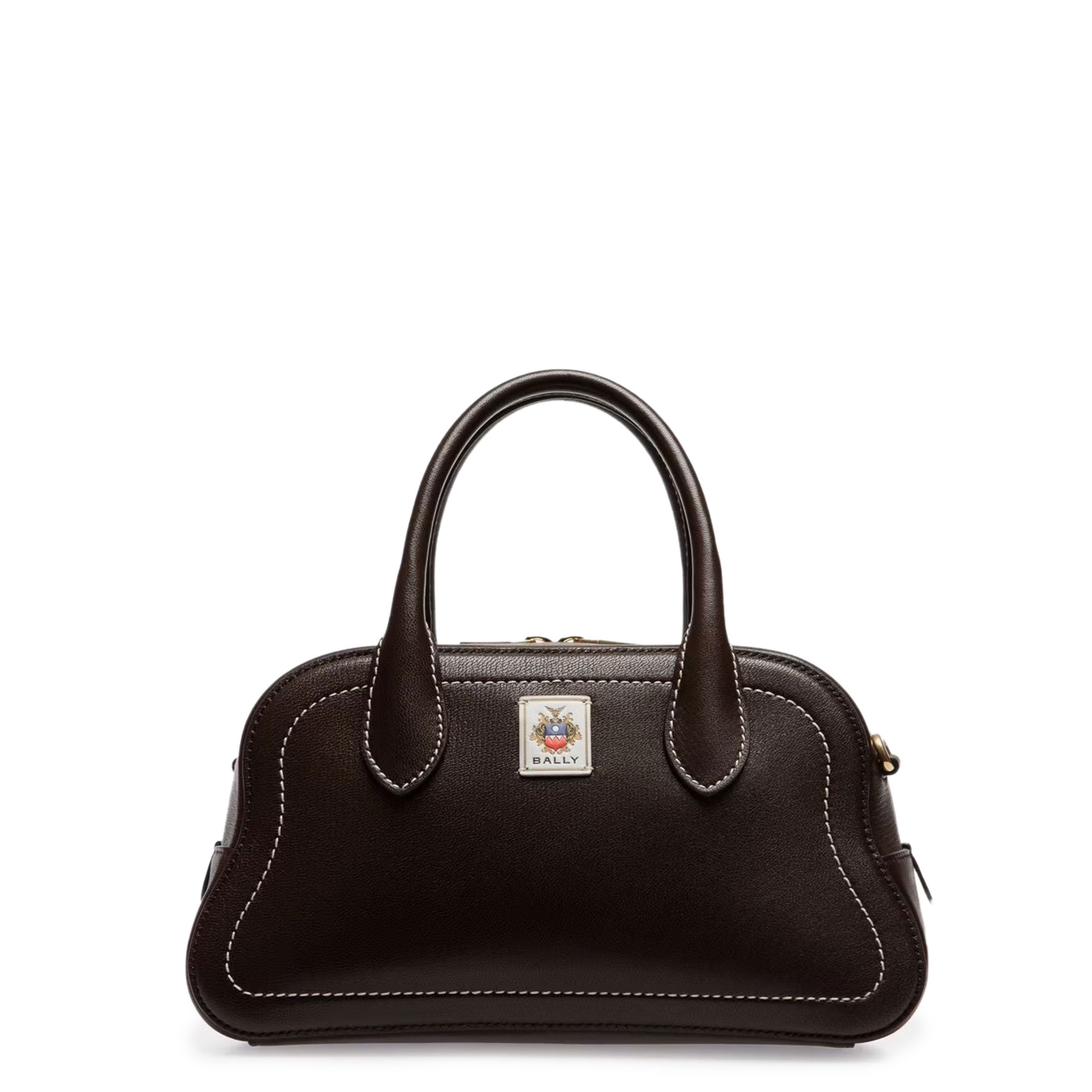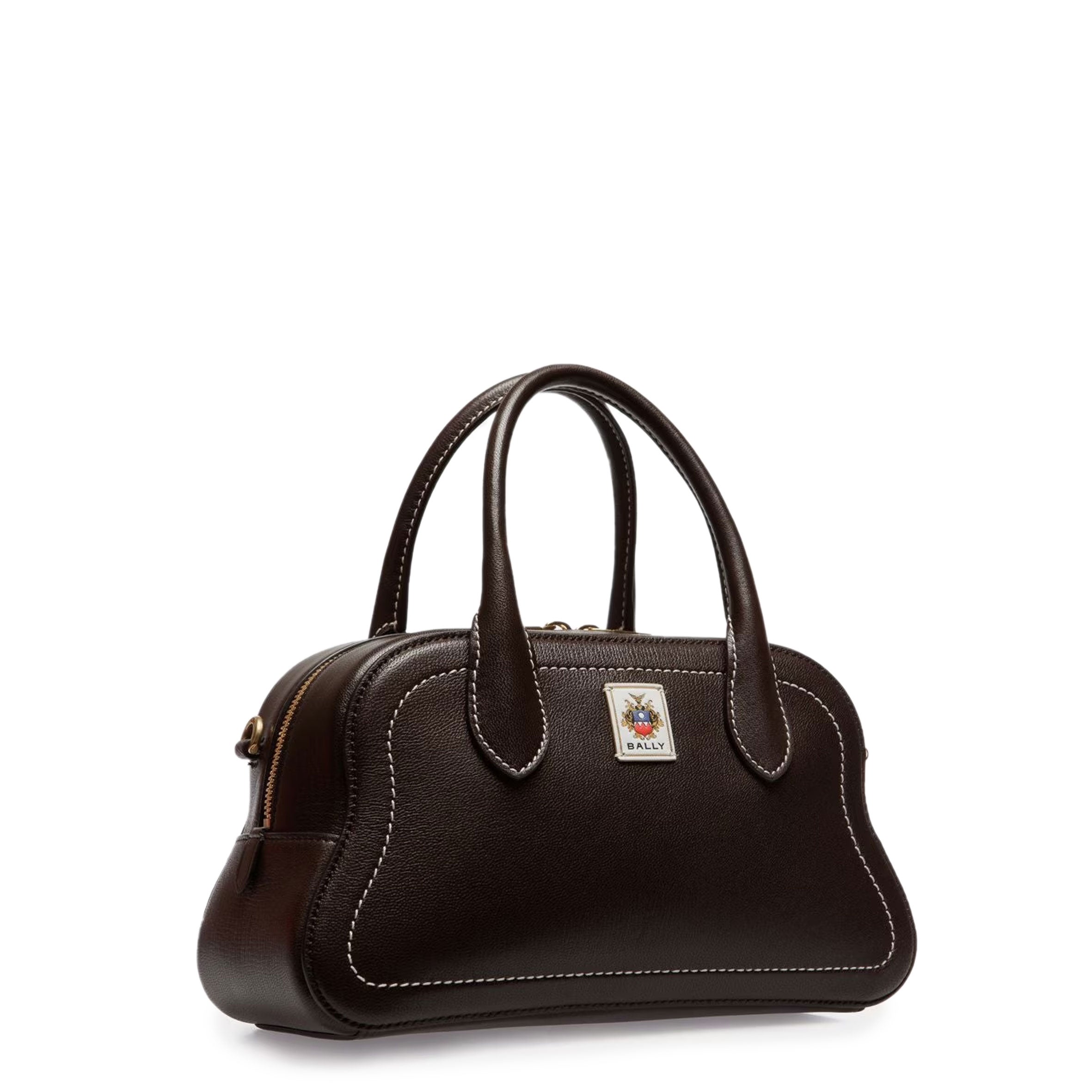 The Unda top handle bag has a softly rounded trapezoid silhouette in Ebano kidskin with a grained finish. A Bally Crest patch in leather embellishes the front.