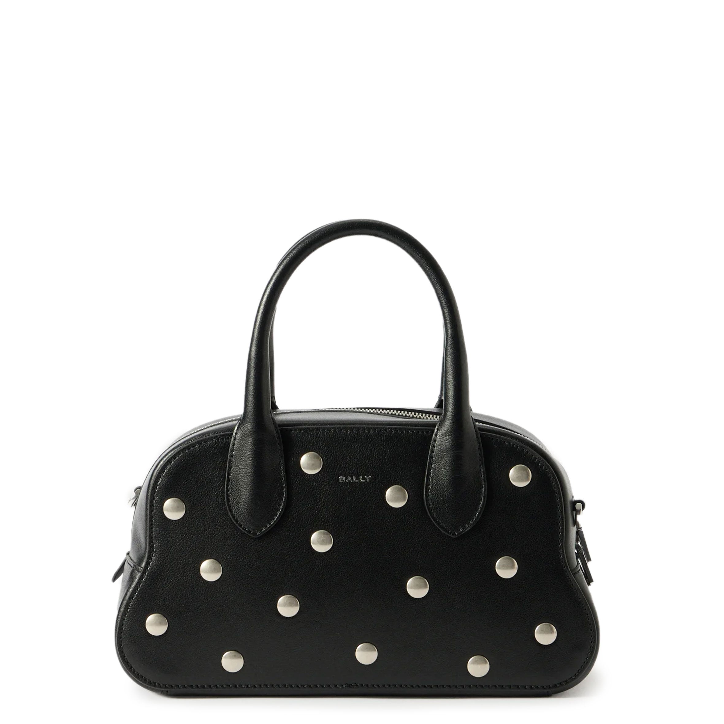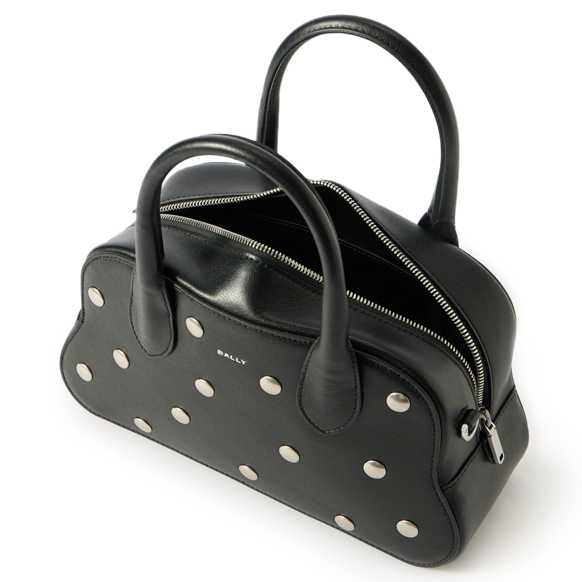 The Unda top handle bag has a softly rounded trapezoid silhouette in Black kidskin with a smooth finish. Silver studs embellishe the front and back.