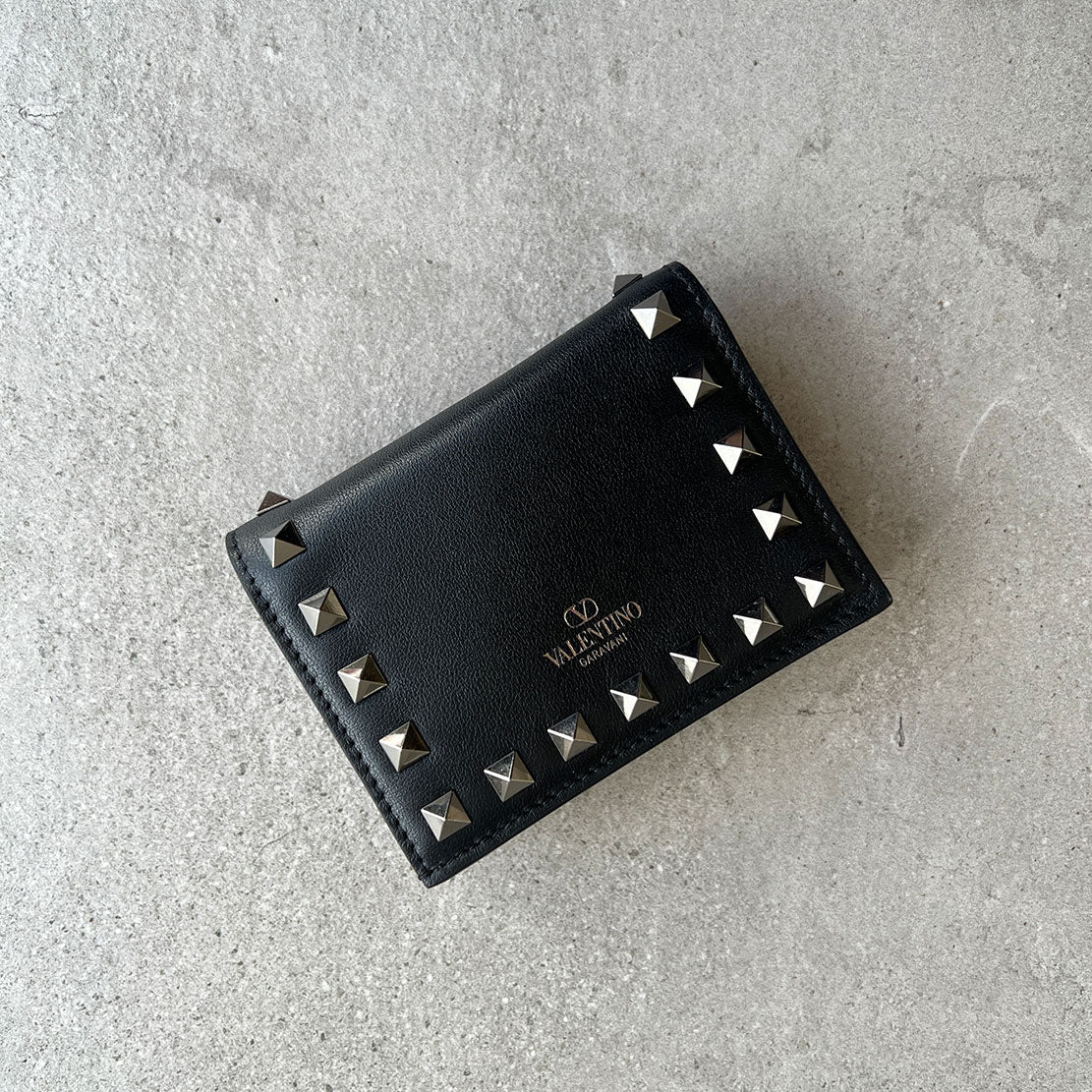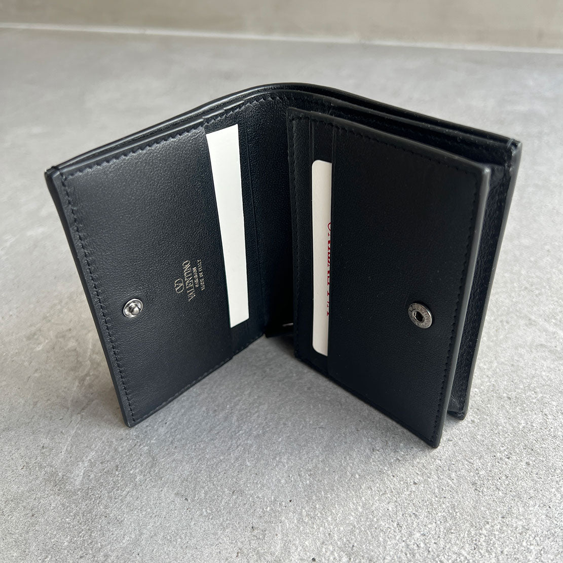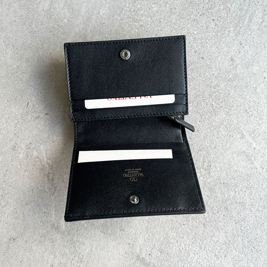 Valentino French Flap wallet is compact enough to carry all of your essentials and still fit into the slimmest of evening bags. One press stud closure, one zip compartment for coins and one for 5 cards with a slot for notes.