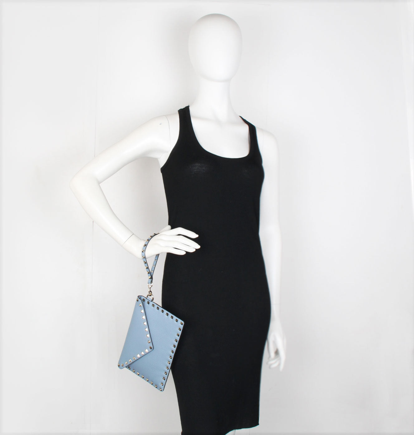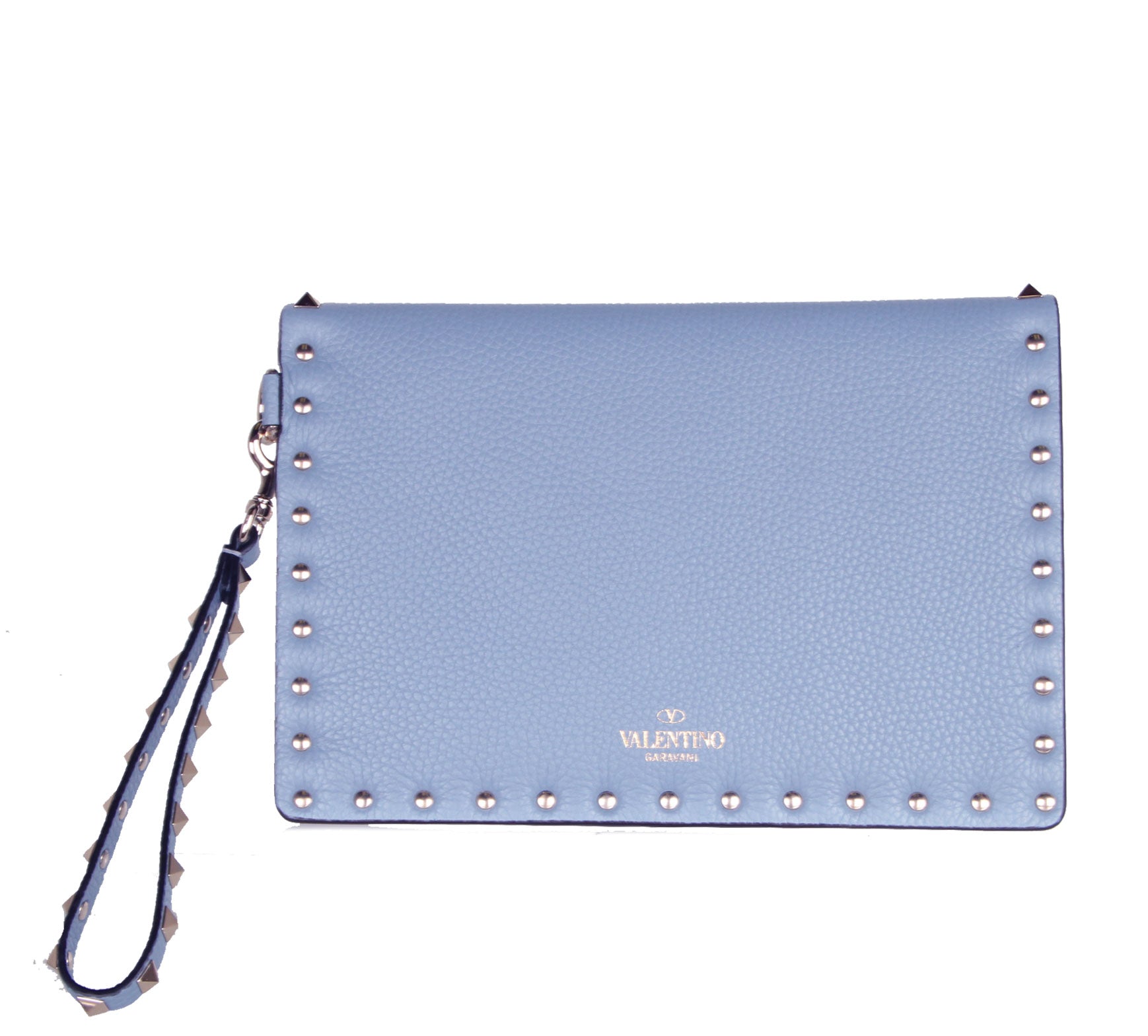 Valentino wristlet pouch is made with the signature rockstud in platinum hardware. The pouch features 4 card slots and closes with a magnetic flap.