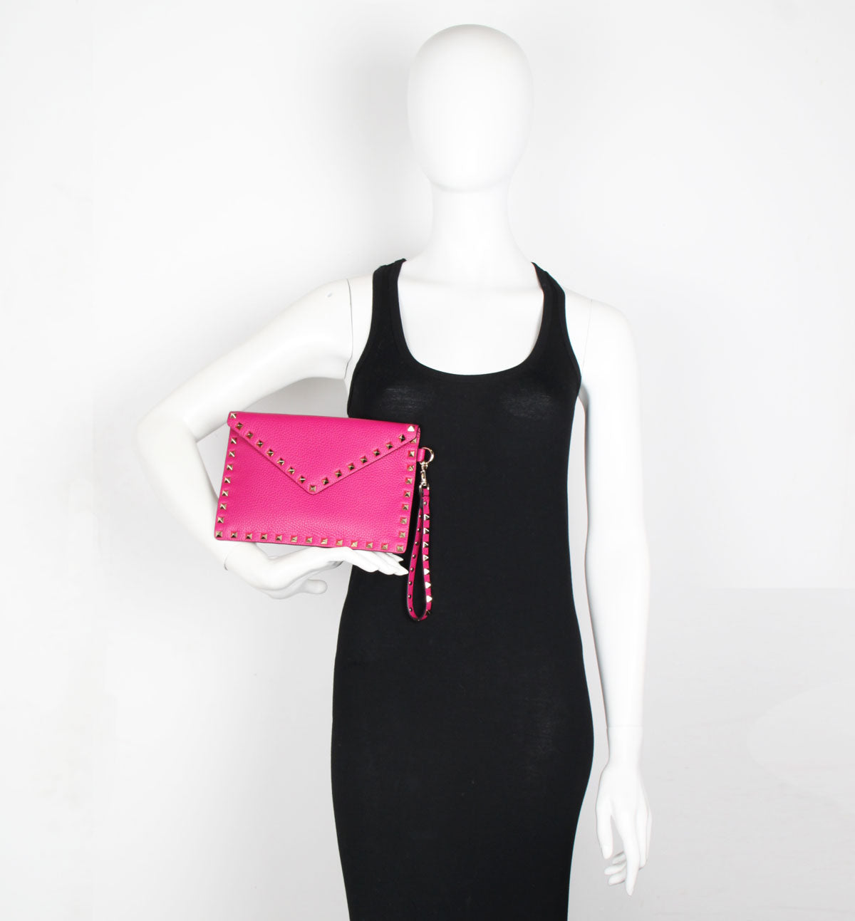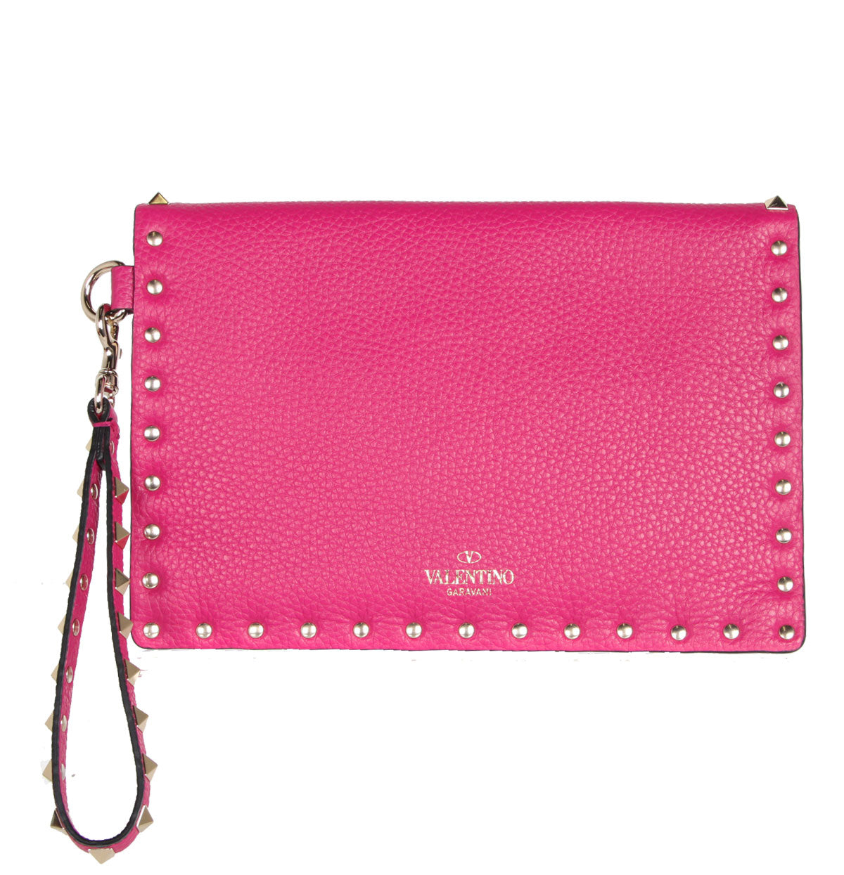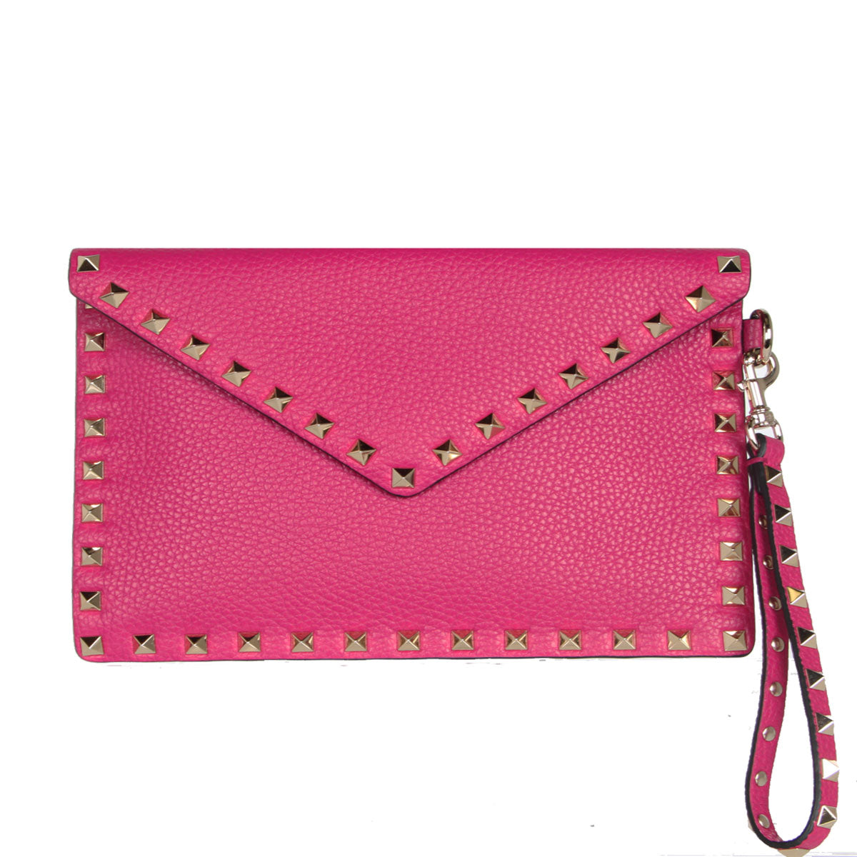 Valentino wristlet pouch is made with the signature rockstud in platinum hardware. The pouch features 4 card slots and closes with a magnetic flap.