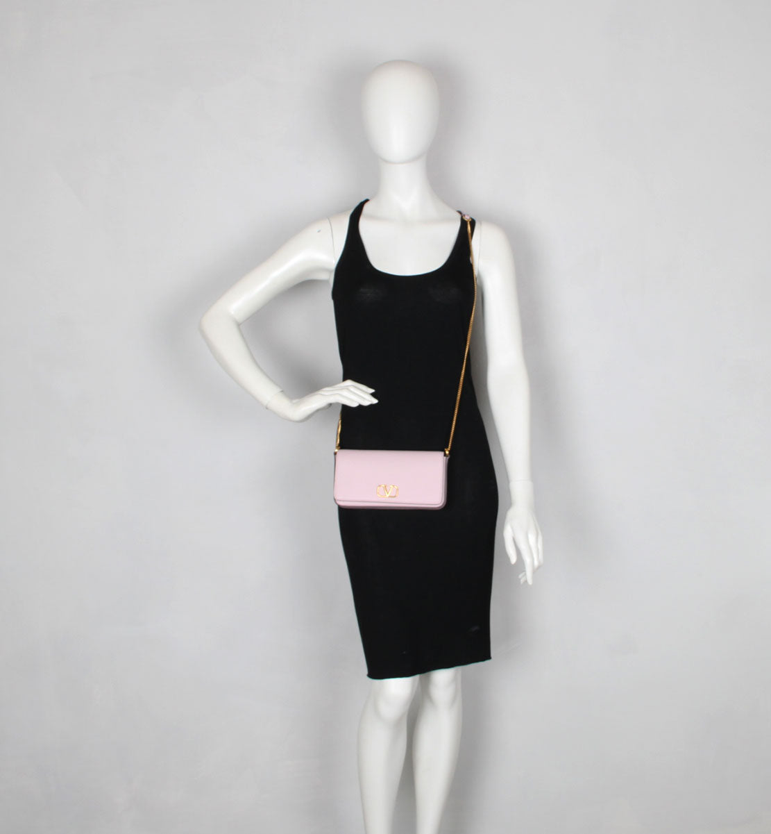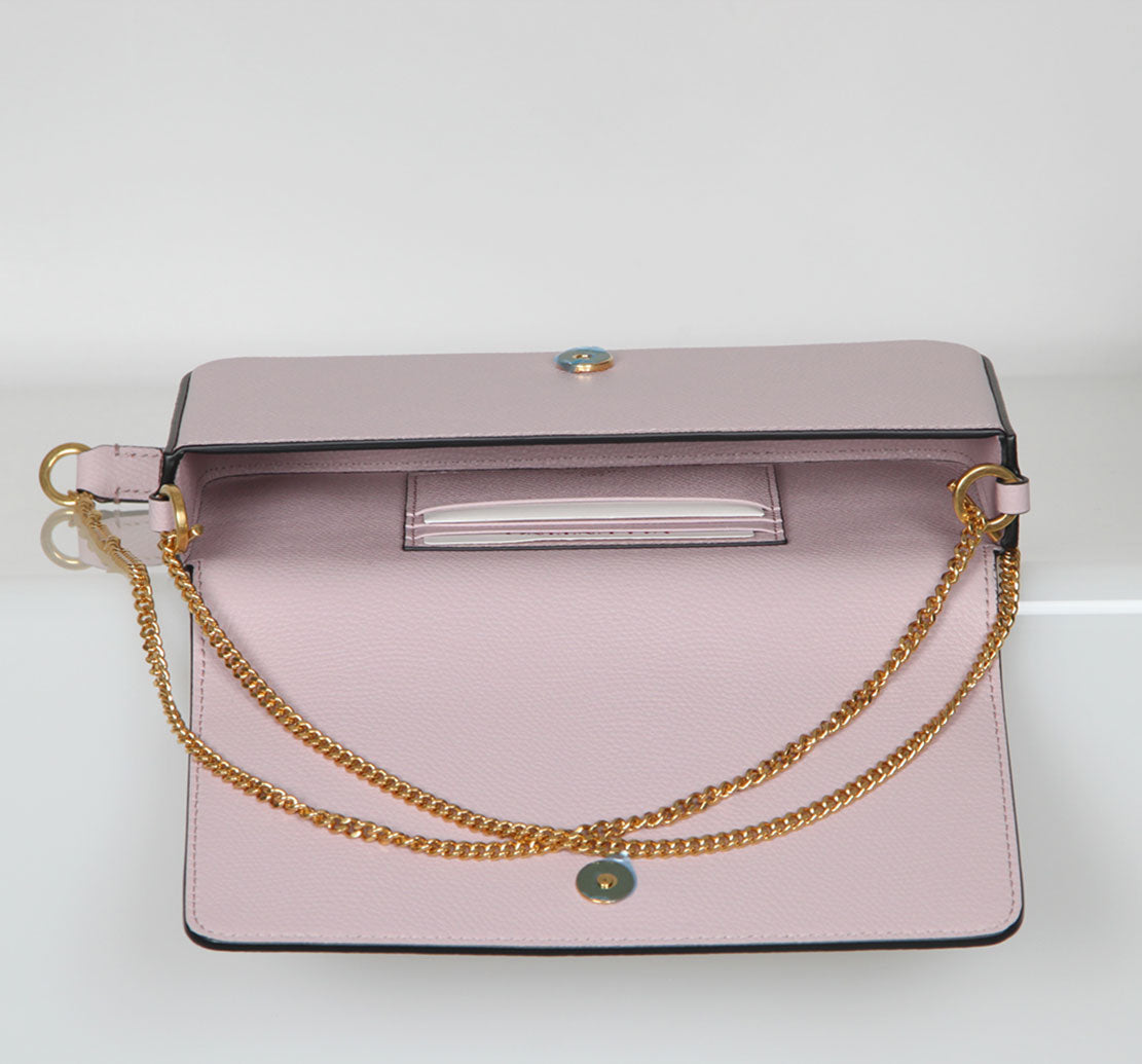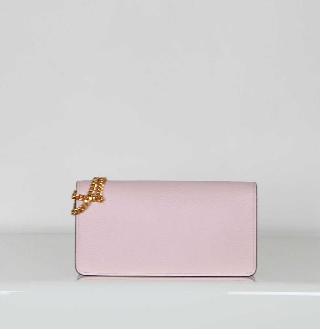 Valentino Garavani VLogo square pouch in grainy calfskin leather with chain strap. Accordion internal design compartments with three card slots, an internal zip pocket and leather logo patch. Front foldover flap pocket with magnetic snap closure and finished with gold tone curb link chain shoulder strap and VLogo hardware.