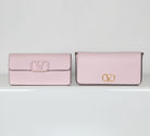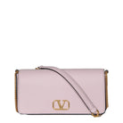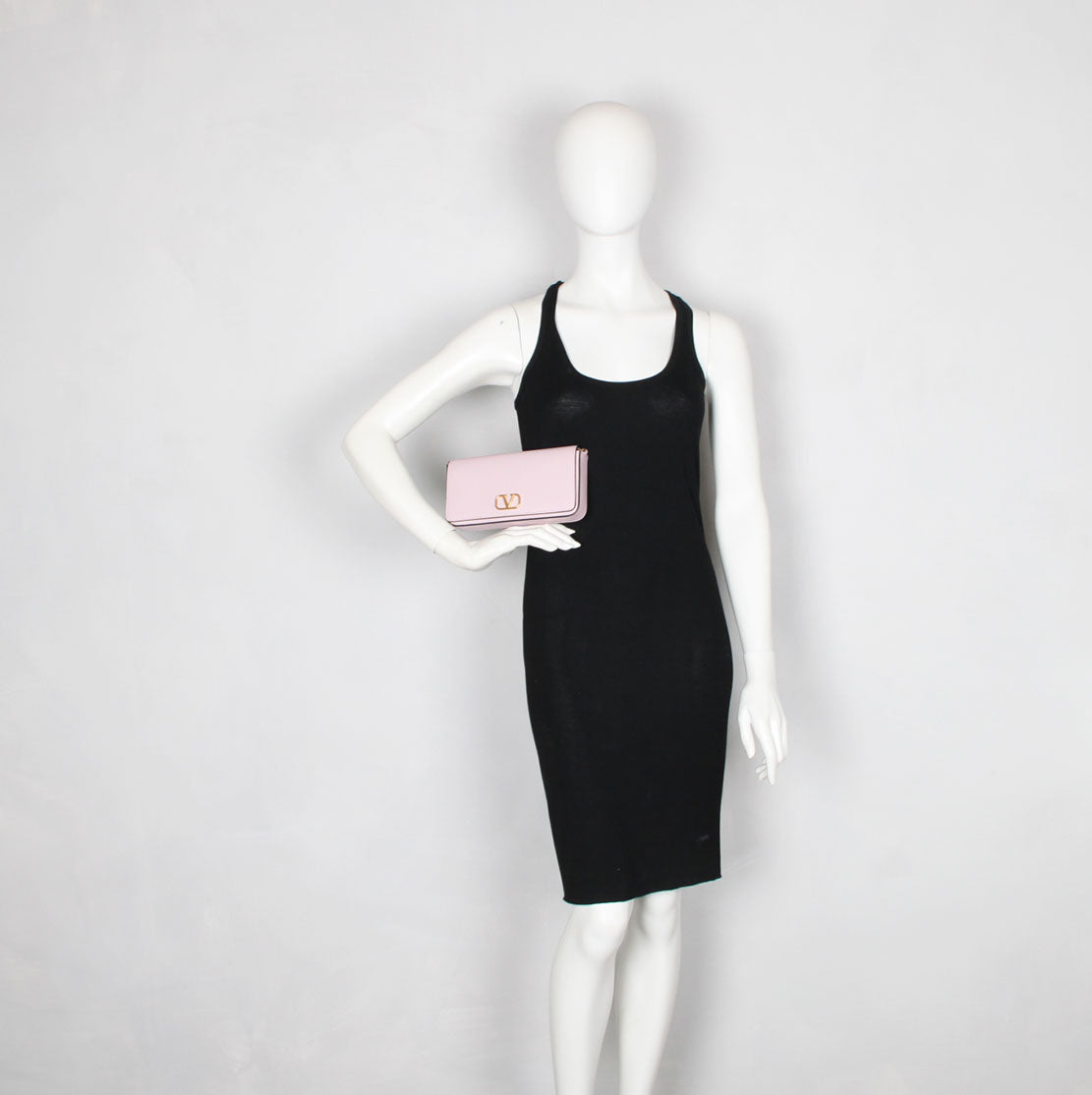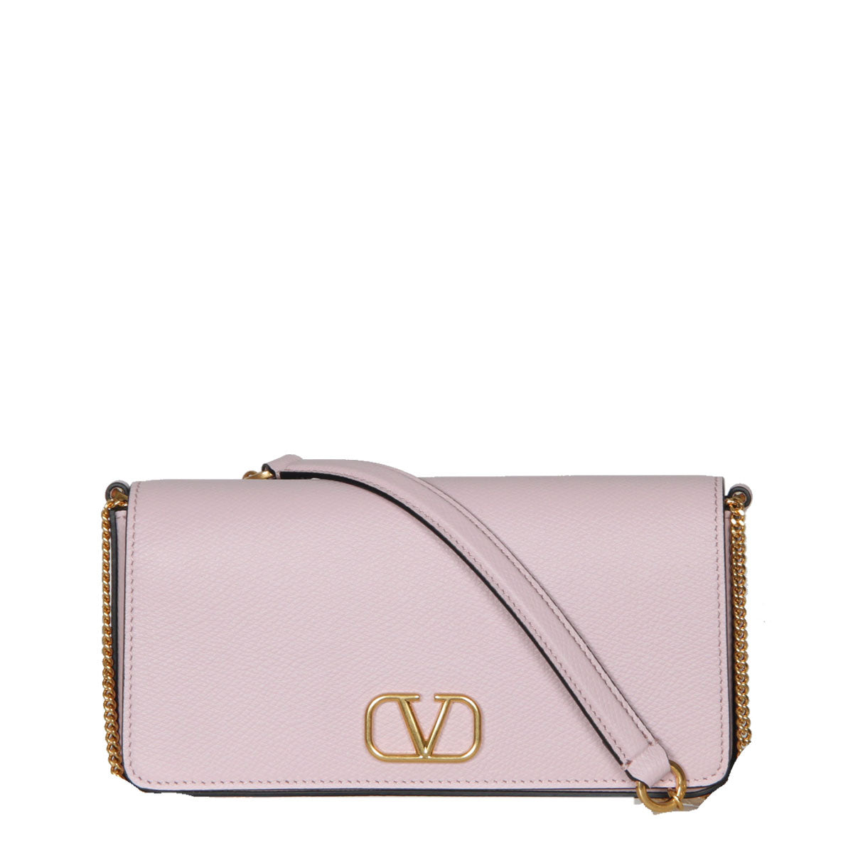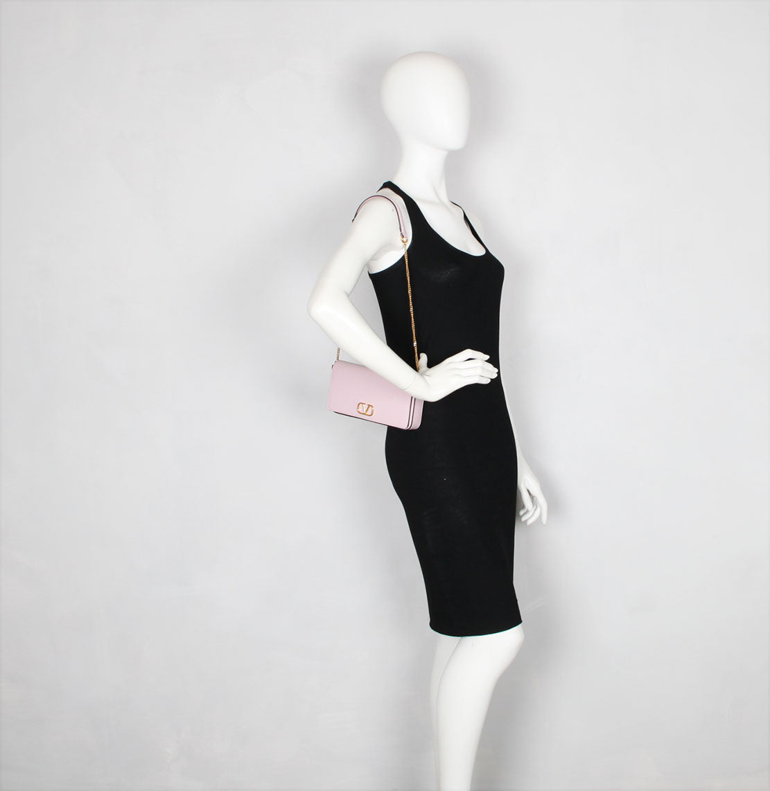 Valentino Garavani VLogo square pouch in grainy calfskin leather with chain strap. Accordion internal design compartments with three card slots, an internal zip pocket and leather logo patch. Front foldover flap pocket with magnetic snap closure and finished with gold tone curb link chain shoulder strap and VLogo hardware.