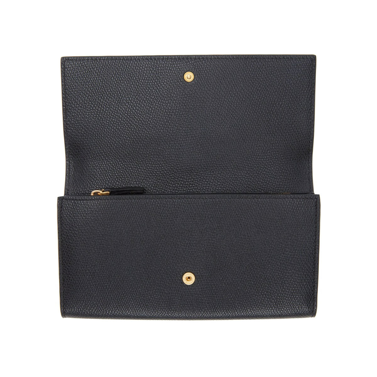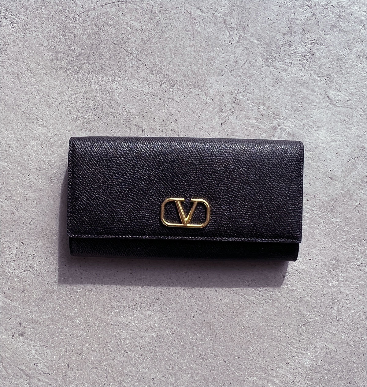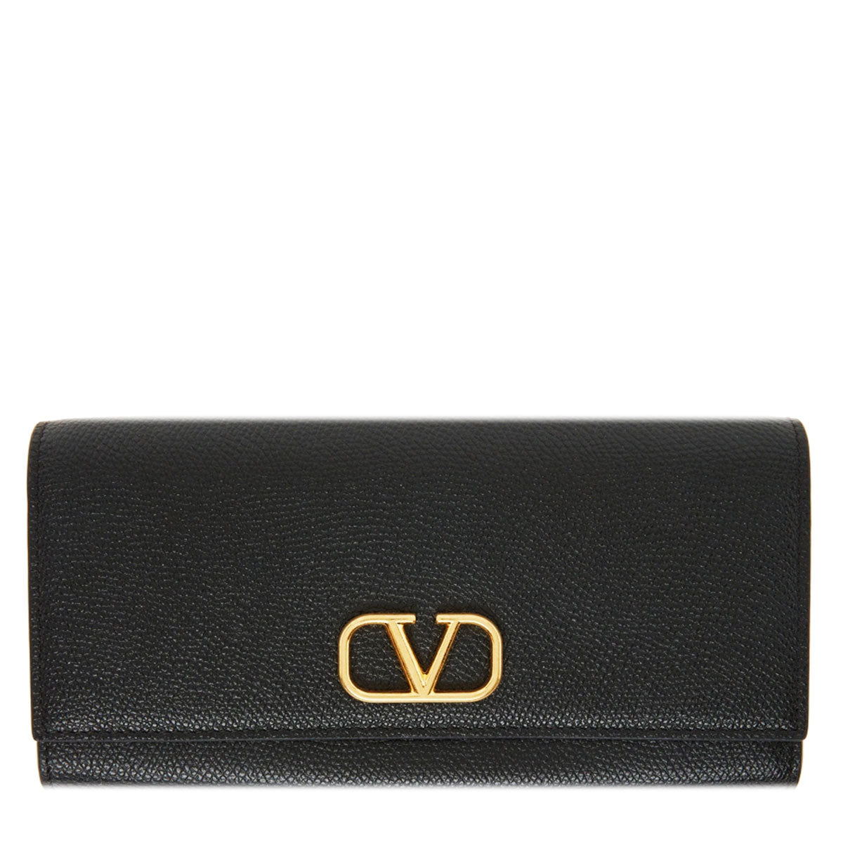 Valentino medium Flap Continental Wallet with signature Vlogo hardware detailing in antique gold tone. Features grained leather with 14 card slots, one note slot and zip coin pouch with canvas lining. External patch pocket at back face and press stud closure.