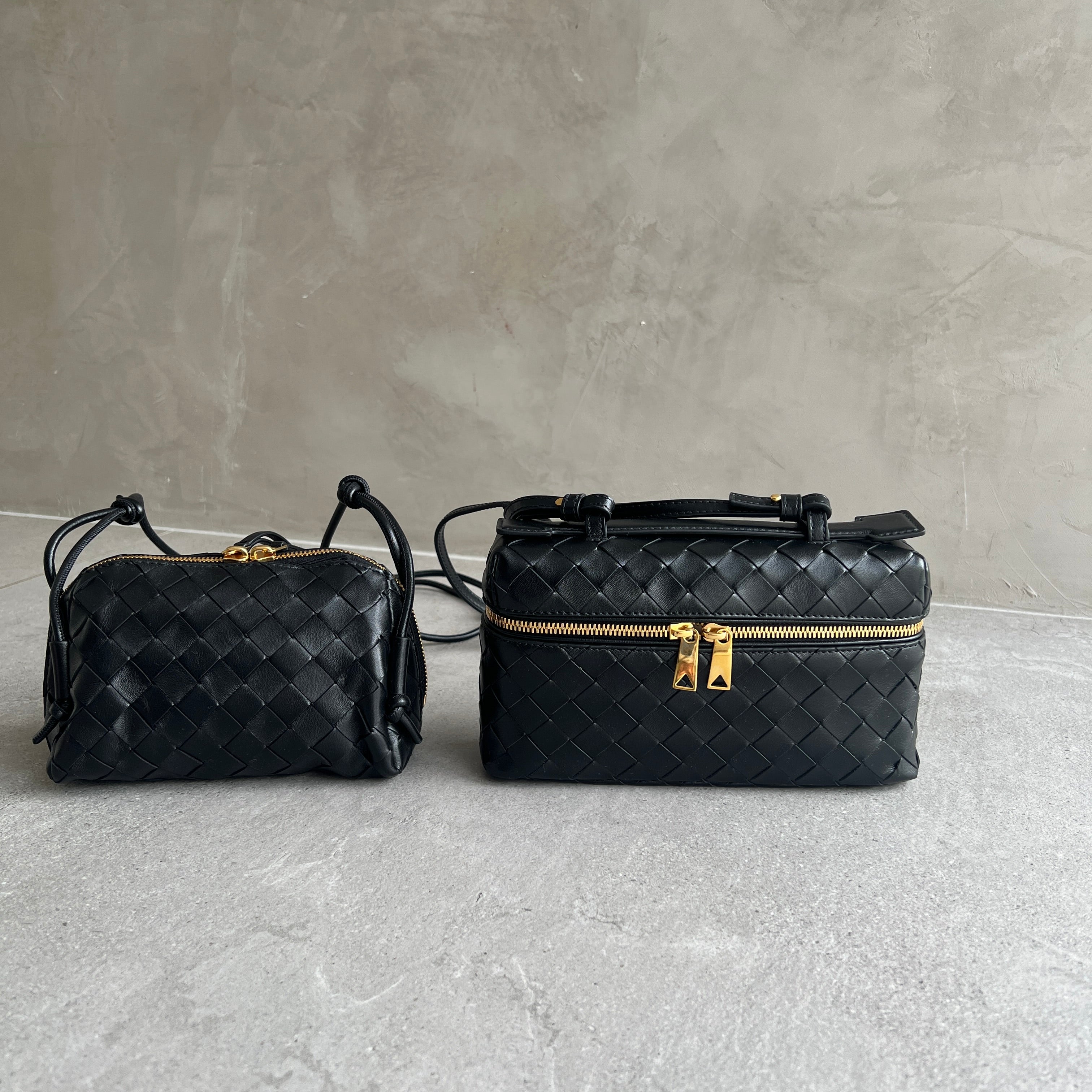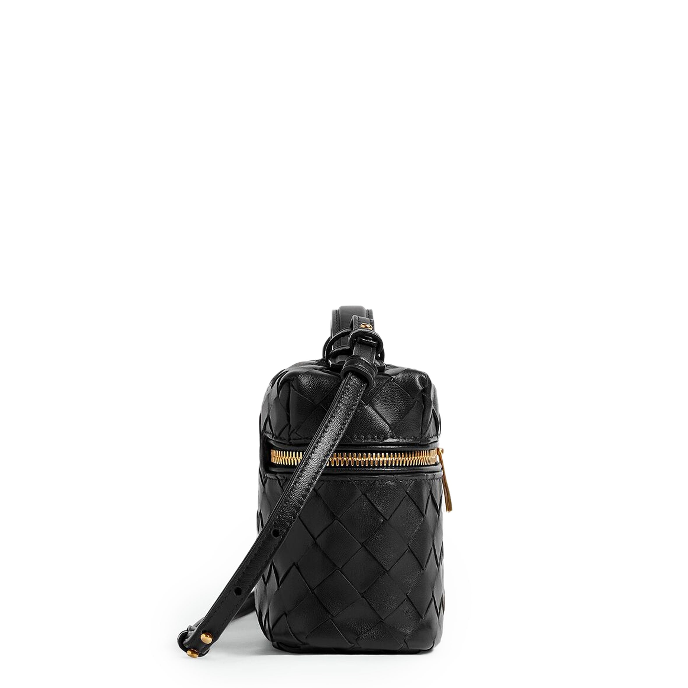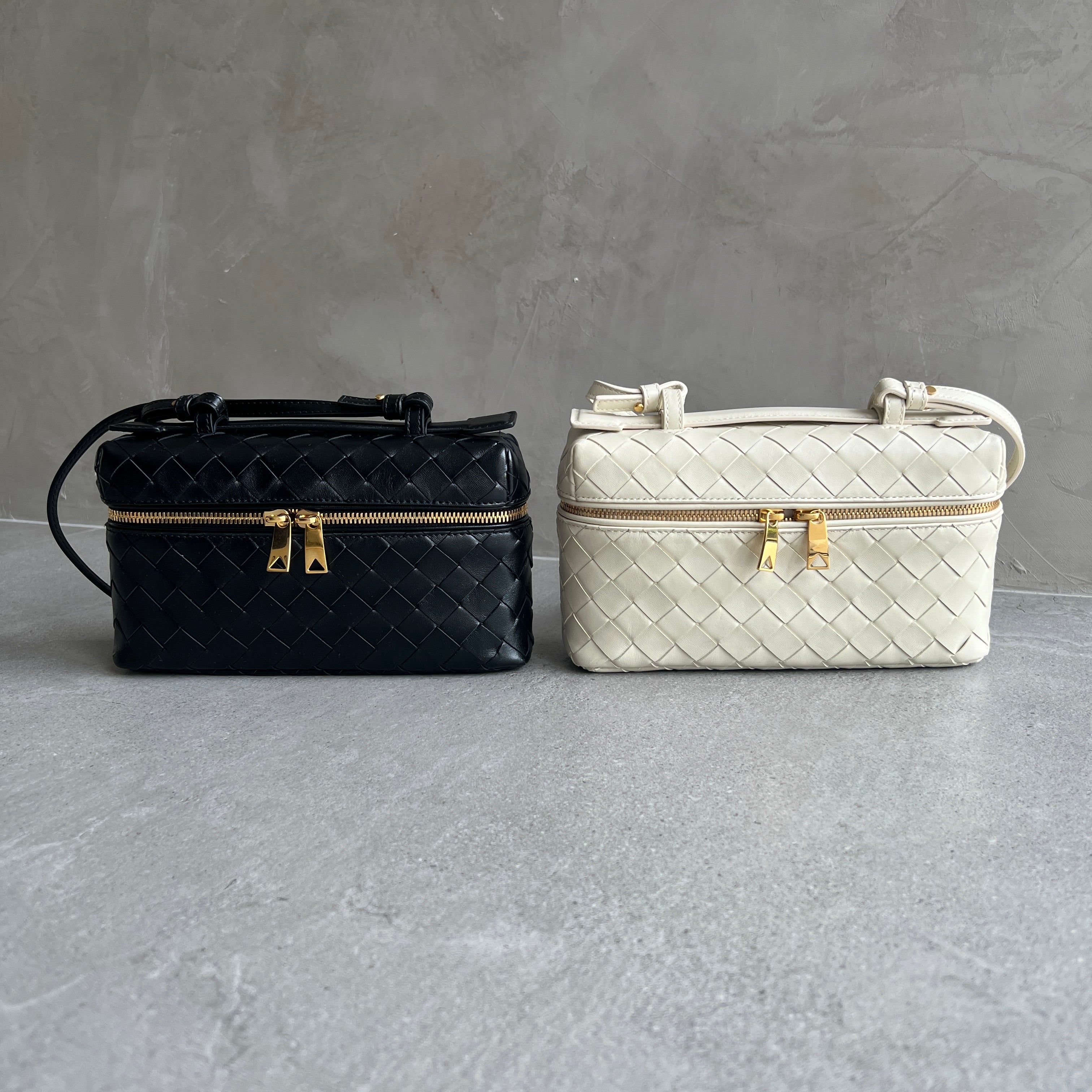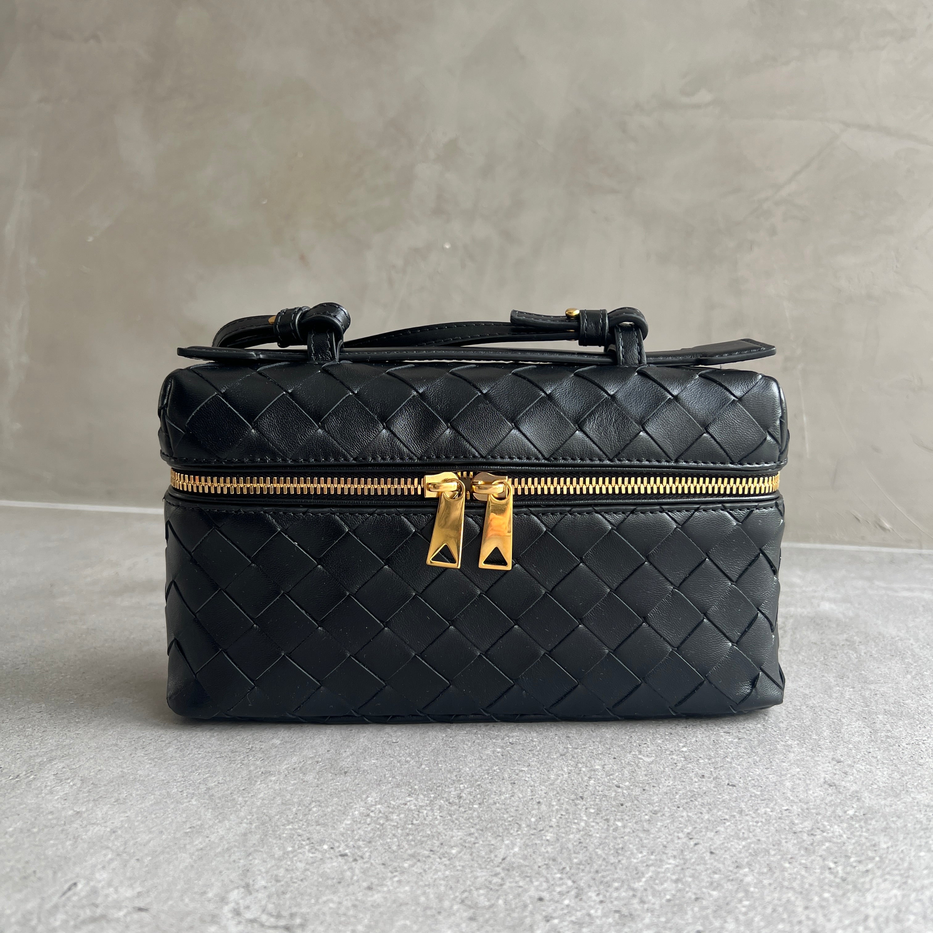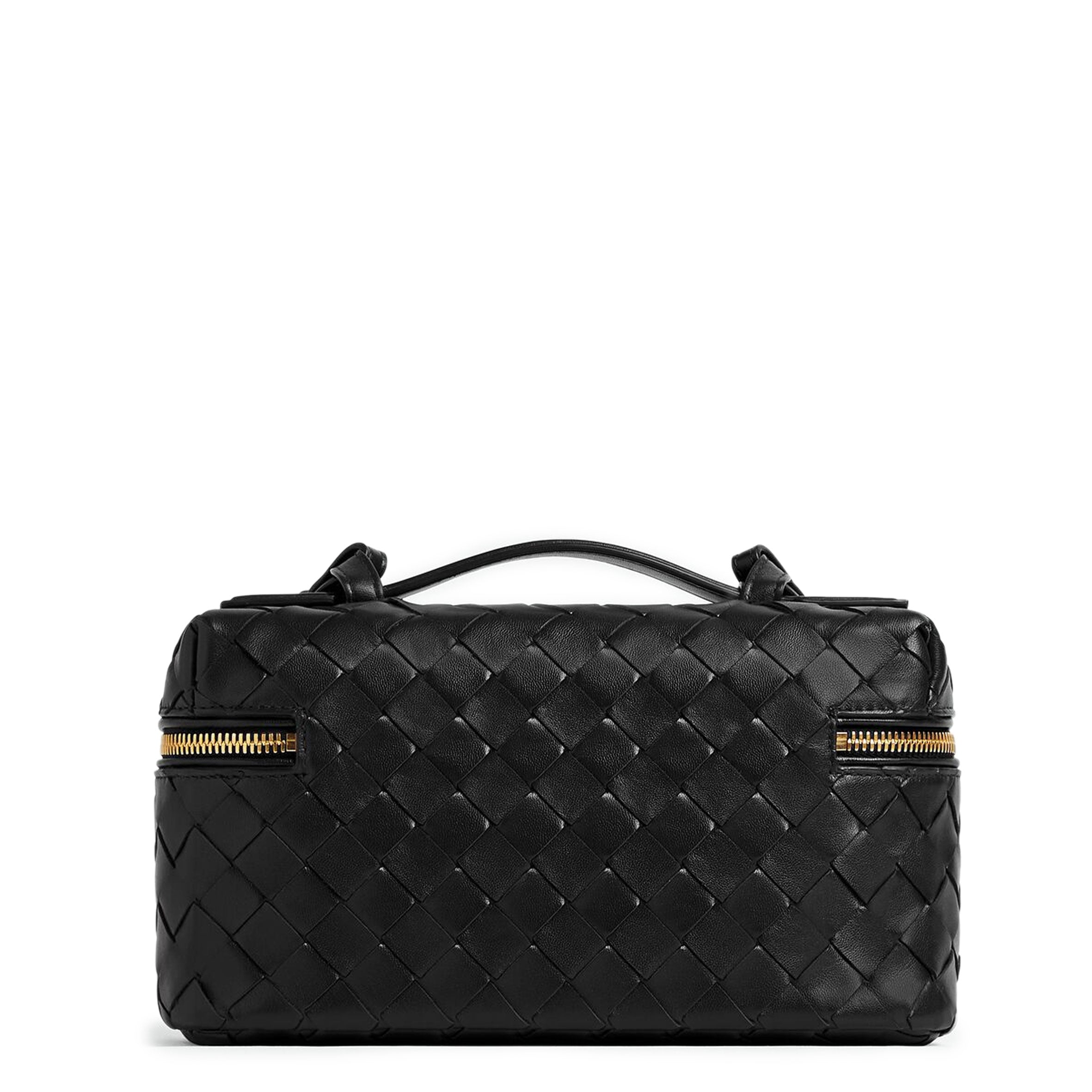 Bottega Veneta vanity case in intrecciato leather with top handle and removable, adjustable crossbody strap. Can be worn as a top handle or shoulder or crossbody bag.