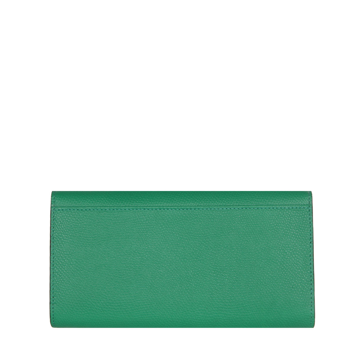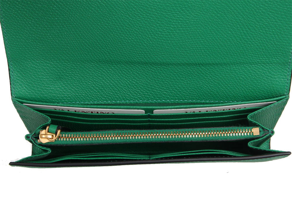 Valentino medium Flap Continental Wallet with signature Vlogo hardware detailing in antique gold tone. Features grained leather with 14 card slots, one note slot and zip coin pouch with canvas lining. Patch pocket at back face and press stud closure.