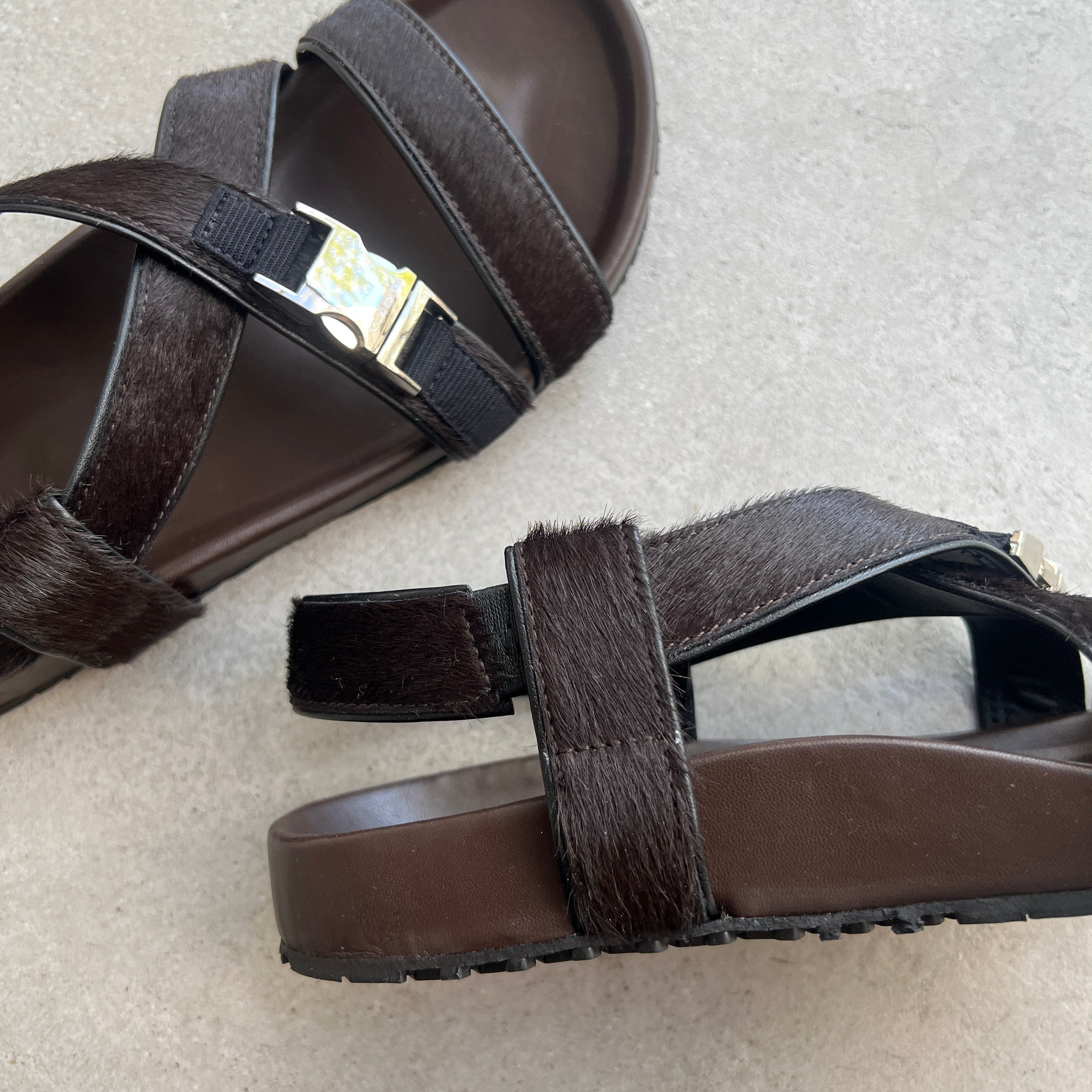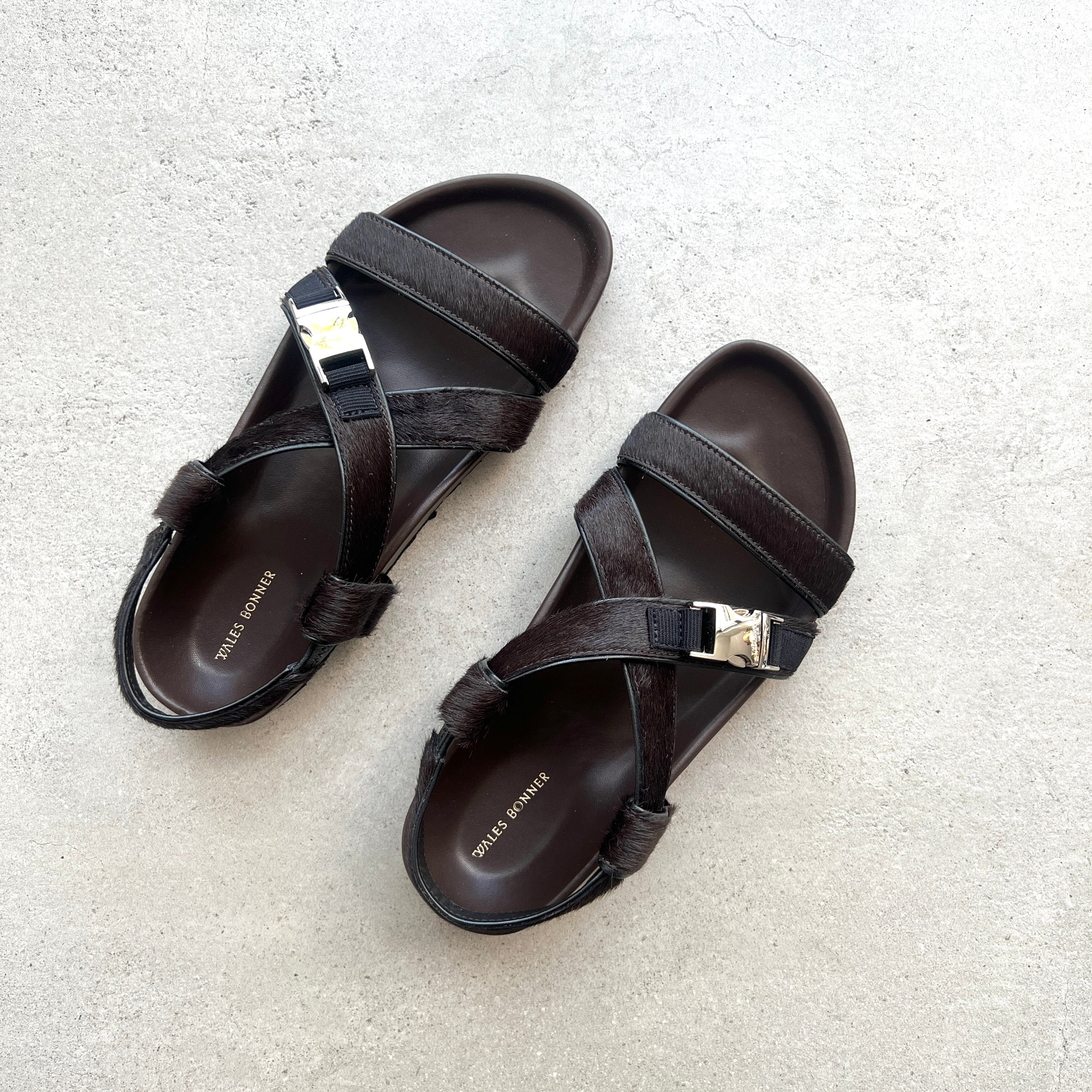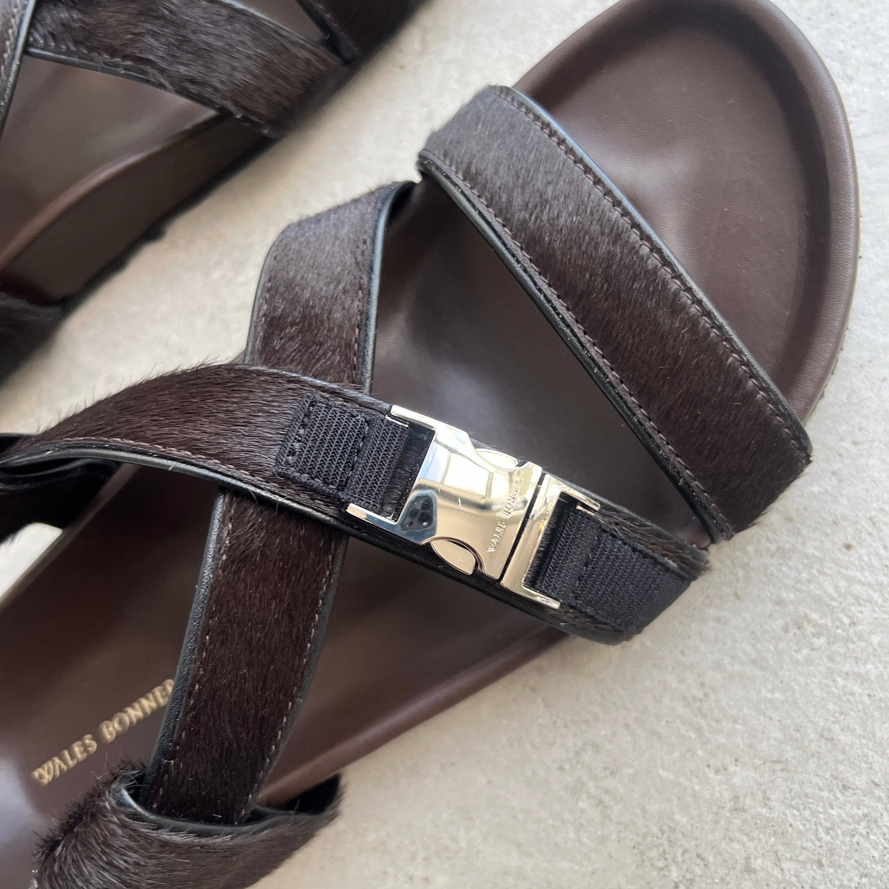The Promise Sandal in dark brown calf fur leather features a metal buckle closure and a padded leather sole embossed with the Wales Bonner logo.