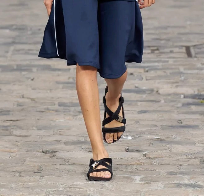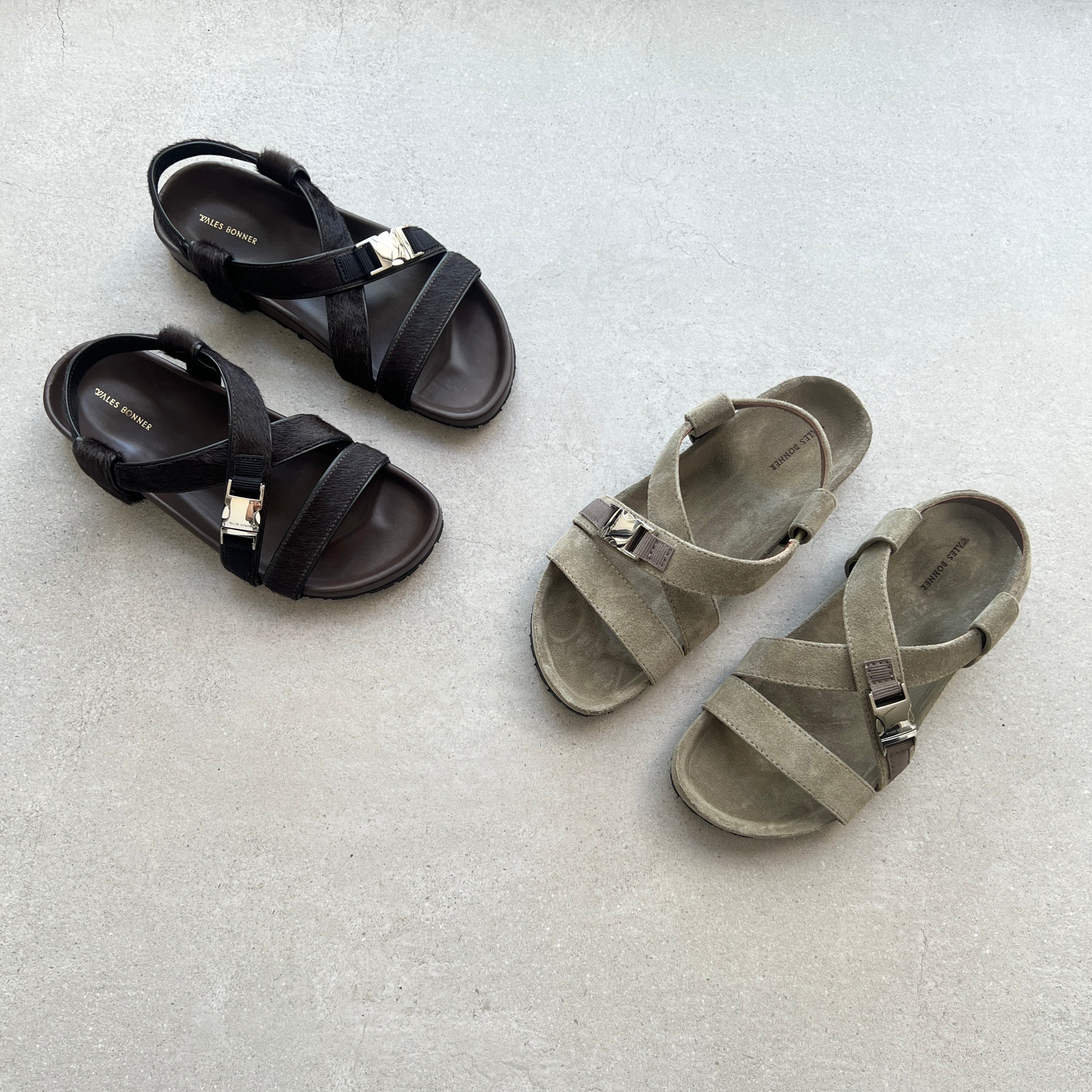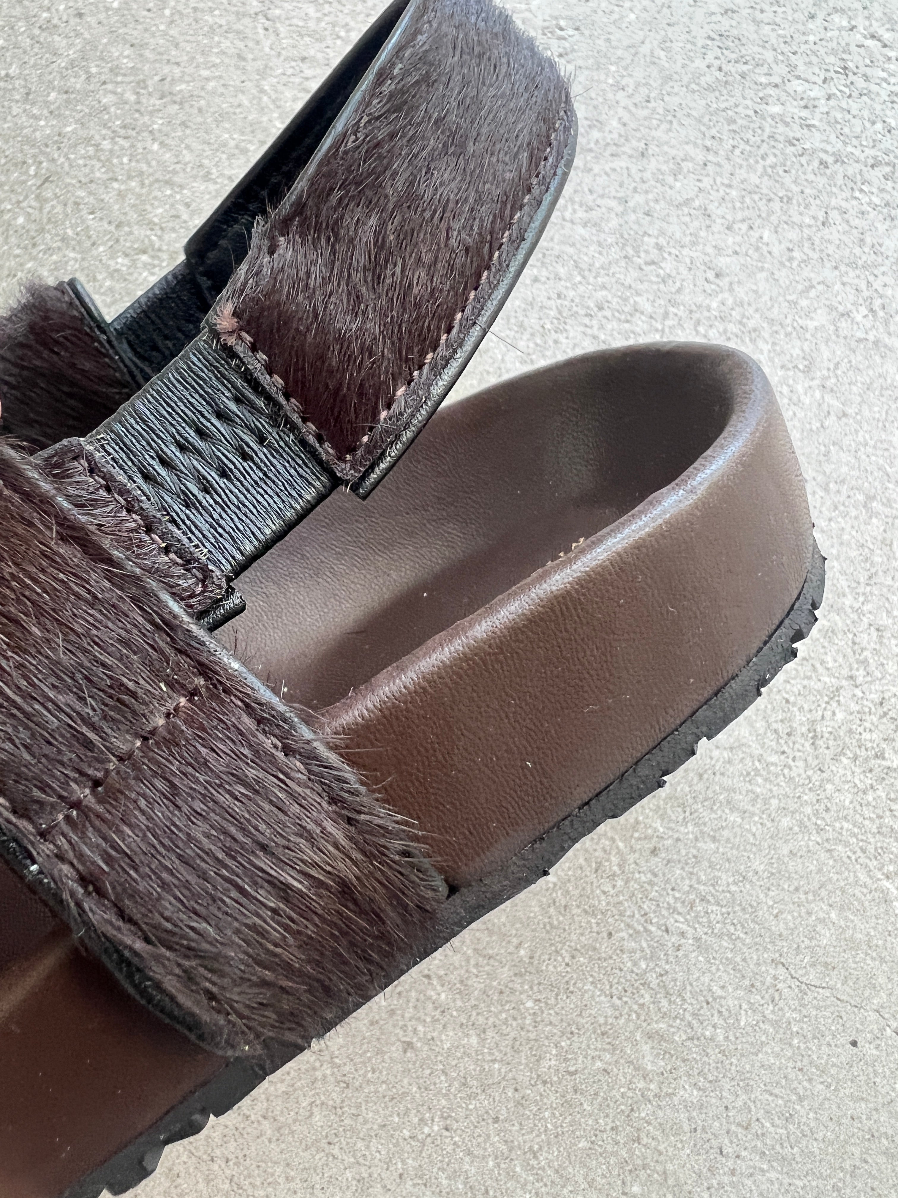 The Promise Sandal in dark brown calf fur leather features a metal buckle closure and a padded leather sole embossed with the Wales Bonner logo.