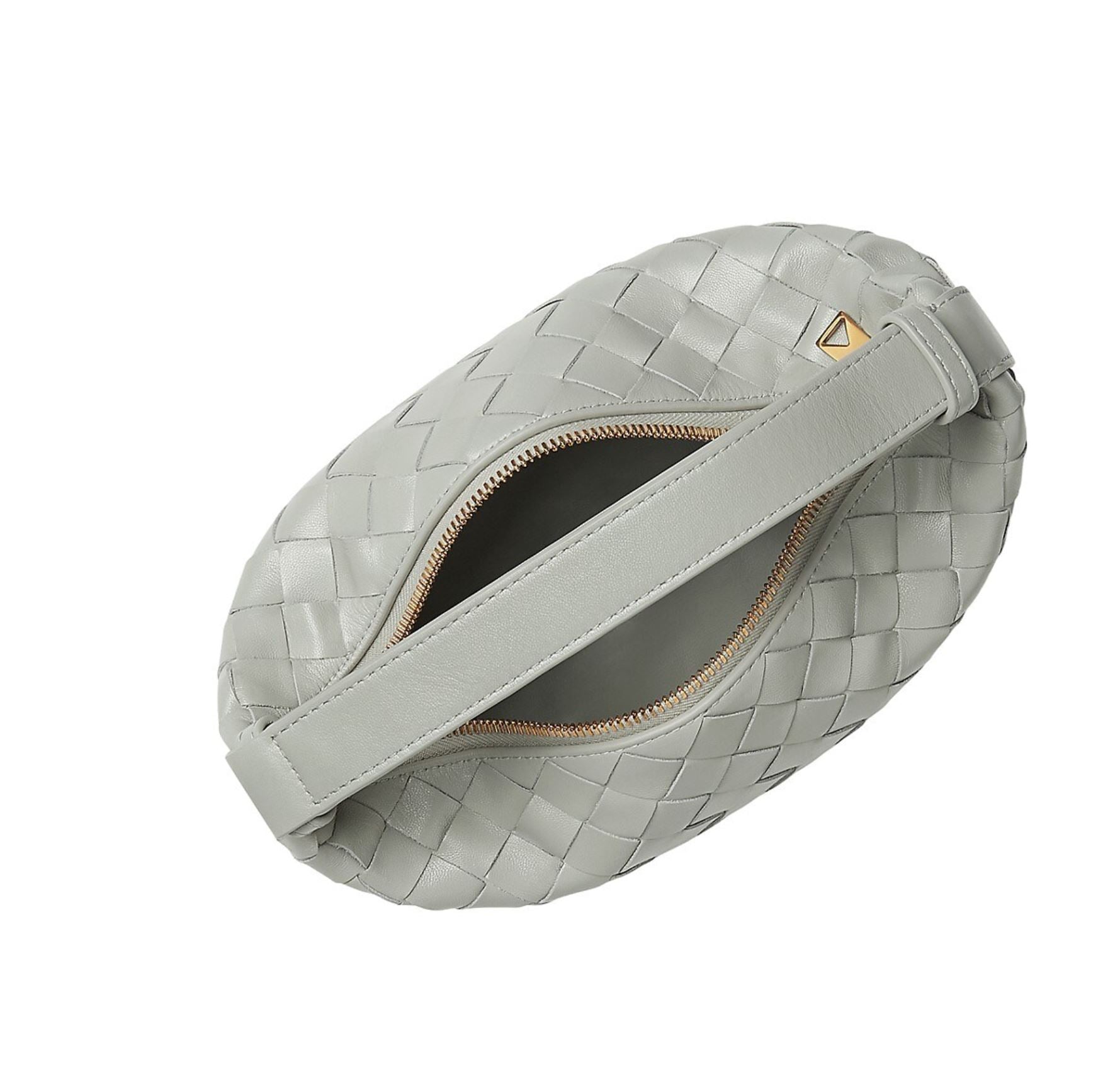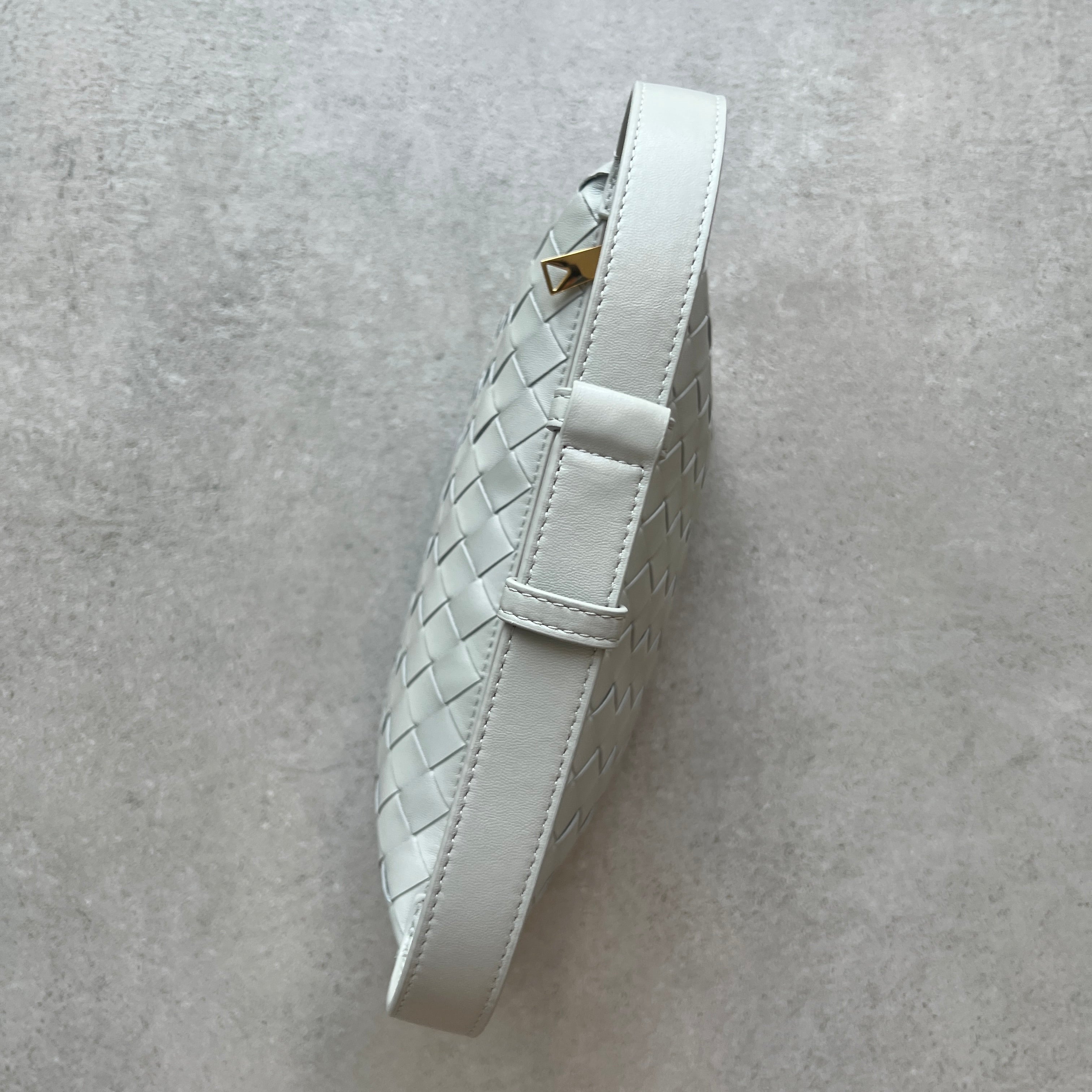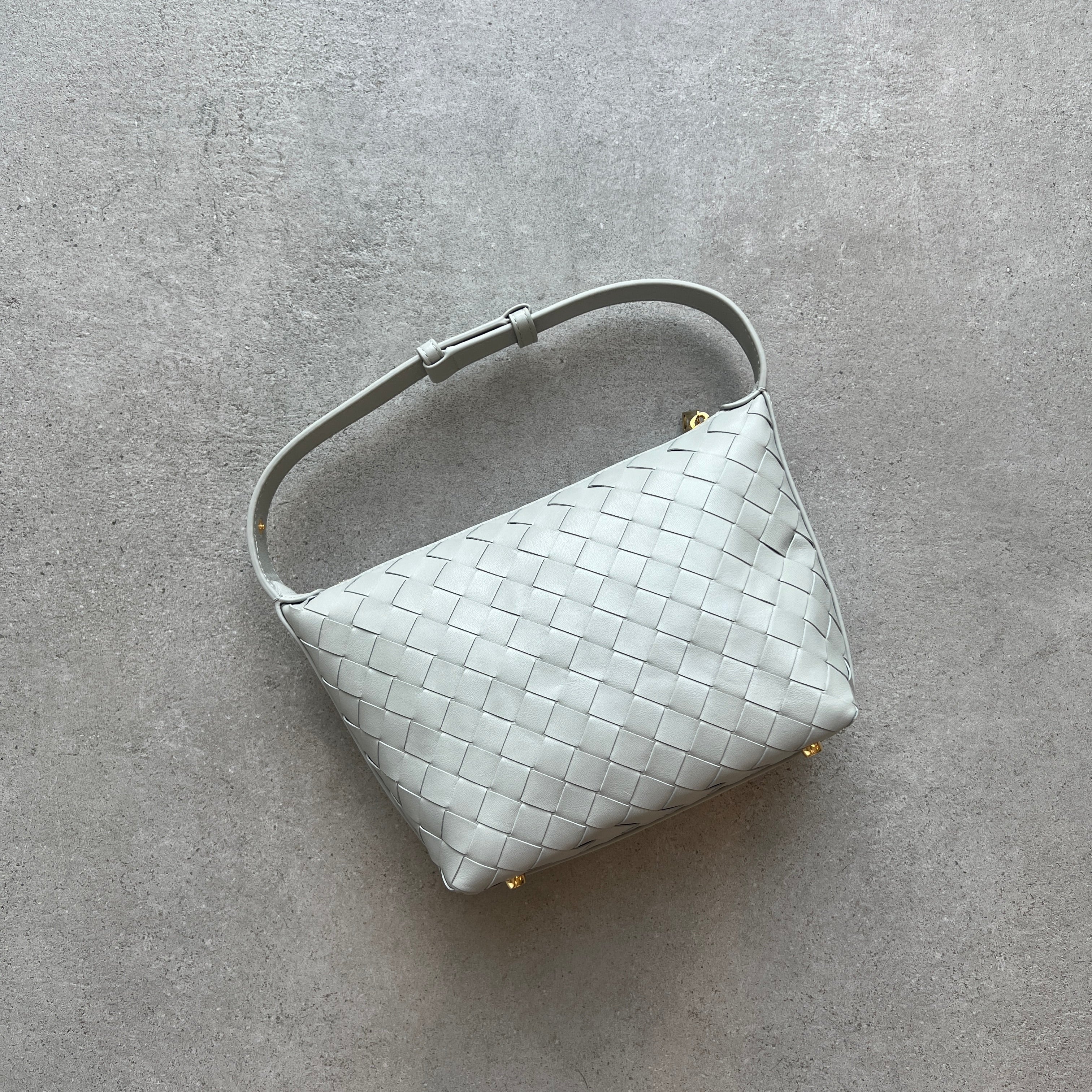 Shoulder bag realised with Intrecciato craftsmanship in soft calfskin leather. Leather shoulder strap features an adjustable press stud.