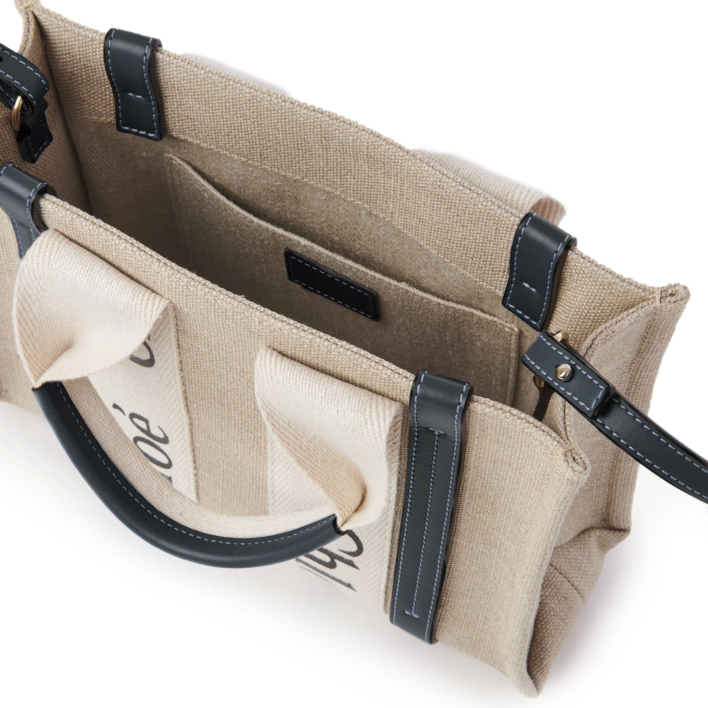 Crafted from Linen canvas detailed with shiny calfskin strips, this small Woody tote bag is a compact bag with a long, removable strap and a strong summer attitude. The roomy inside compartment includes a practical flat pocket.