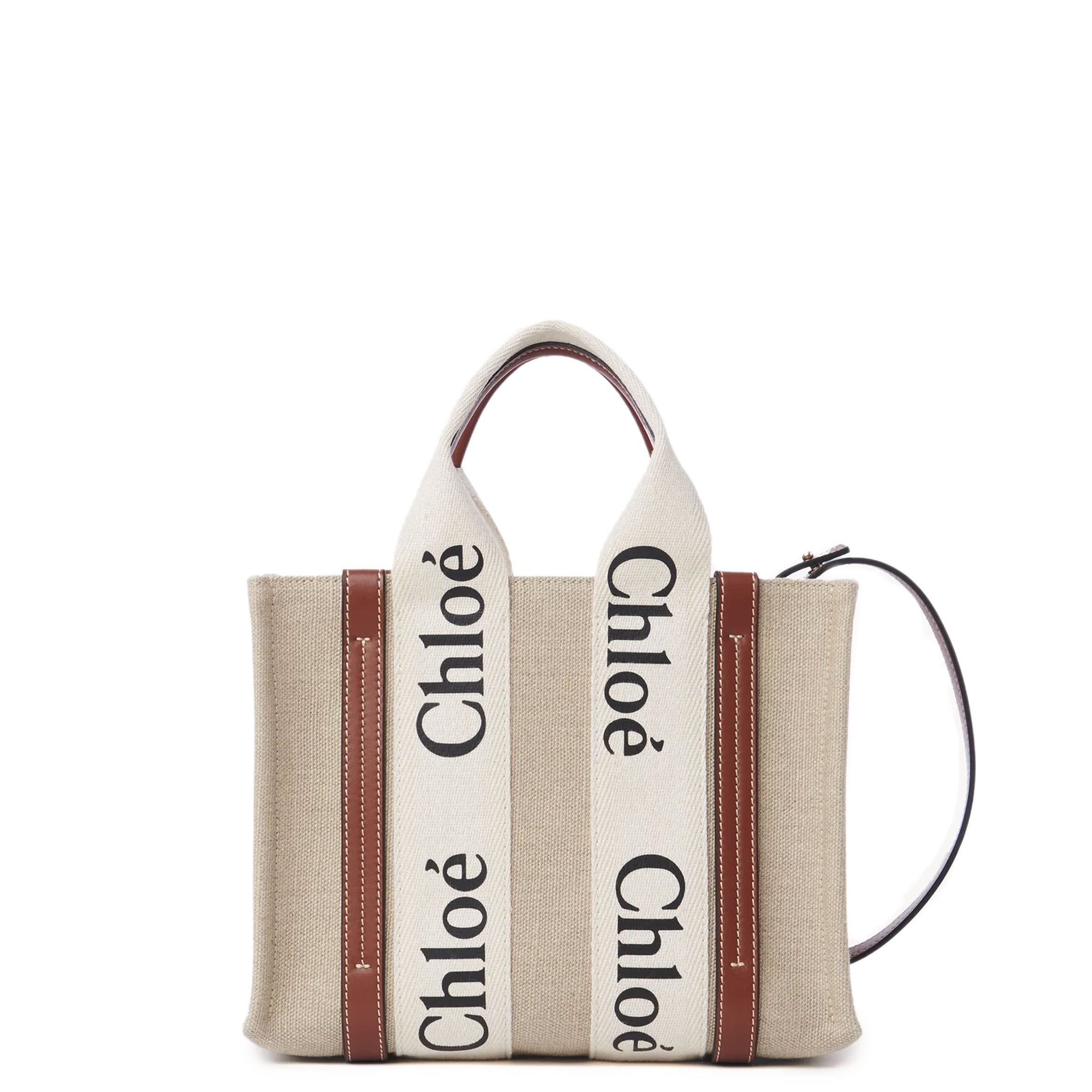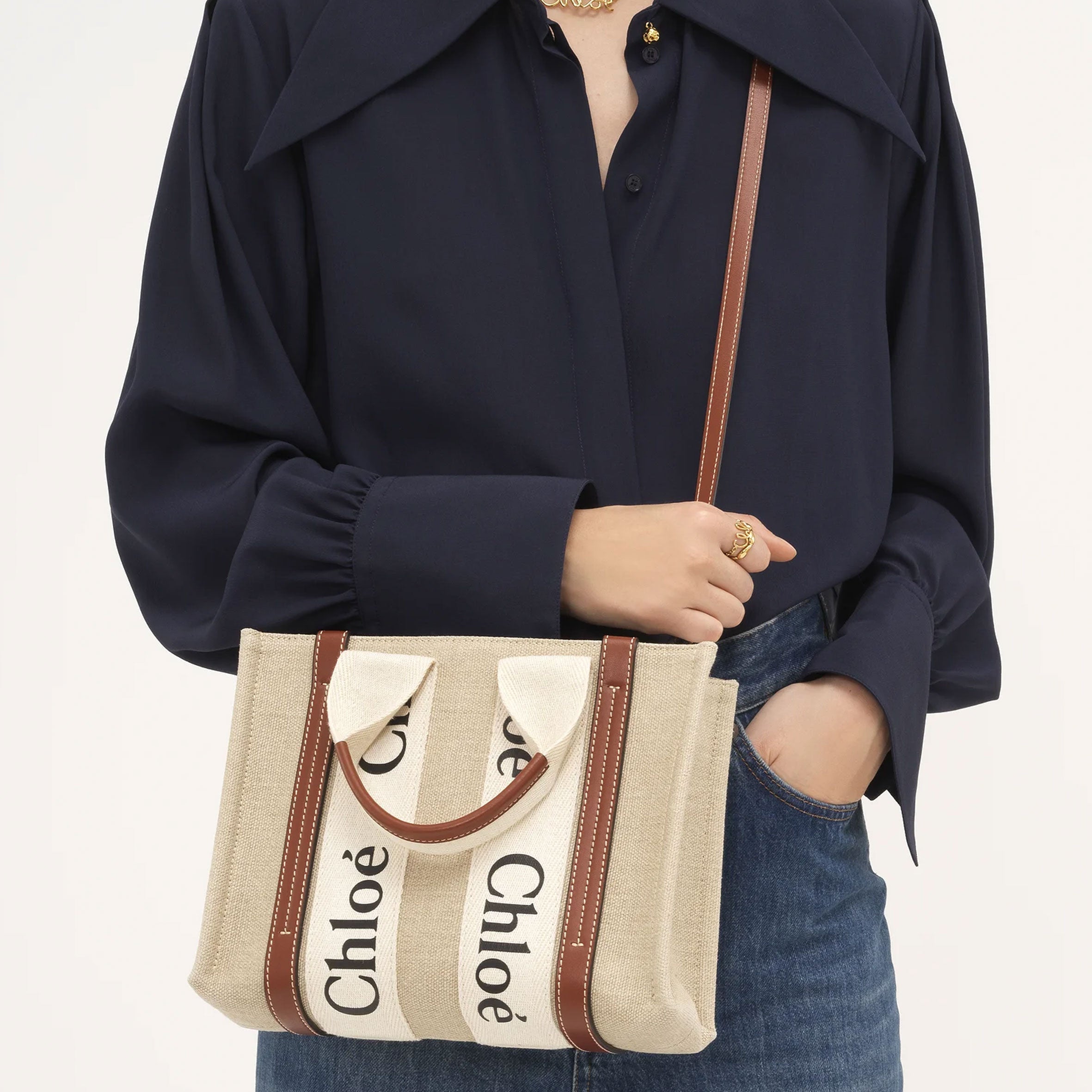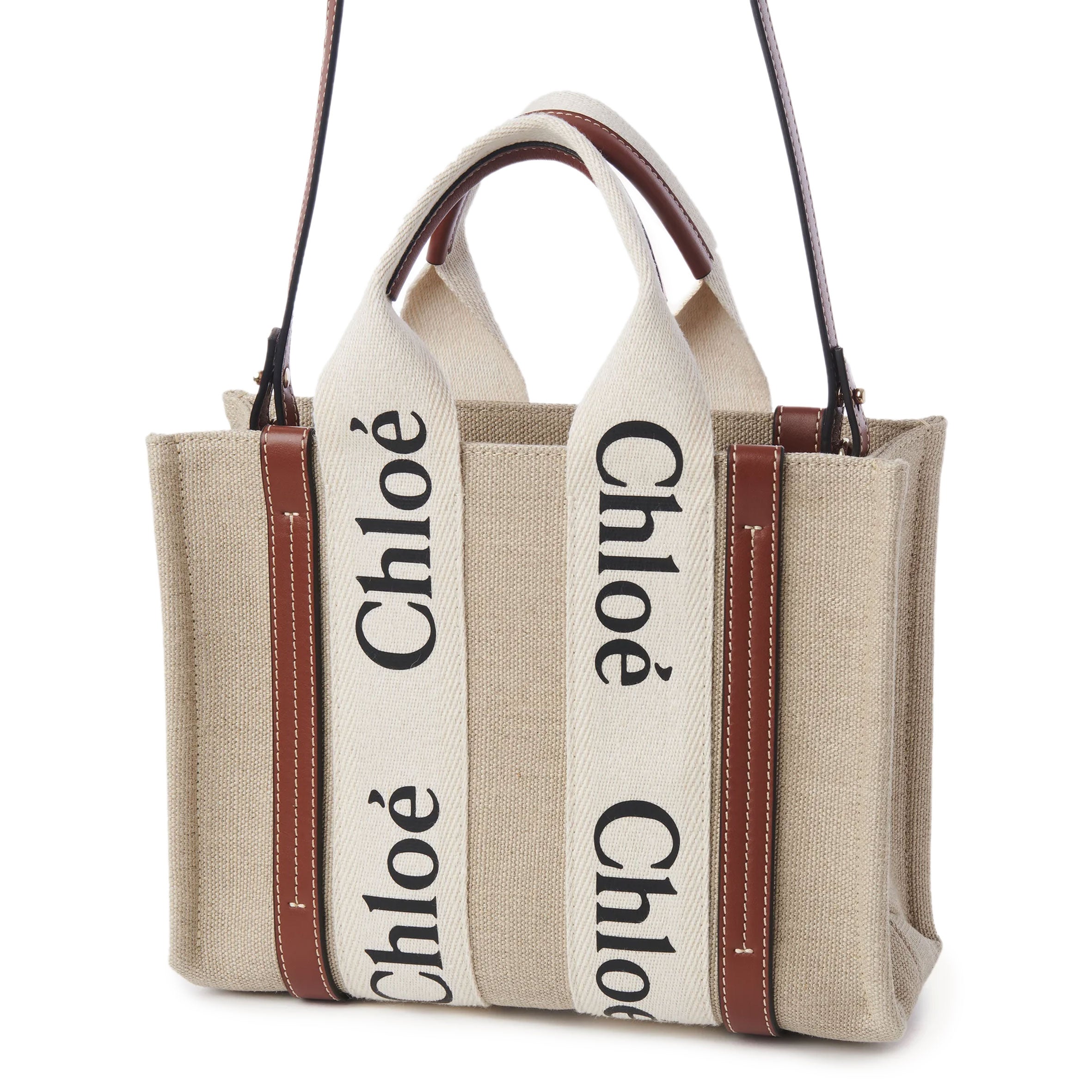 The bag's sharp, modern lines are emphasized by the contrasting vertical leather strips and the signature Chloé logo ribbon carried over from the Maison's Woody mule. Carry this tote bag comfortably on the shoulder
