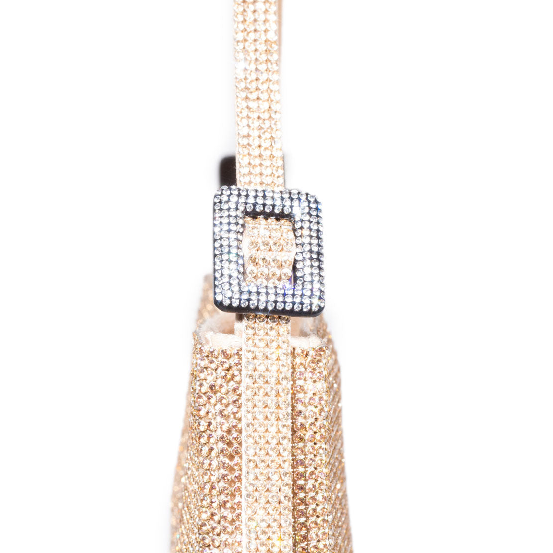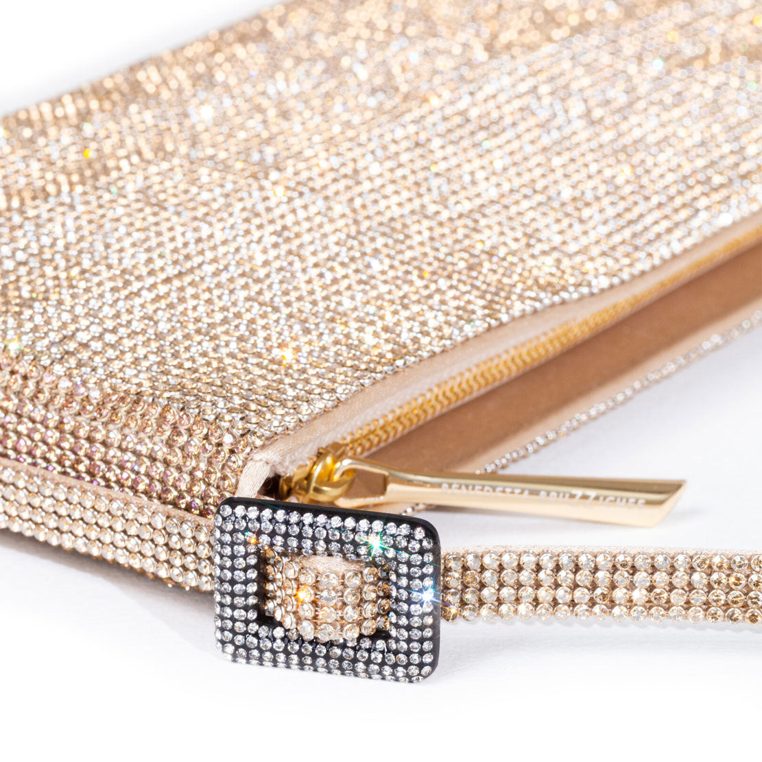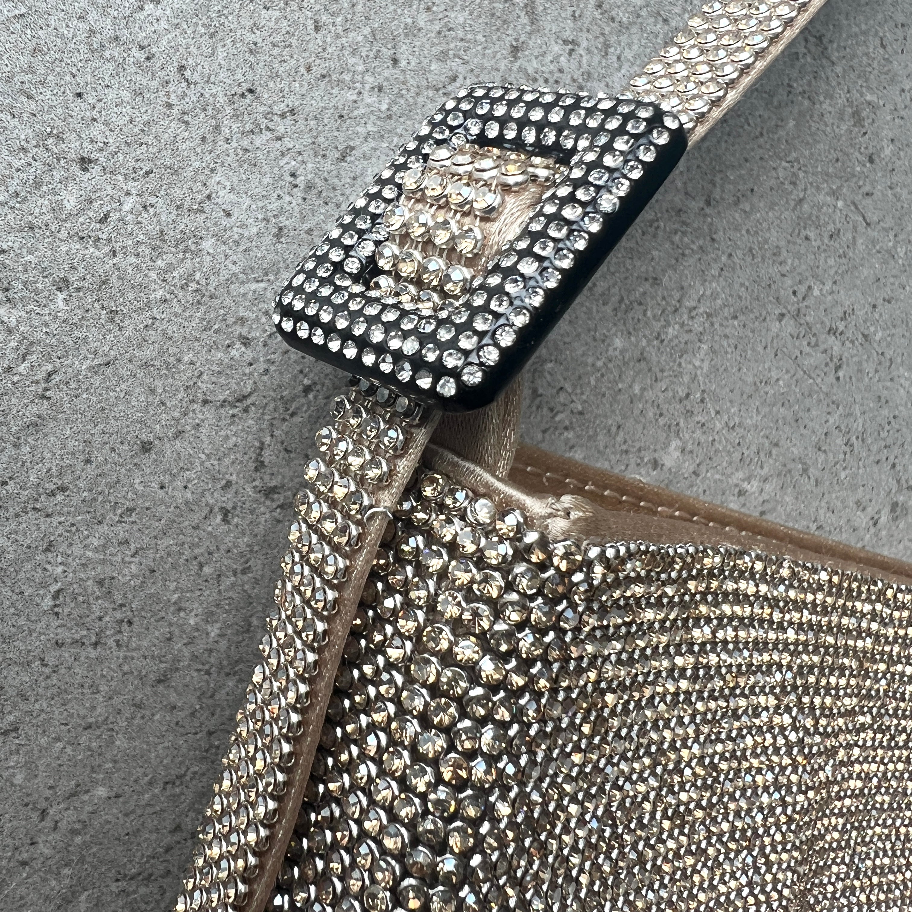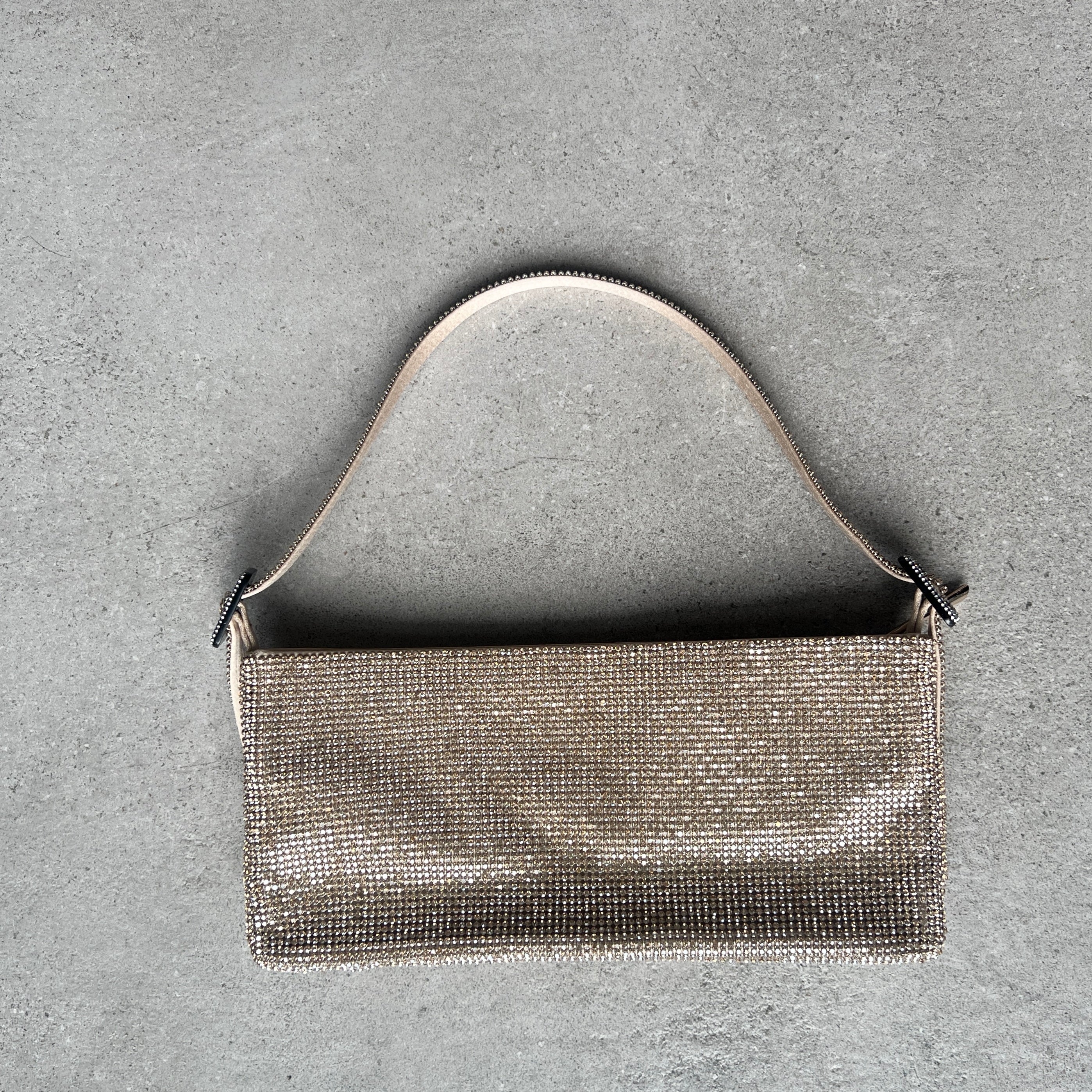 Designed to keep only what is really important, this bag is a mini clutch made with a soft net of crystals lined with denim, entirely hand-sewn.