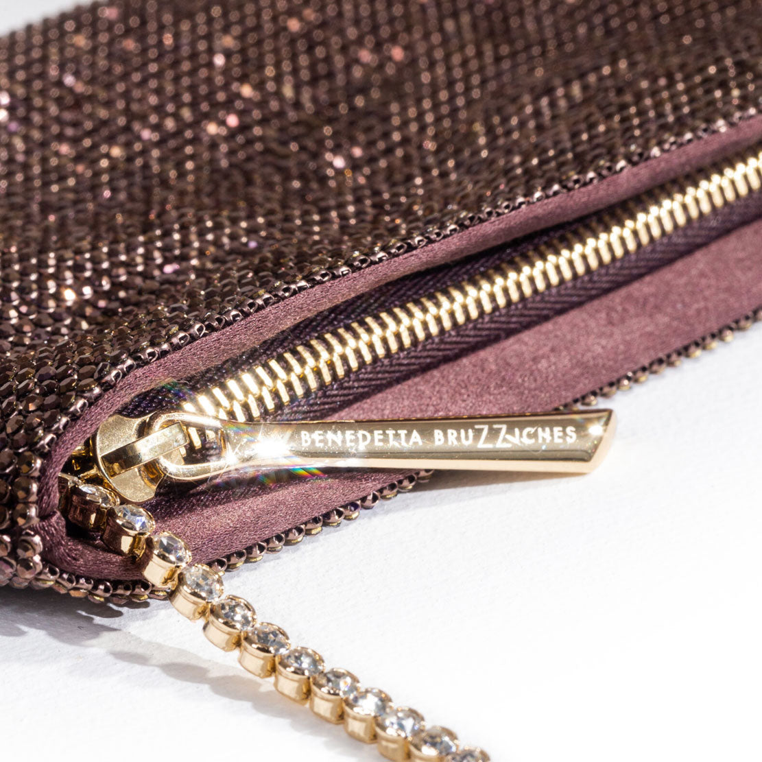 External: 100% Aluminium mesh studded with crystal rhinestones