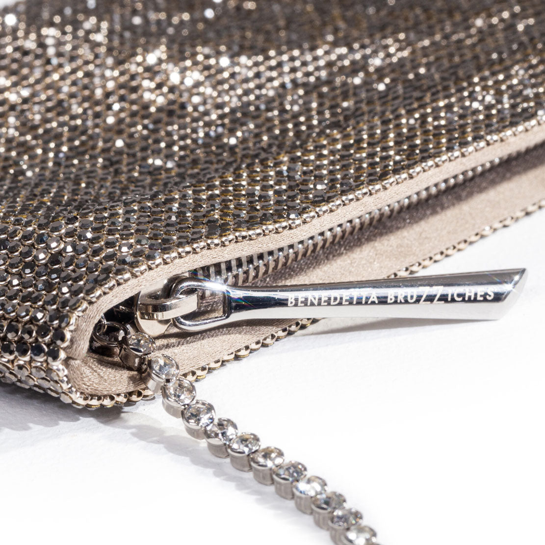 Designed to keep only what is really important, this bag is a mini clutch made with a soft net of crystals lined with denim, entirely hand-sewn. An elegant crystal shoulder strap allows you to wear it on the shoulder.