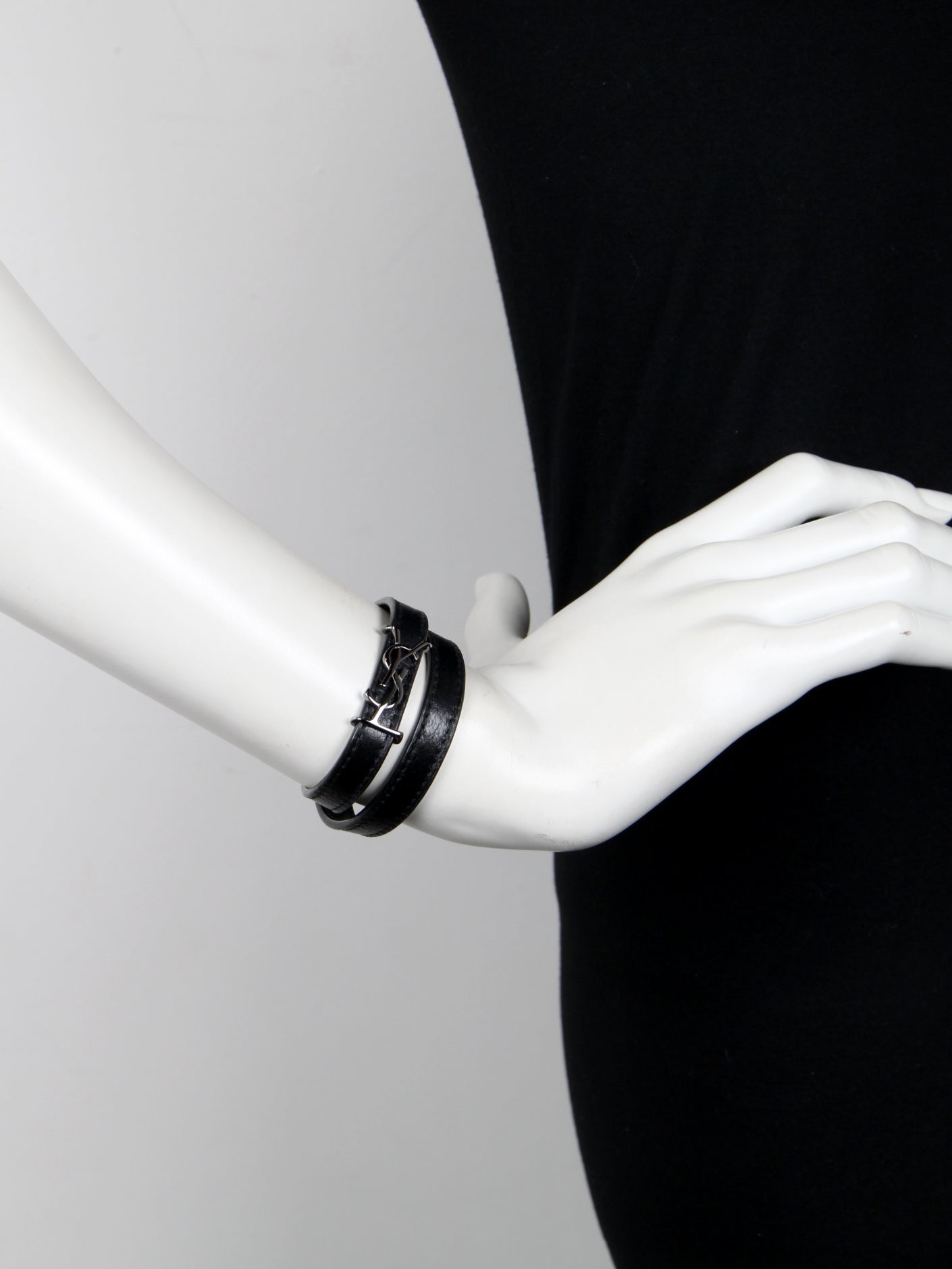Saint Laurent double wrap around leather bracelet with YSL interlocking signature at centre with Saint Laurent engraved square clip clasp.