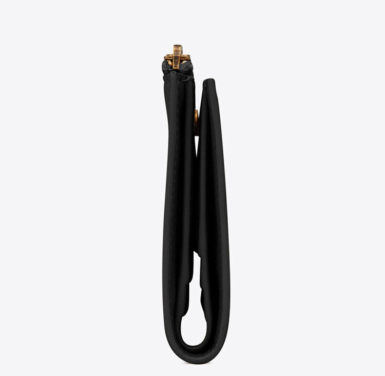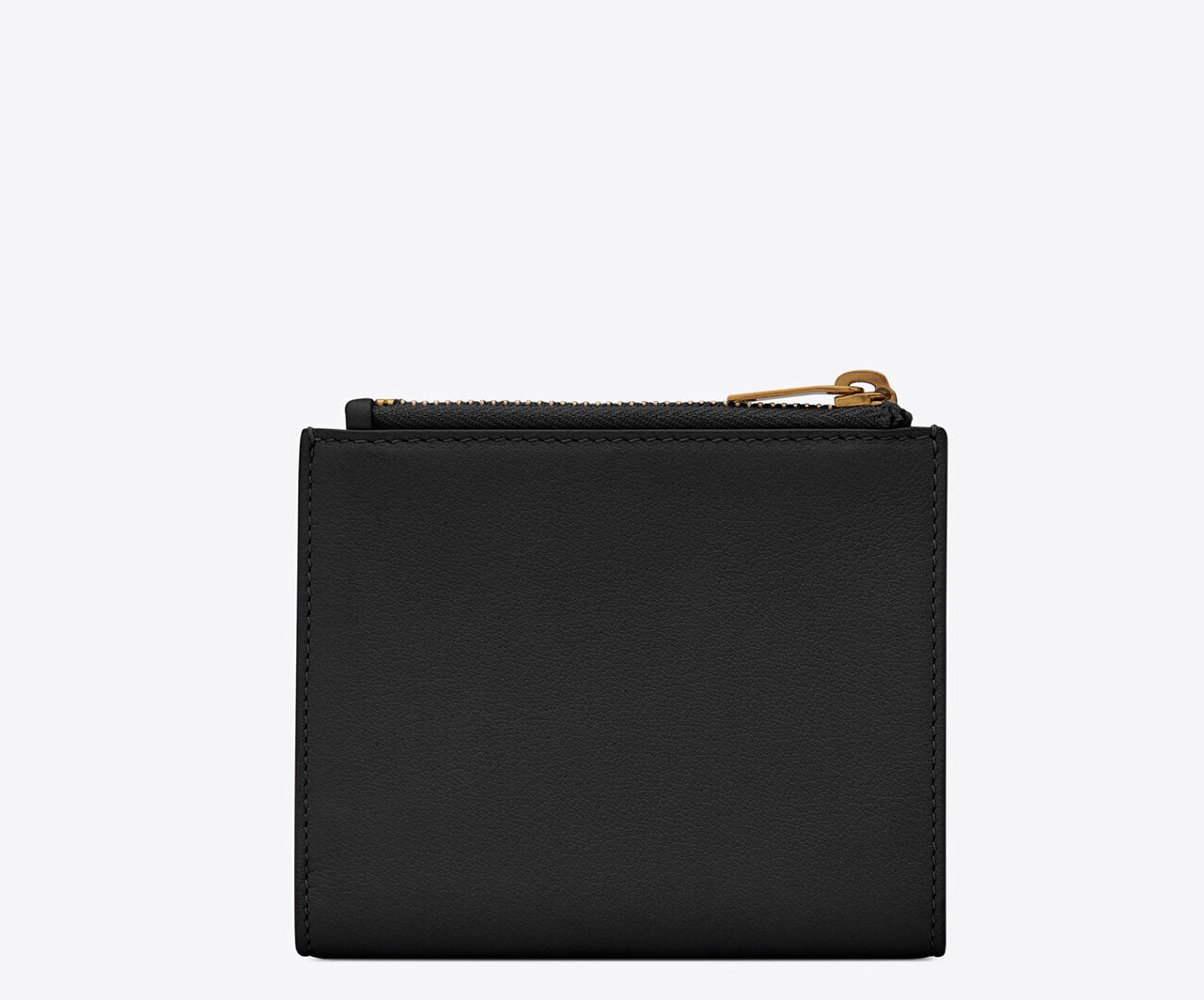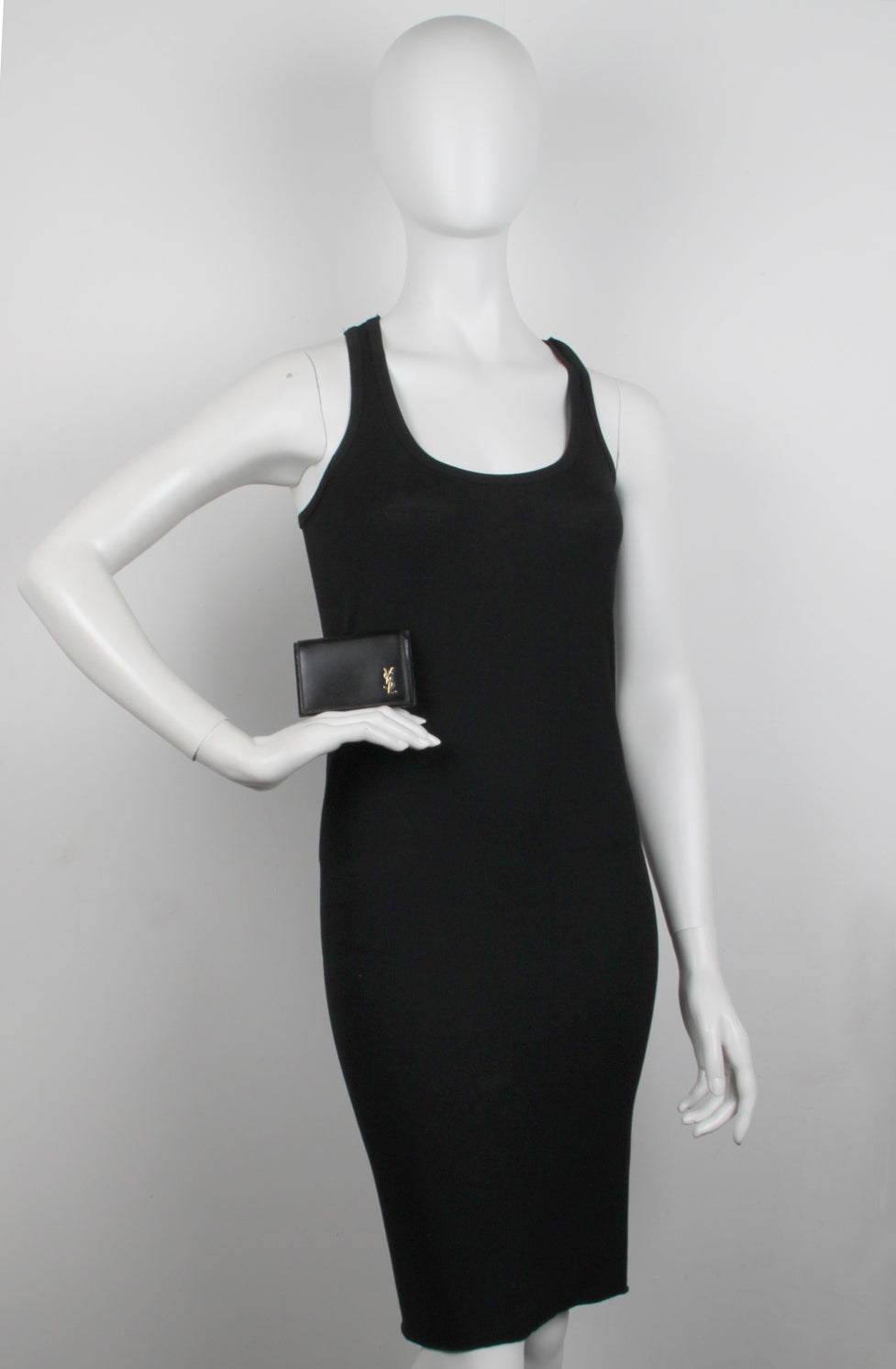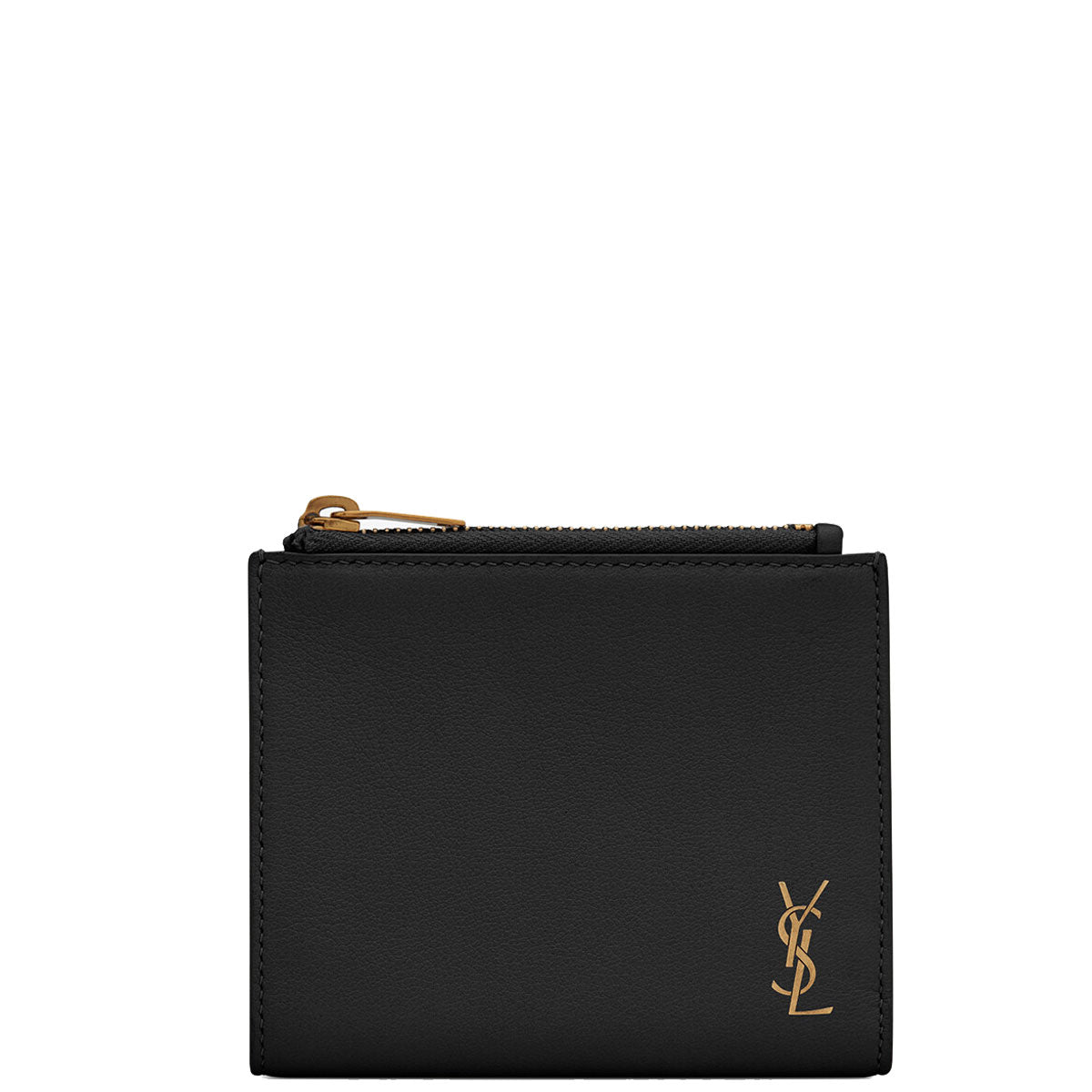 Saint Laurent monogram card case in grained calfskin decorated with tiny metal YSL initials. Features one bill compartment, two card slots, one mesh ID slot and two receipt compartments. External zip coin compartment.