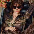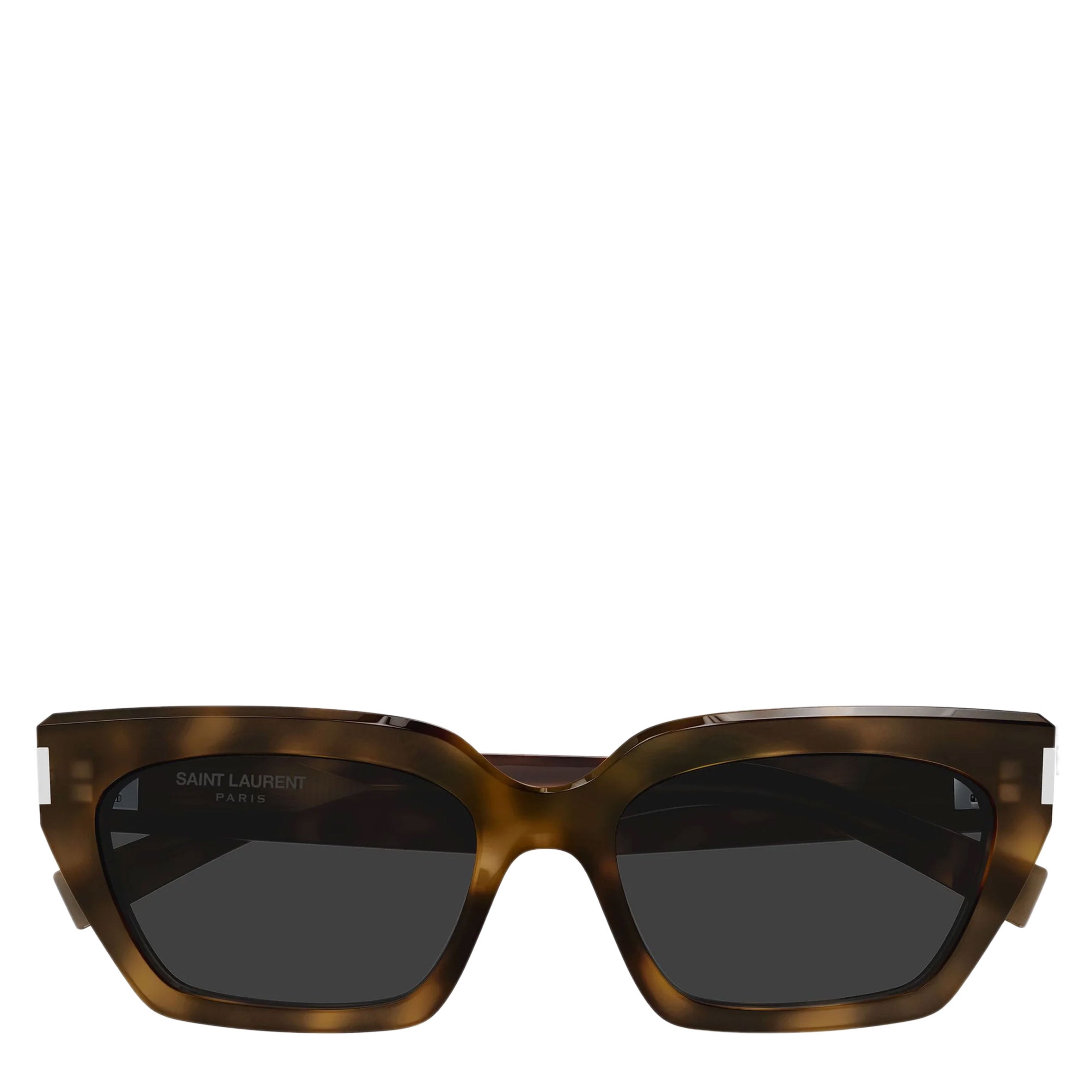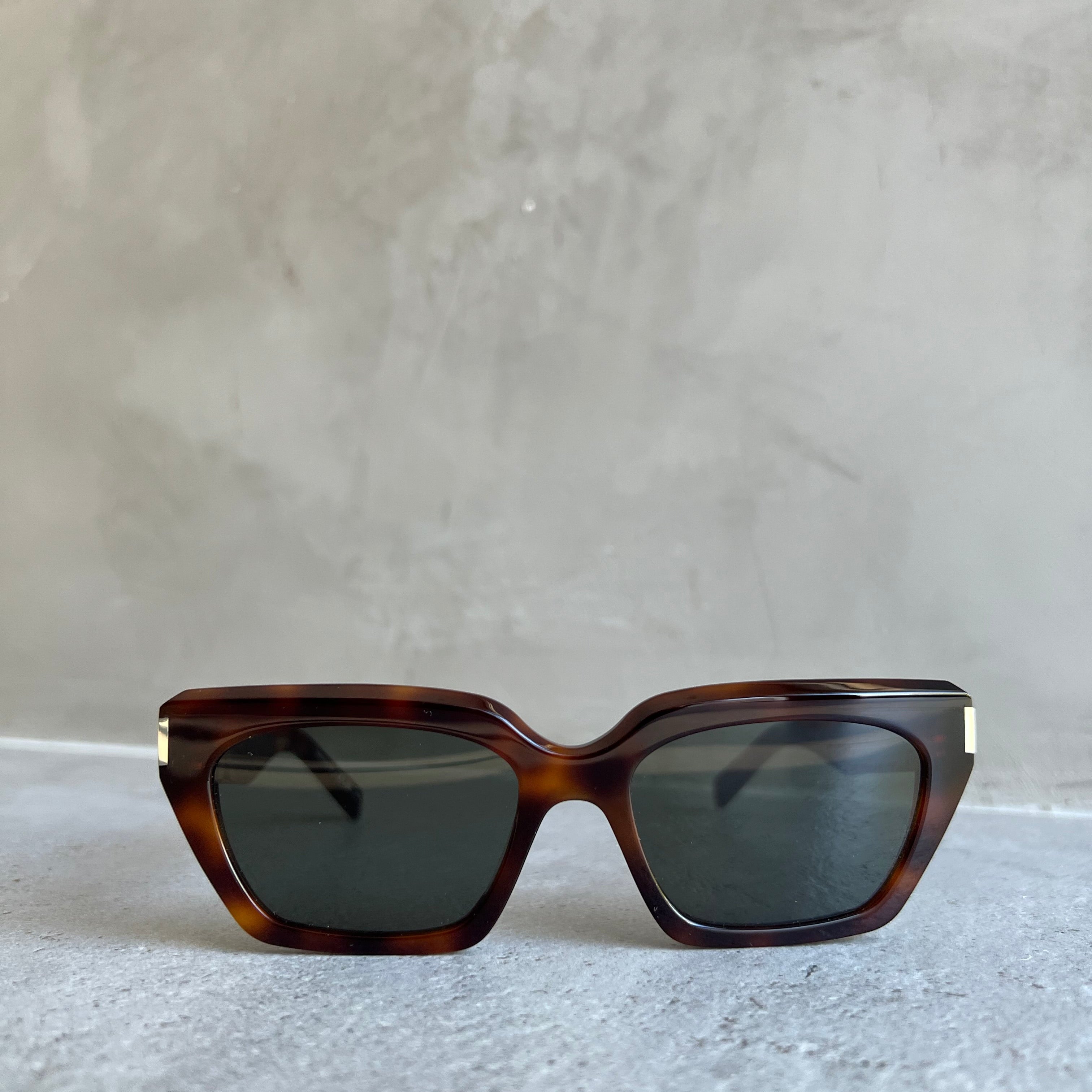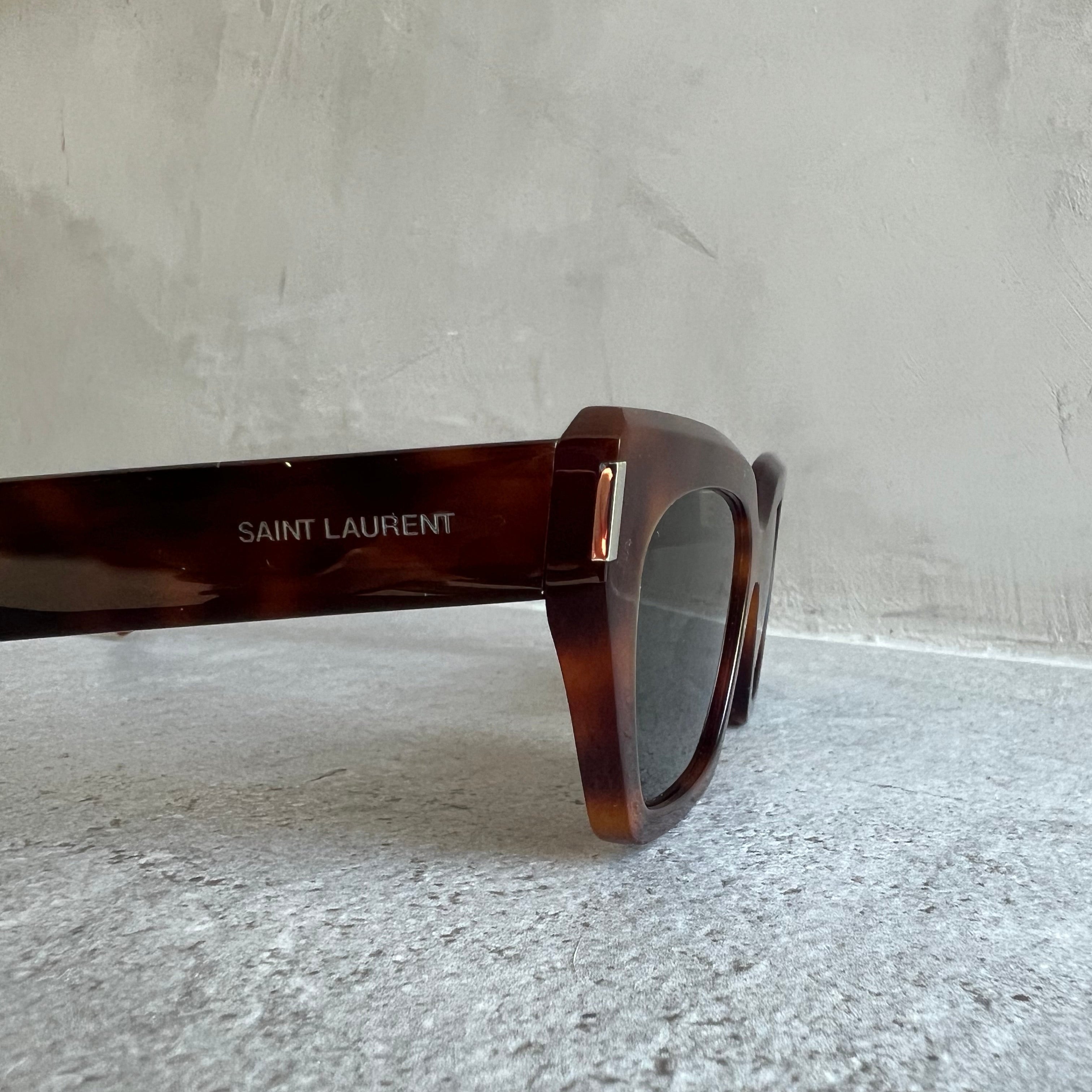 Saint Laurent SL 826 PAGE 002 sunglasses for women, featuring shiny medium havana cat eye recycled acetate frame and solid grey bio nylon lenses.