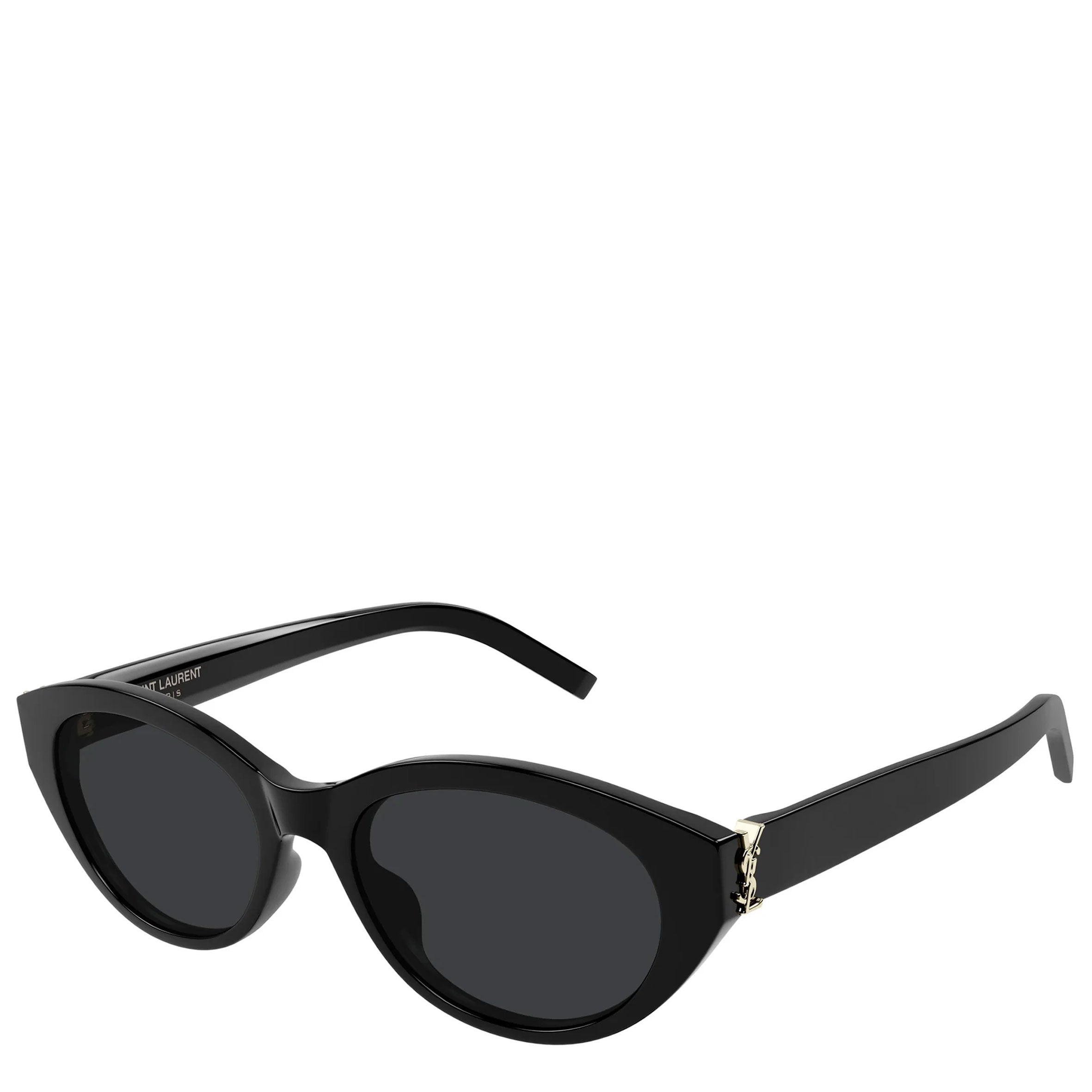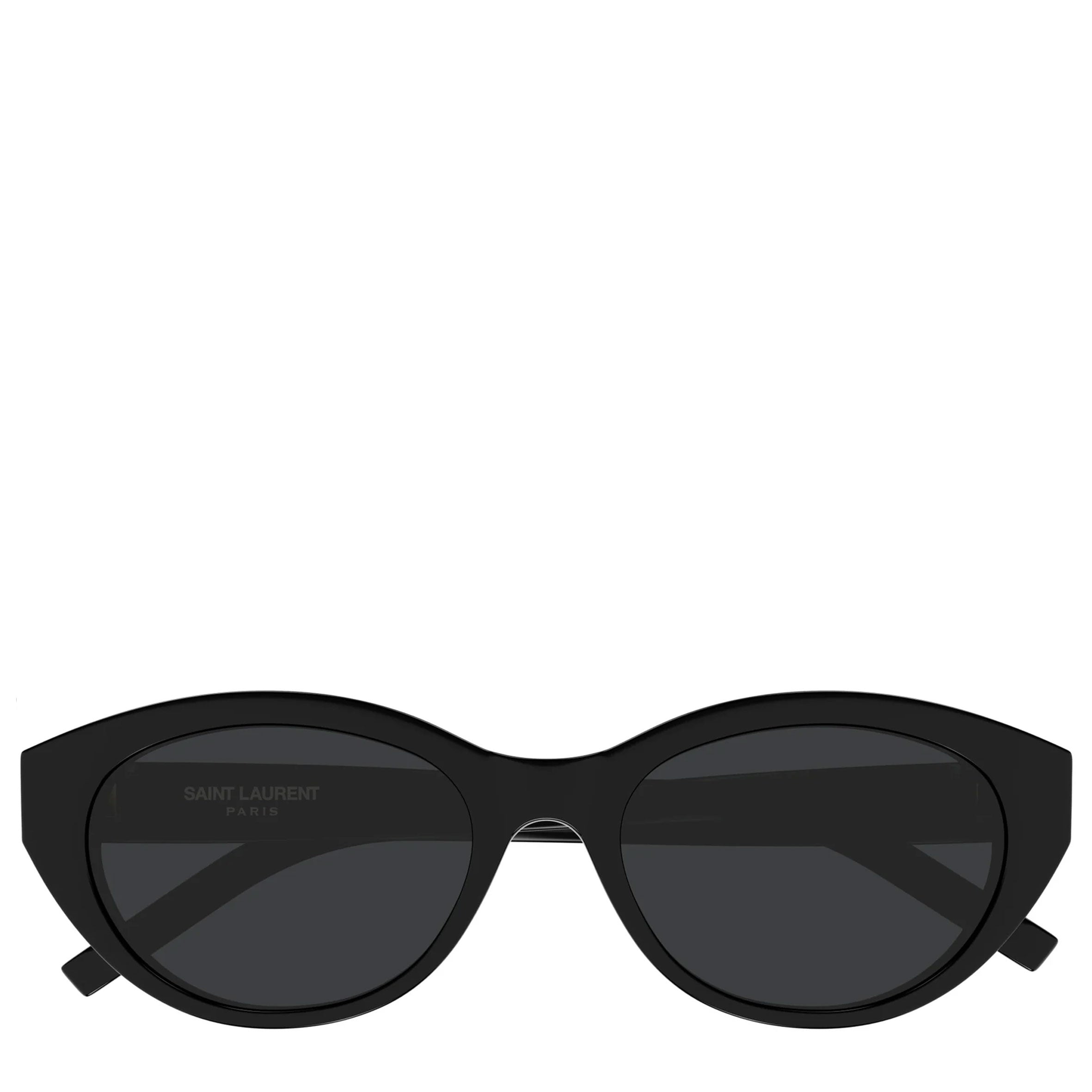 Saint Laurent SL M148 001 sunglasses for women, featuring shiny solid black oval recycled acetate frame and solid black bio nylon lenses. Cassandre Logo on temples.