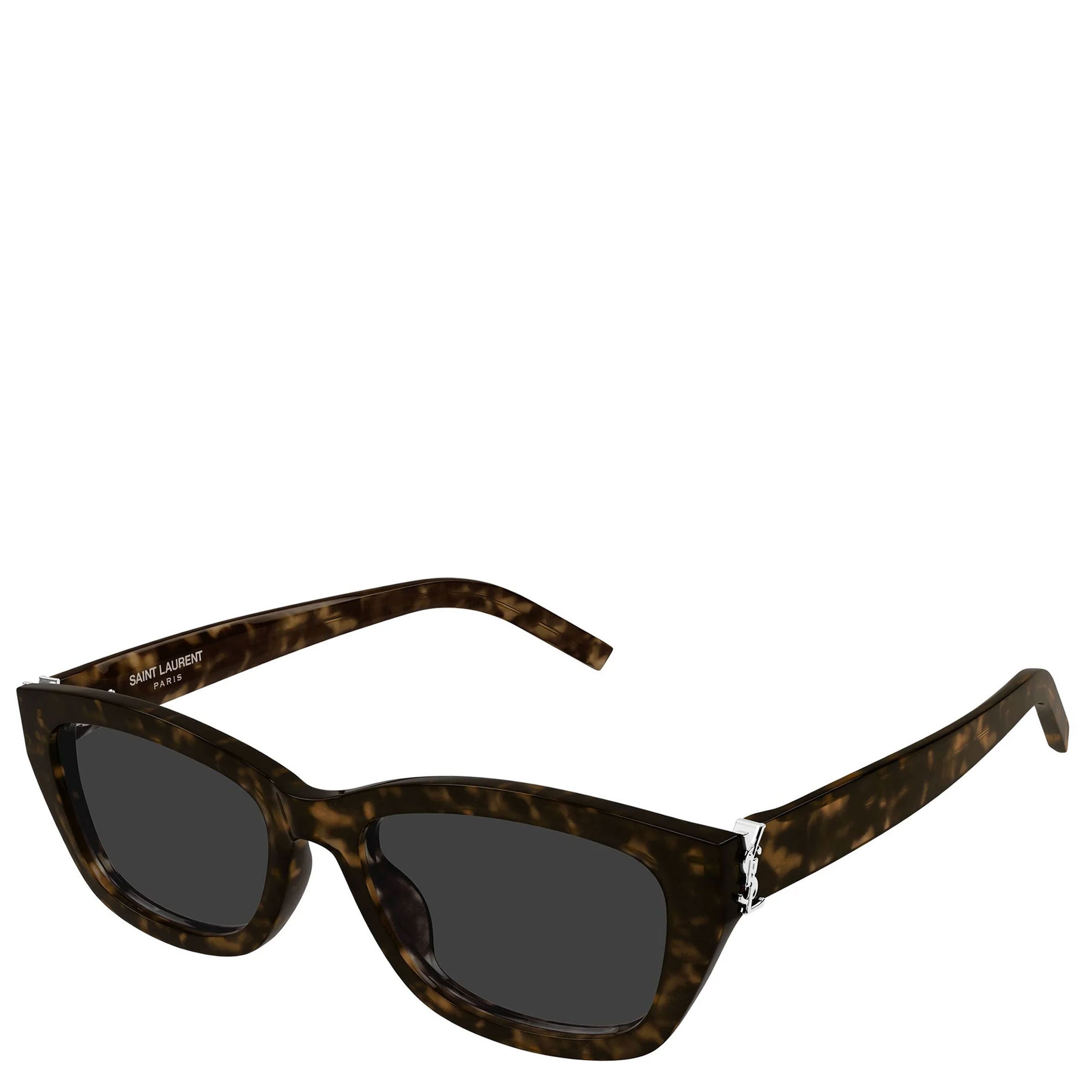 Saint Laurent SL M153 002 sunglasses for women, featuring shiny medium havana rectangular recycled acetate frame and solid grey bio nylon lenses. Cassandre Logo on temples.