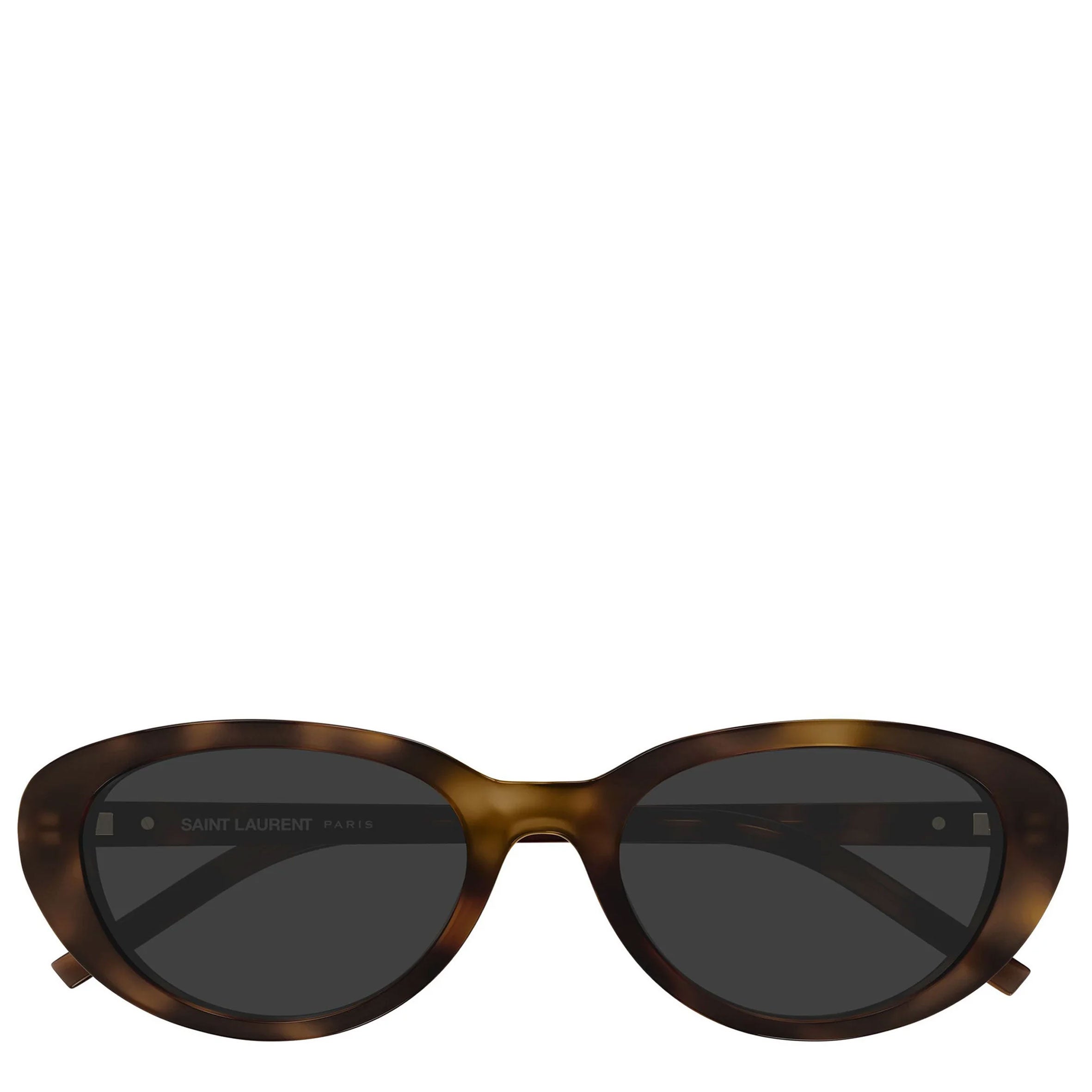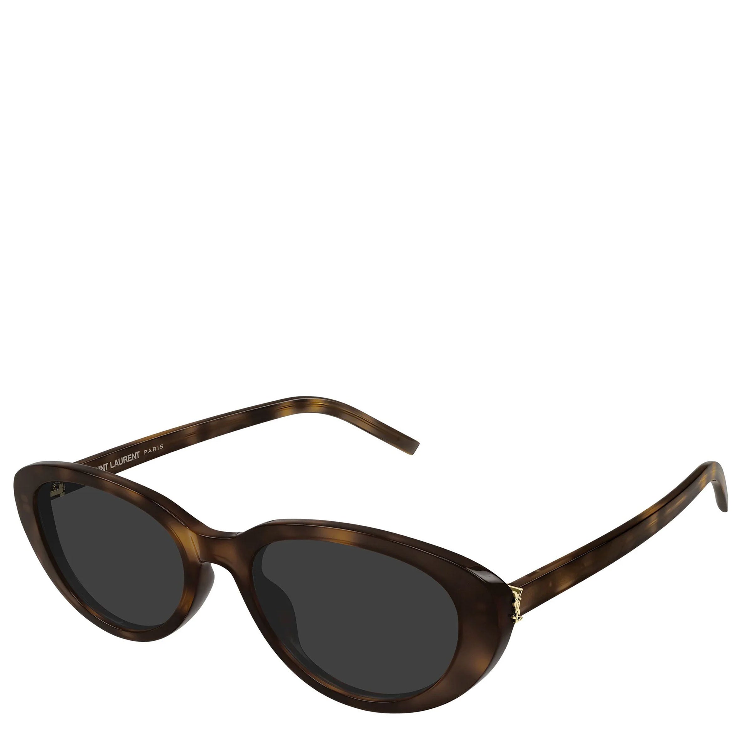 Saint Laurent SL M154 003 sunglasses for women, featuring shiny medium havana oval recycled acetate frame and solid grey bio nylon lenses. Cassandre Logo on temples.