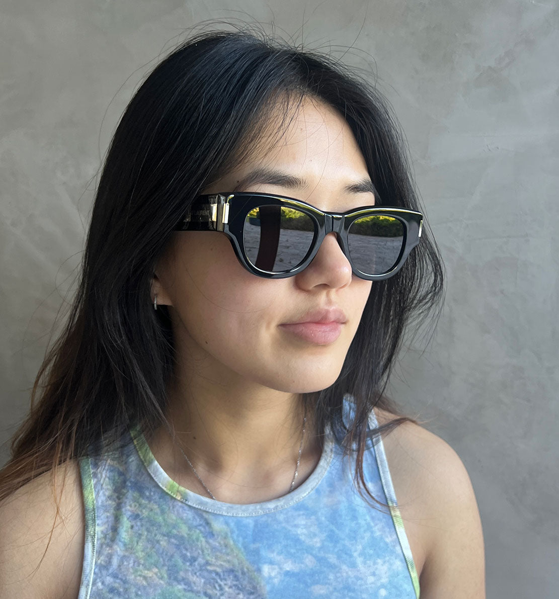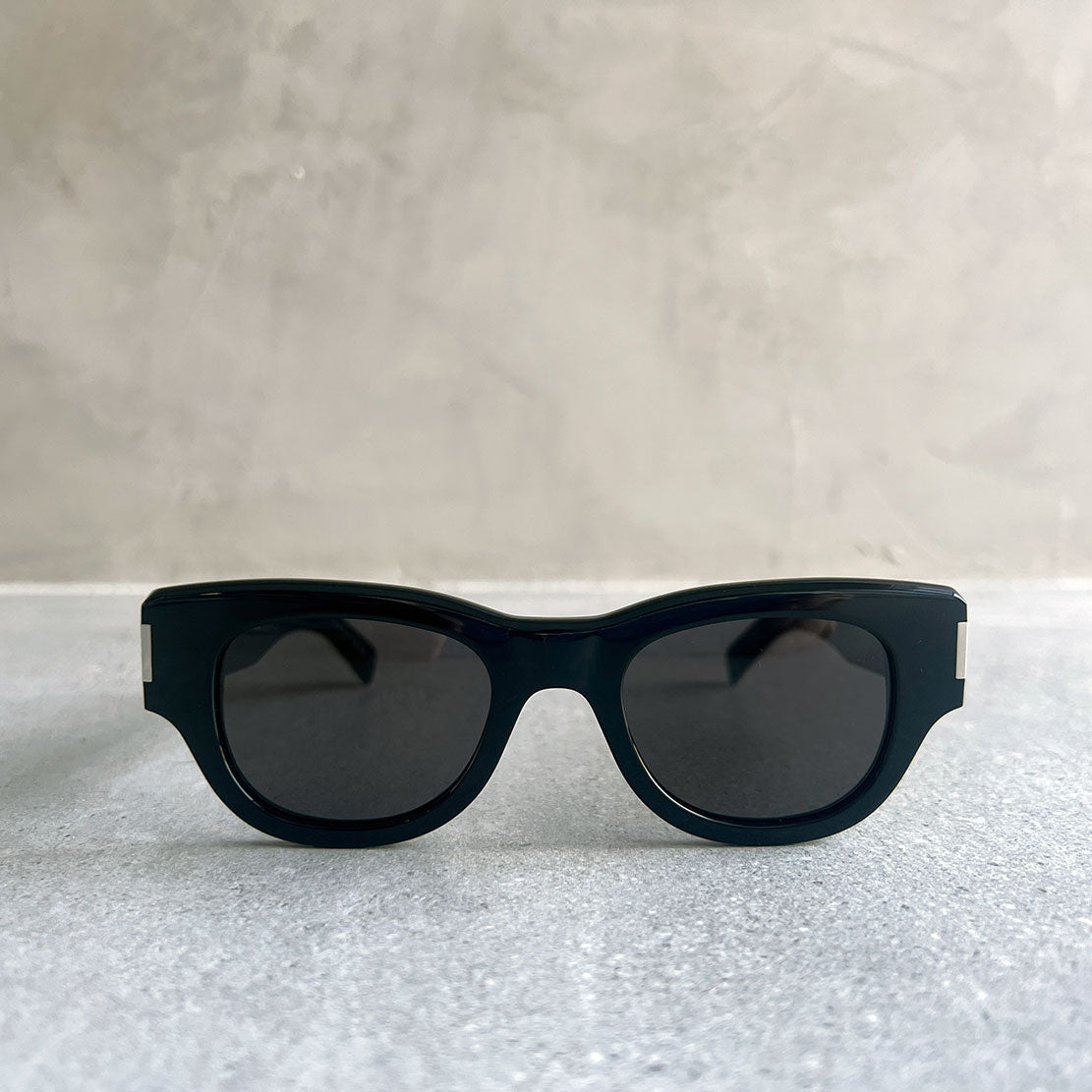 A new season oversized cat-eye inspired acetate frame style from Saint Laurent. Crafted in a black acetate, this style features grey tinted lenses, naked wirecore arms and lasered Saint Laurent logo.