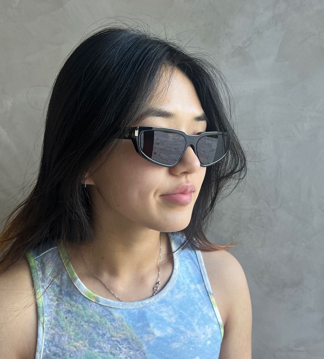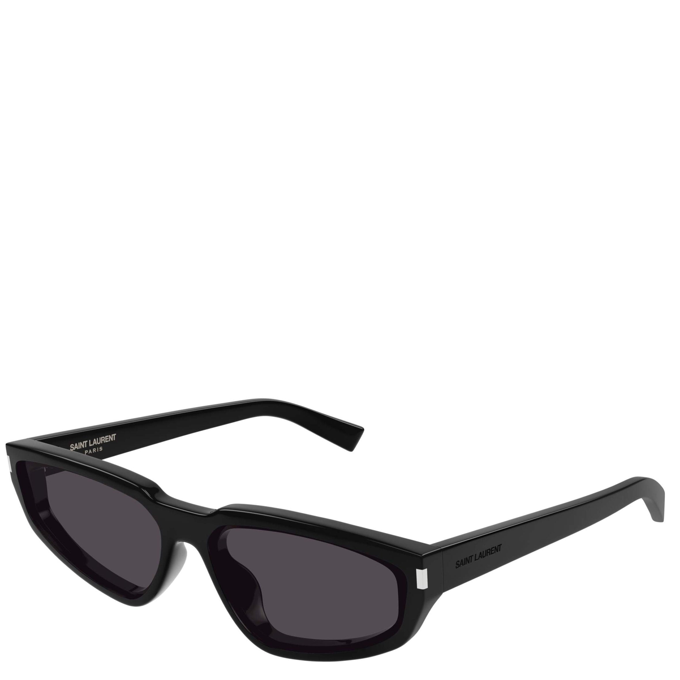 A narrow cat-eye shape with iconic Saint Laurent corner angle and lenses aligned to the acetate front. The Saint Laurent logo is laser engraved on both temples.